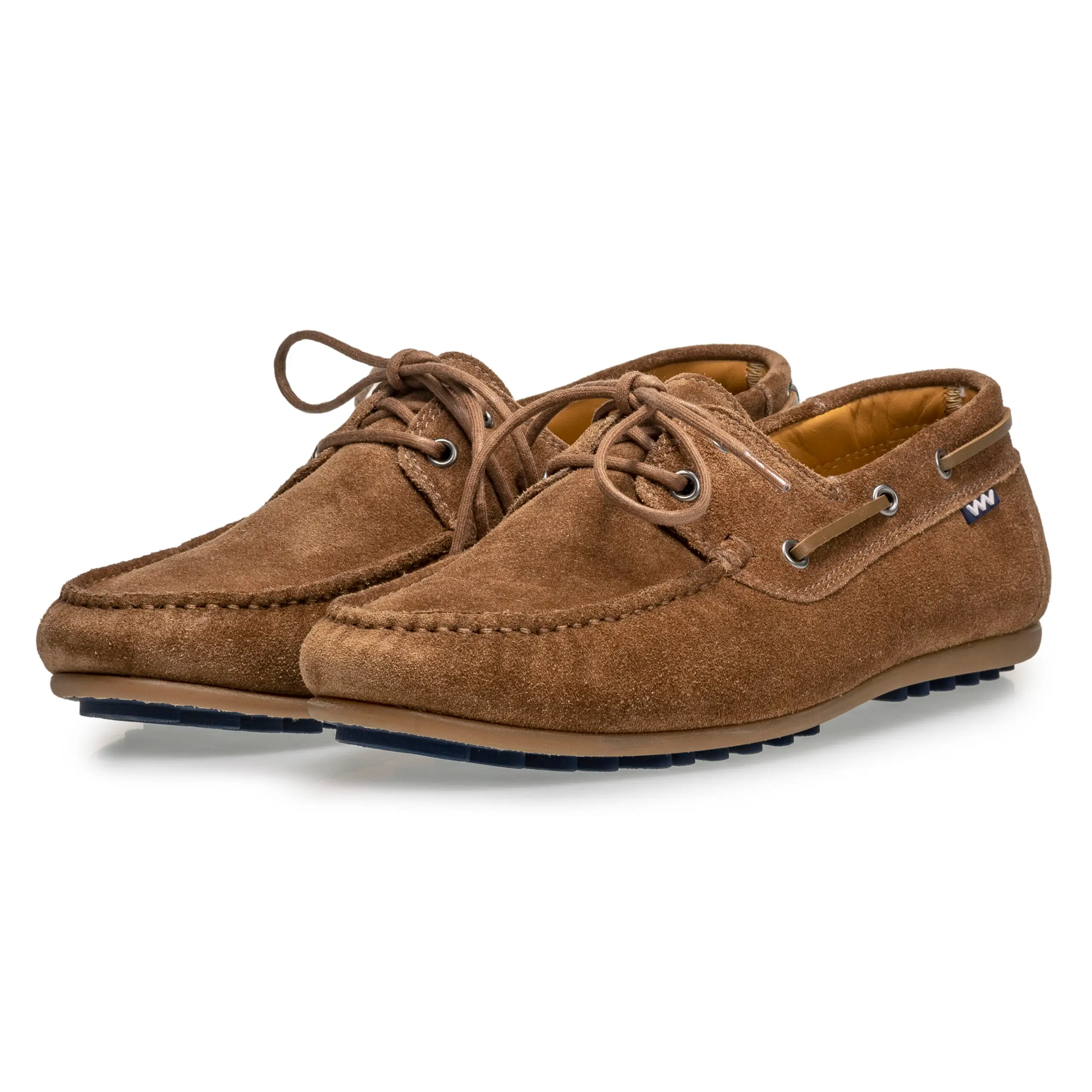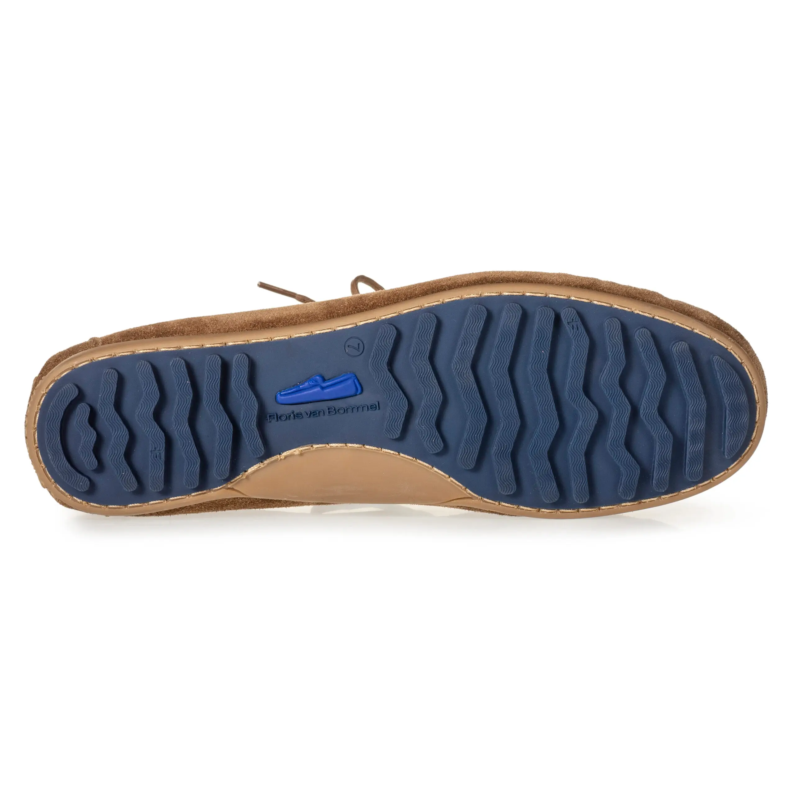 Deze schoen is gemaakt volgens de Mocassin maakwijze. Dit betekent dat het leer van de schoen onder de voet doorloopt. De schoen zit zo als een soort sok om de voet heen. De Mocassin maakwijze staat bekend om zijn soepele karakter en de authentieke look van het met de hand aangebrachte stiksel op de voorvoet. De TPU zool is op het loopvlak voorzien van een prettig antislip profiel. De schoen is volledig gevoerd met kalfsleer en is voorzien van een comfortabel, volledig uitneembaar, voetbed. Deze variant is uitgevoerd in een cognac suède dat gelooid is in een gespecialiseerde Toscaanse suède looijerij.