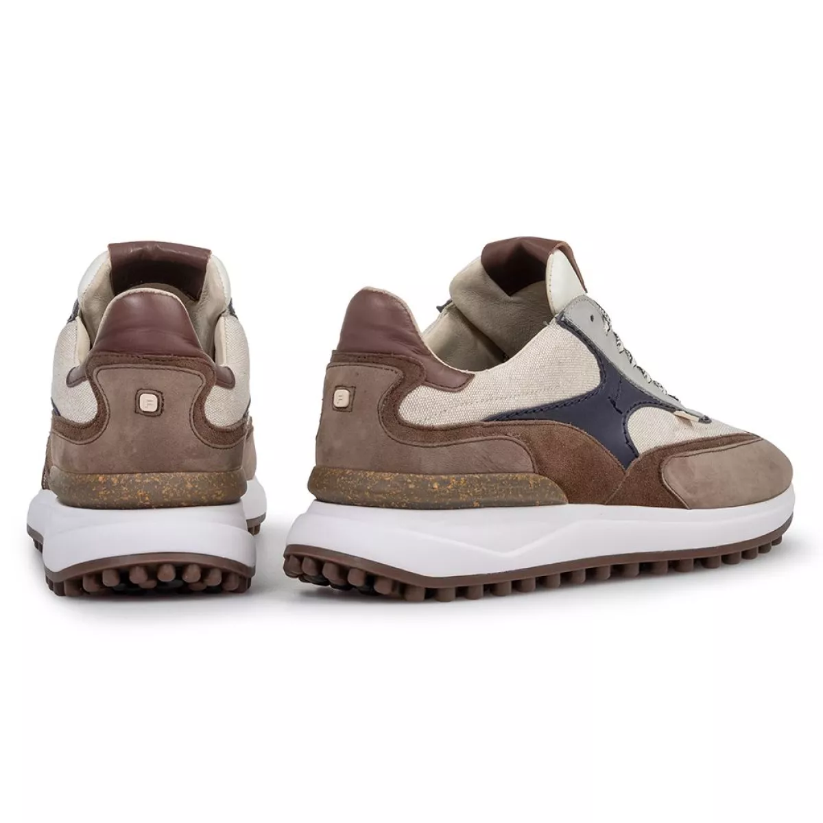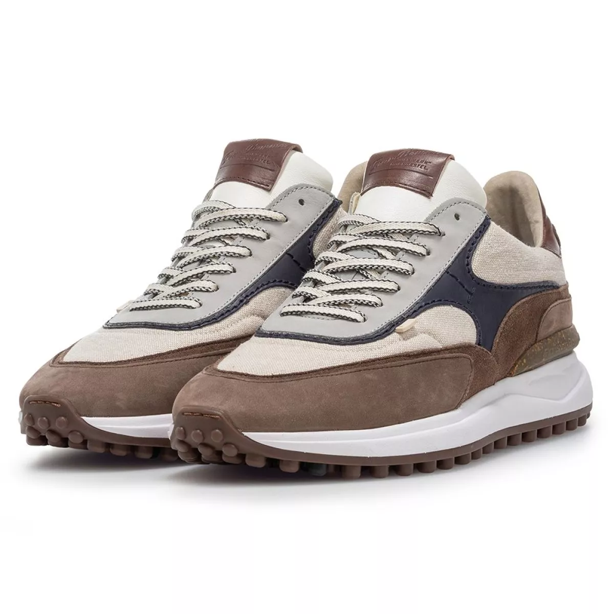 Deze uitvoering van onze Noppi sneaker bestaat uit een rijke mix van materialen en kleuren. Verschillende tinten beige smelten samen tot een stijlvol geheel. Op de tong is een sportieve mesh verwerkt. Het off-white deel van de noppenzool is vervaardigd uit lichtgewicht EVA materiaal. Het loopvlak is gemaakt van slijtvast TPU materiaal. De stabilizer achter bij de hiel is voorzien van het Floris van Bommel logo. De binnenkant van de schoen is afgewerkt met een kwalitatief hoogwaardige lederen voering en een uitneembaar voetbed.