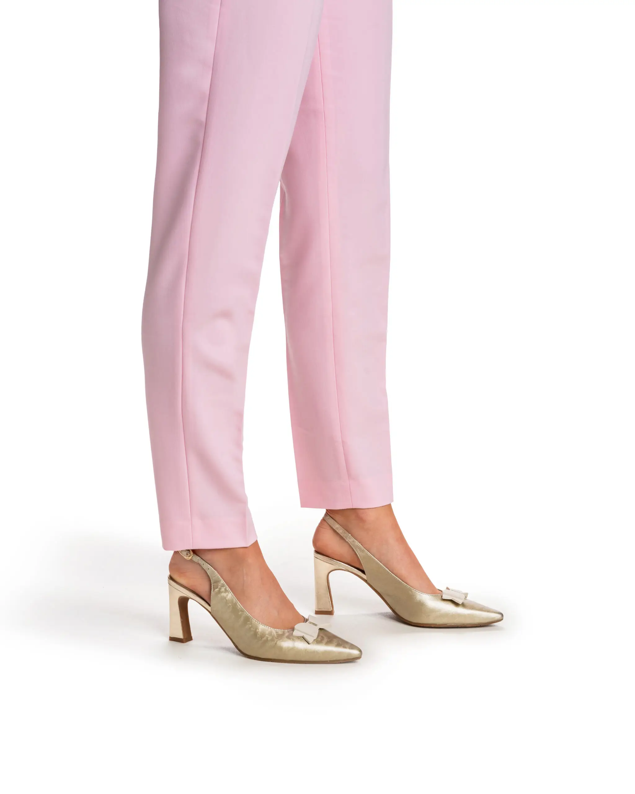 Deze Giuli-sandalette is een van de eyecatchers uit onze zomercollectie van 2025. De hak van 7,5 cm is bekleed met hetzelfde goude metallic leer als de rest de pump. Op de voorvoet is een sierlijke kunststof strik aangebracht met daarin een klein logo in de vorm van de letter F. De zool is gemaakt van slijtvast TPU-materiaal. De elegante, spits toelopende leest van deze pump is met haar G- wijdte geschikt voor een voet van gemiddelde breedte. De sandalette is gevoerd met dun geitenleer en heeft een zacht laagje foam onder het voetbed.