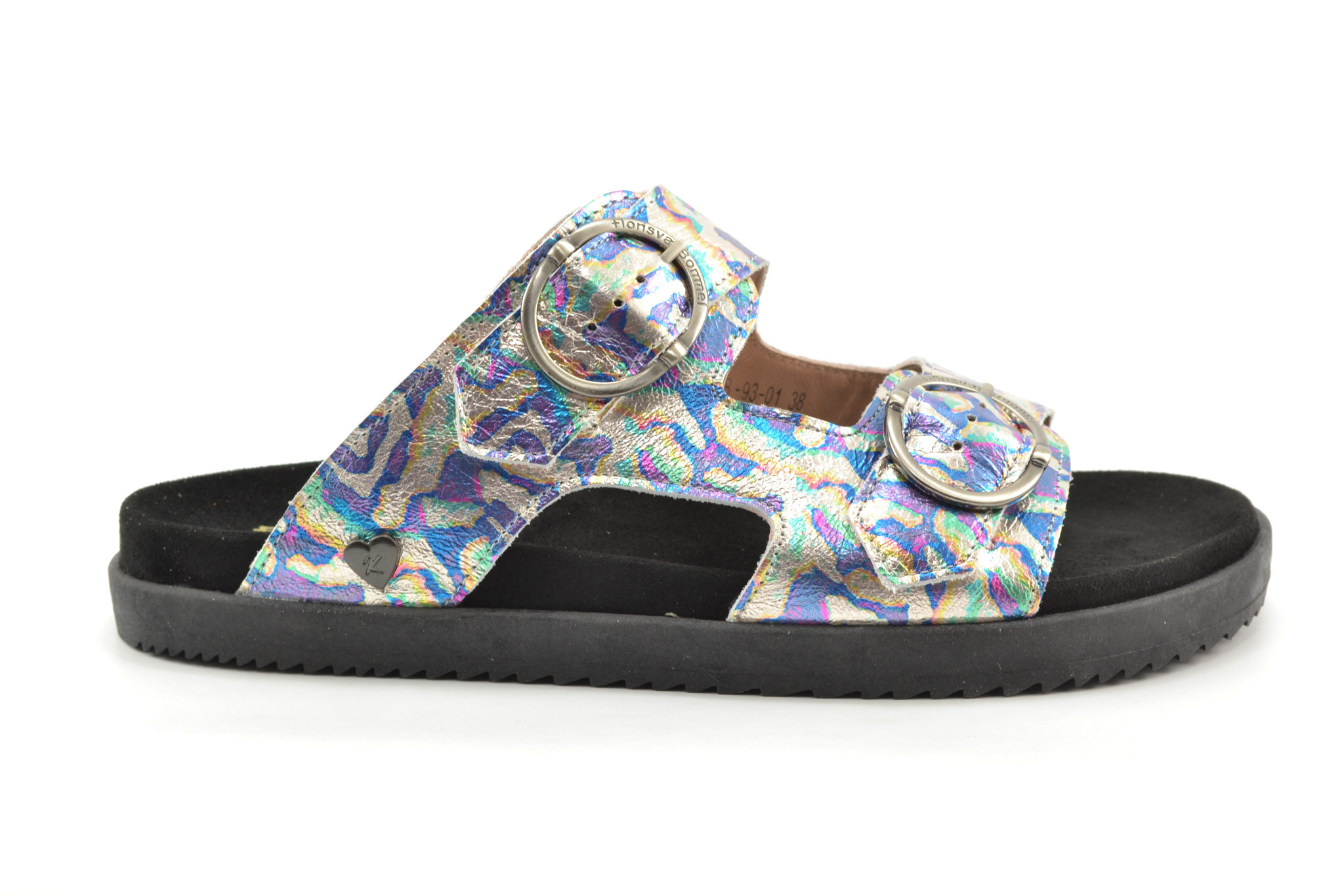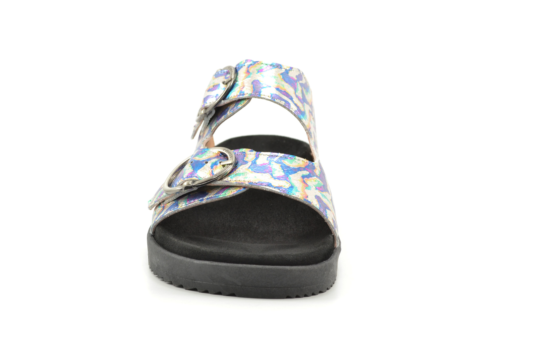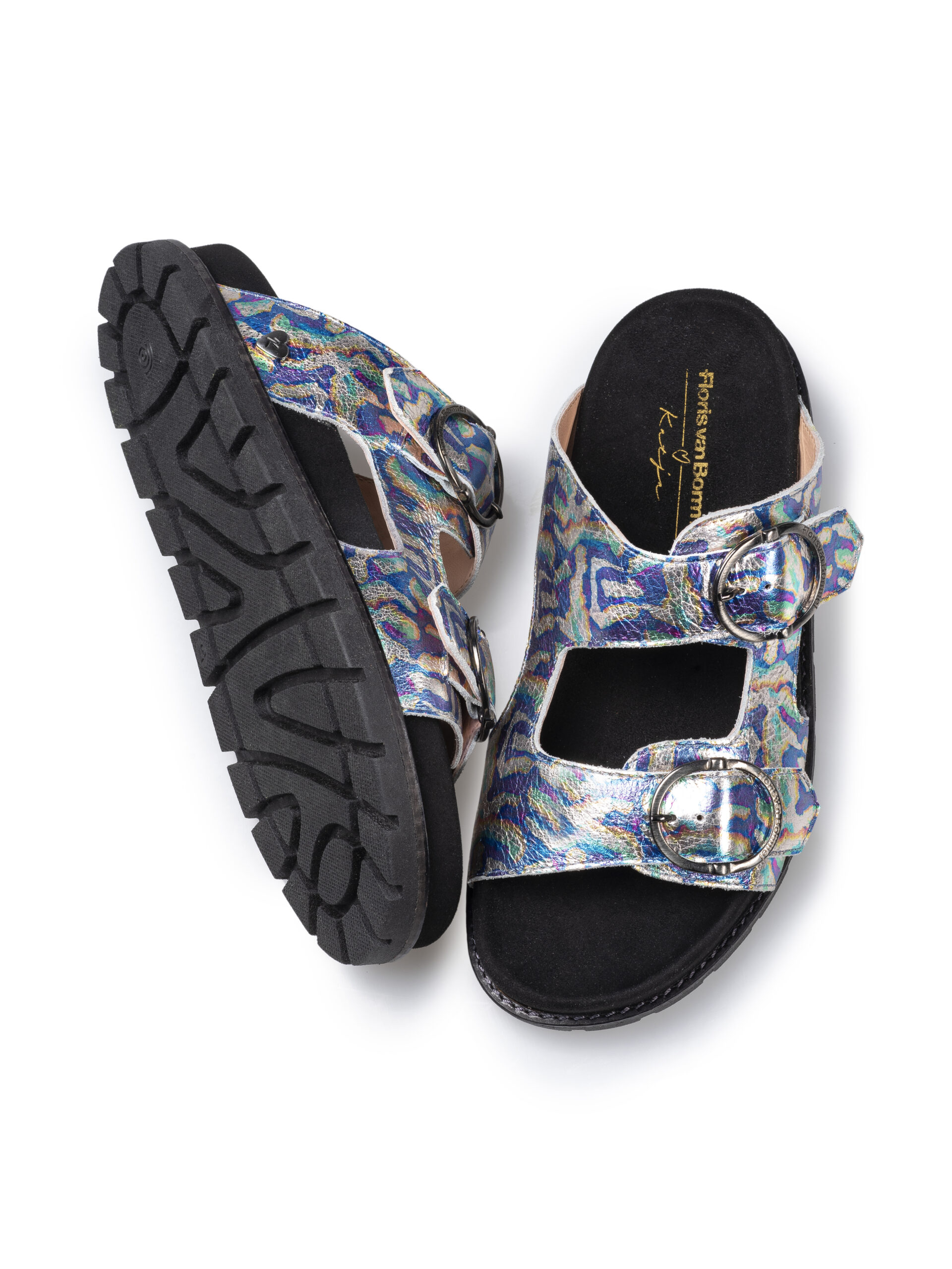 Dit is een vrolijke zomerse slipper met een zilver-blauwe print. Het voetbed is lekker comfortabel. Deze mooie slippers combineren perfect bij de nieuwe jeans- trend van dit seizoen. De 2 verstelbare banden zorgen er voor dat deze slippers perfect passen.