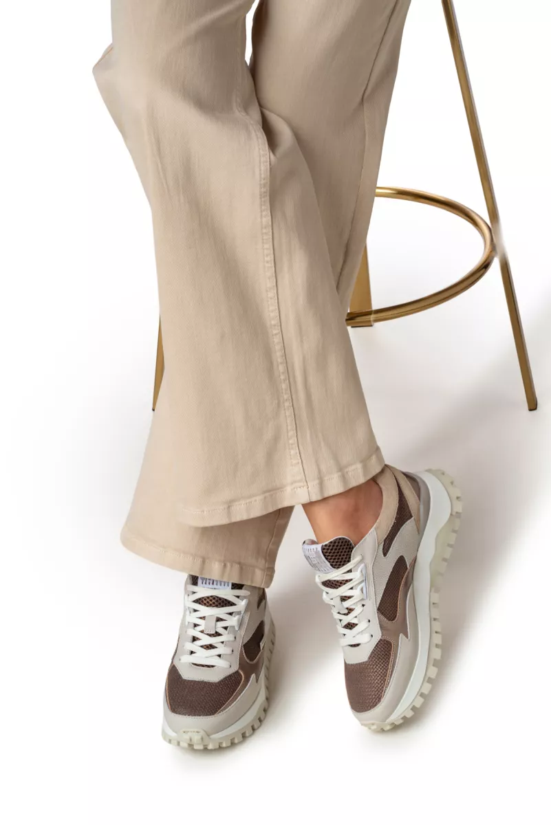 Deze sneaker staat op een sportieve zool met een karakteristiek blokjes patroon in het loopvlak. Op de hiel en tong zijn rubberen inzetten aangebracht met kleine Floris van Bommel logos. De sneaker is voorzien van kwalitatief hoogwaardige lederen voering en een comfortabel uitneembaar voetbed. Dit voetbed is eventueel te vervangen voor een eigen voetbed of steunzool. Het bovenwerk is gemaakt van verschillende kleurige materialen.