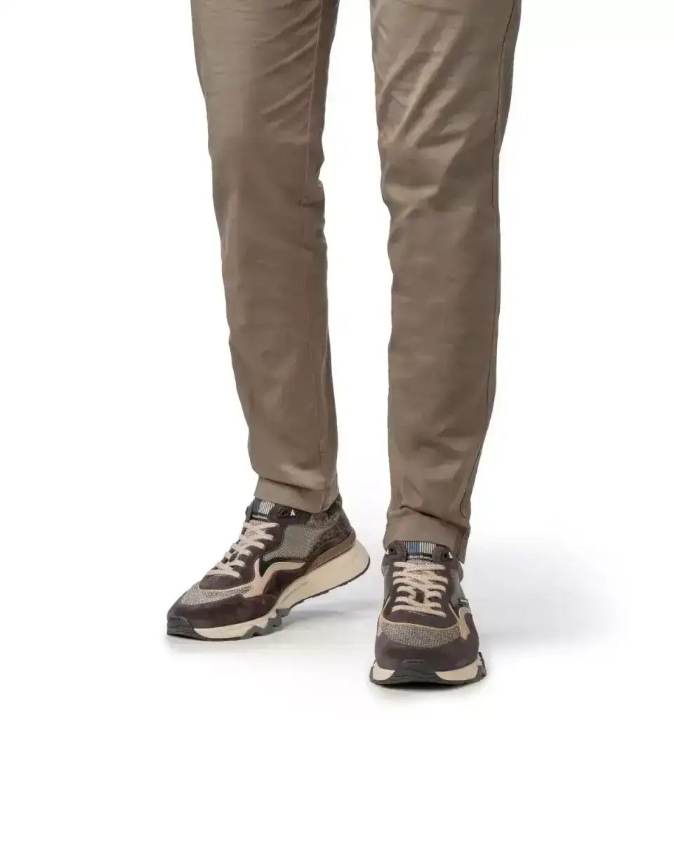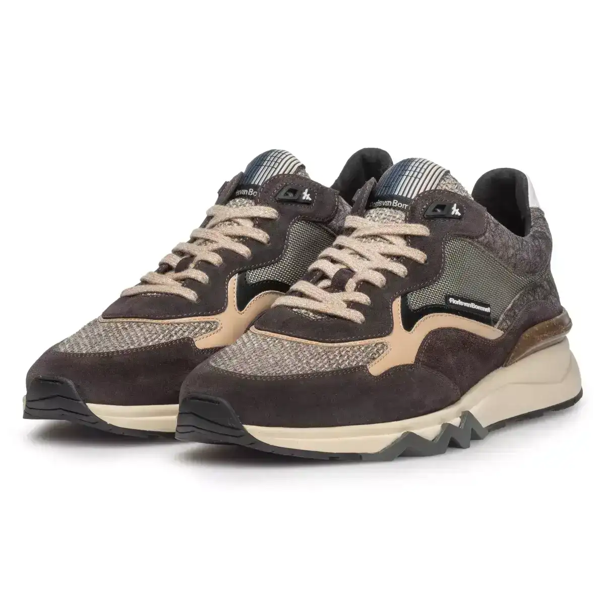 De zool van deze nieuwe Zager heeft achter een flink volume en krijgt mooi snelheid door richting de voorvoet laag weg te duiken. De zool is gemaakt van cremekleurig, extreem licht, EVA materiaal. Het loopvlak is van slijtvast TPU. Het loopvlak is voorzien van een typische Floris van Bommel zigzaglijn. De binnenkant van de sneaker is afgewerkt met hoogwaardige lederen voering en een uitneembaar voetbed. Deze variant is uitgevoerd in donkergrijs suede en groen mesh.