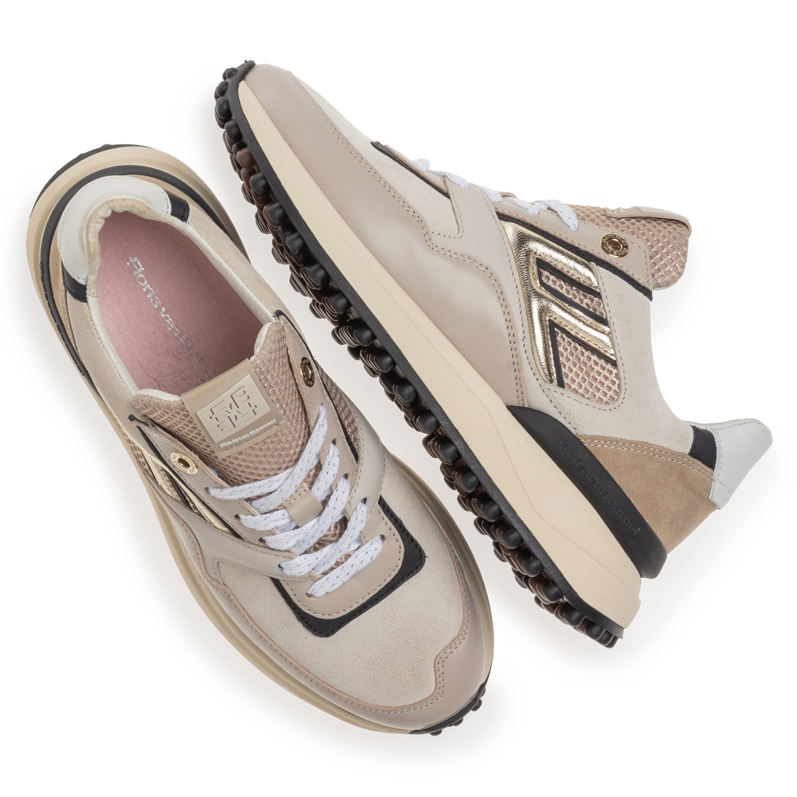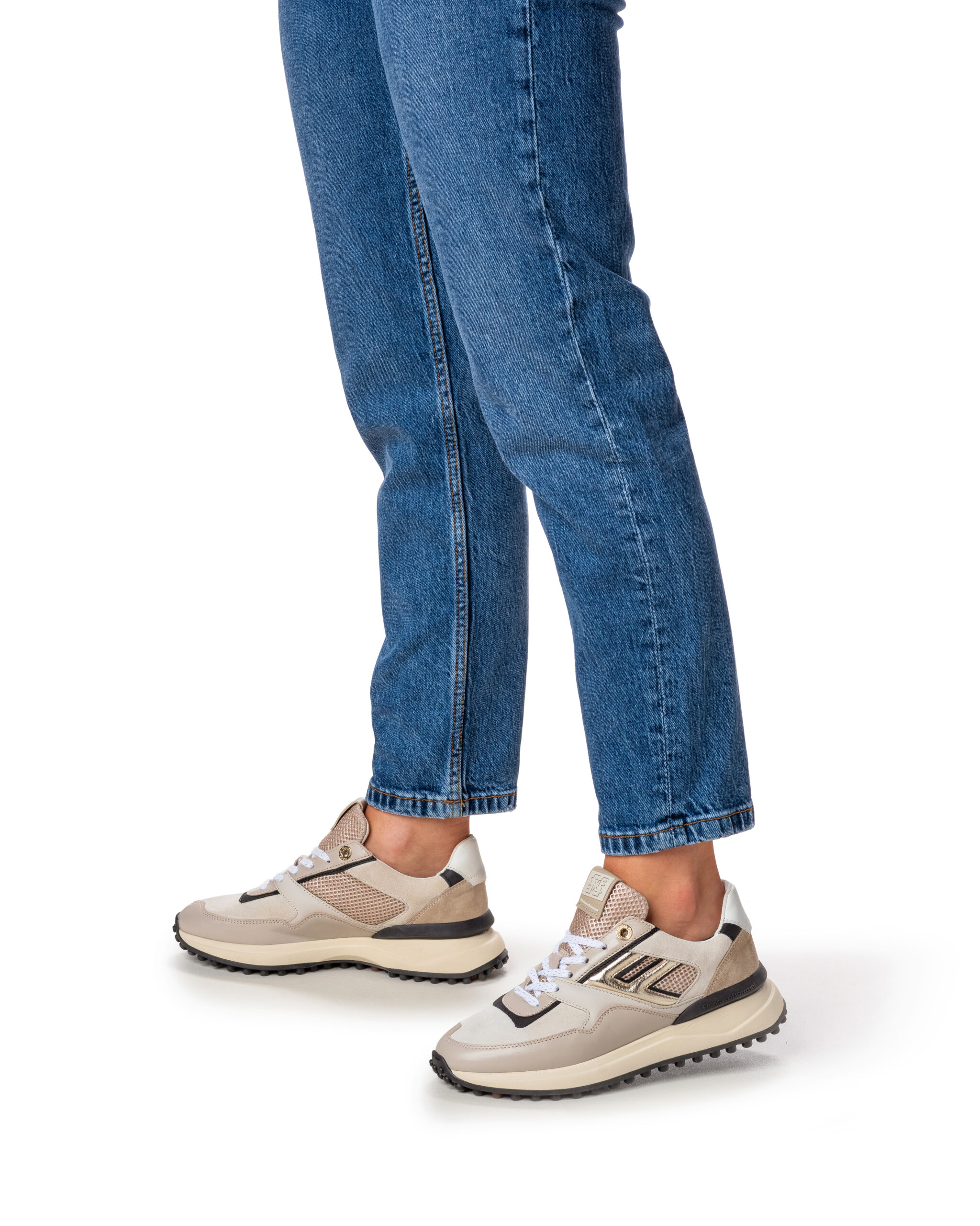 is voorzien van een slijtvast TPU loopvlak met opvallende noppen. In het noppenpatroon is een kleurvlak aangebracht dat de zool nog net wat meer eigen maakt. Draagcomfort is gegarandeerd dankzij een zorgvuldig ontworpen leest, hoogwaardige lederen voering en een uitneembaar voetbed. Deze variant is uitgevoerd in een rijke mix van materialen in lichtgrijs en goudkleuren.