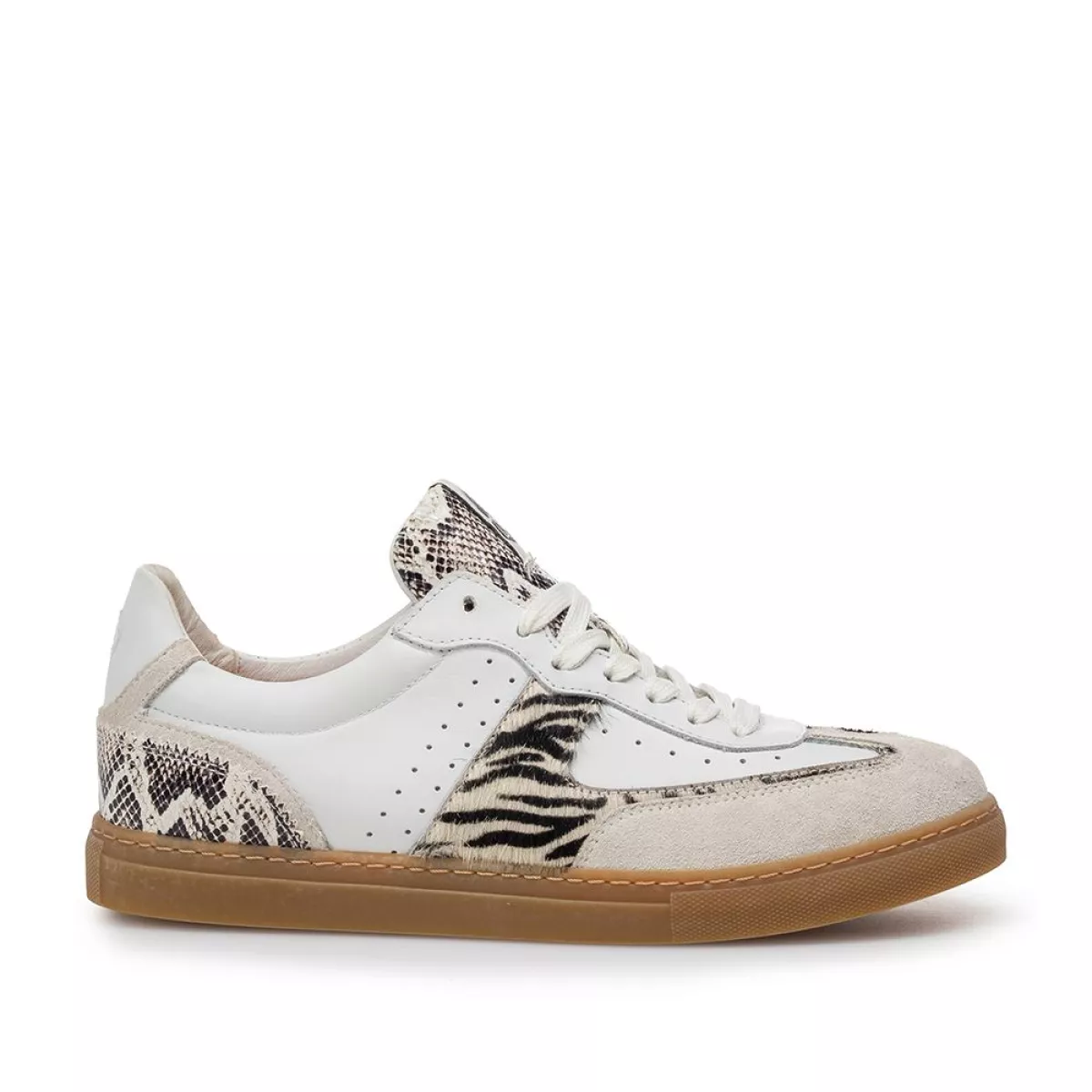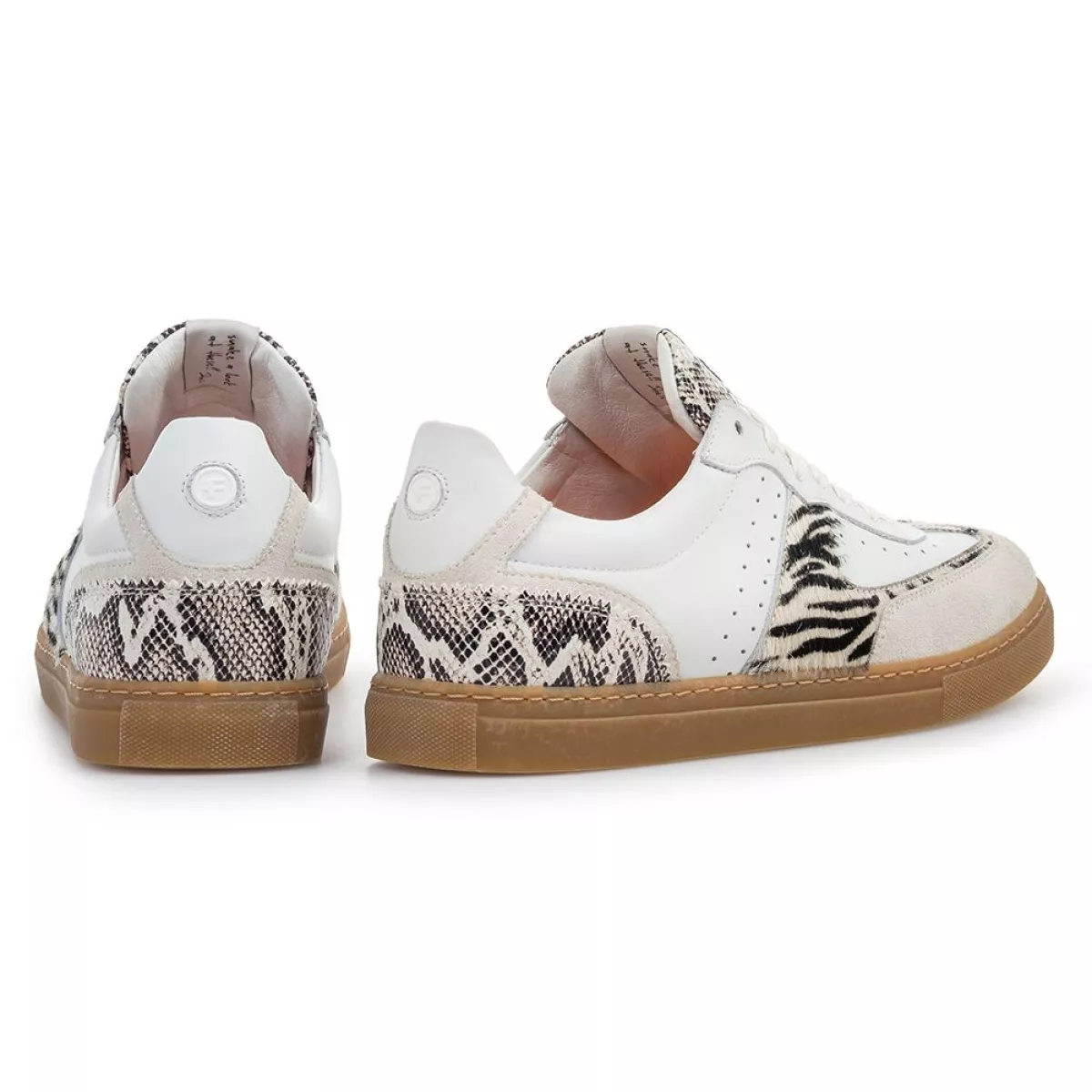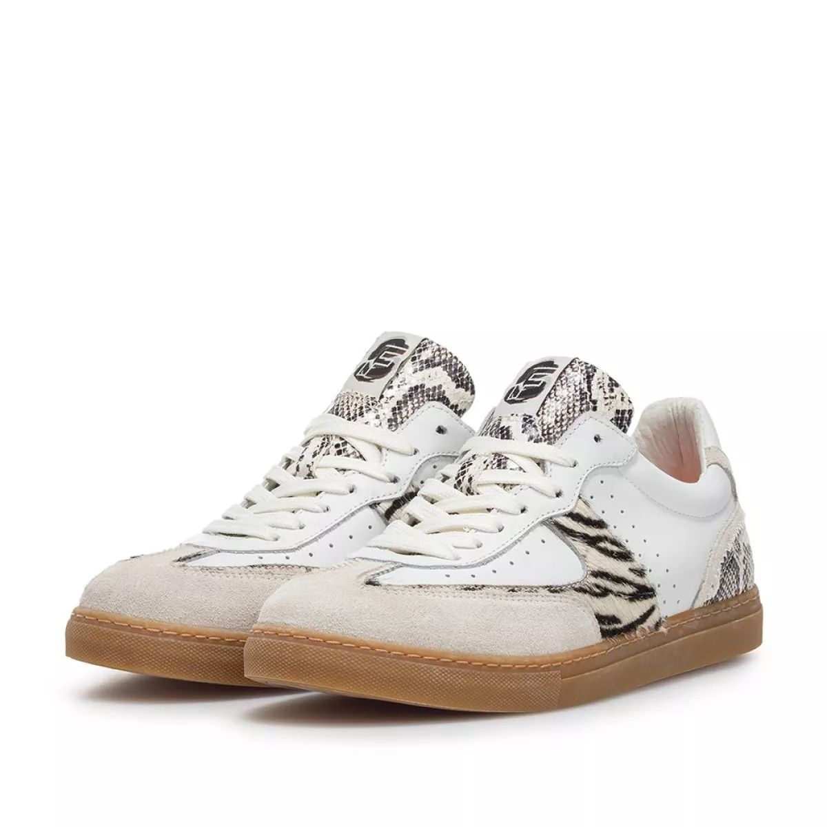 Dit is een sneaker op een comfortabele retro-tenniszool. Een bijzonder detail is het wat grovere fantasiestiksel dat onder de veters op de veterklep doorloopt. Deze sneaker is uitgevoerd in wit leer met zebra en snake-ptint overlays. Achter op de hiel is een rubberen inzetje in het leer gestikt, met daarop een logo in de vorm van de letter F. De schoen is gevoerd met hoogwaardig voeringleer en voorzien van een uitneembaar voetbed dat eventueel kan worden vervangen door een eigen voetbed of steunzool.