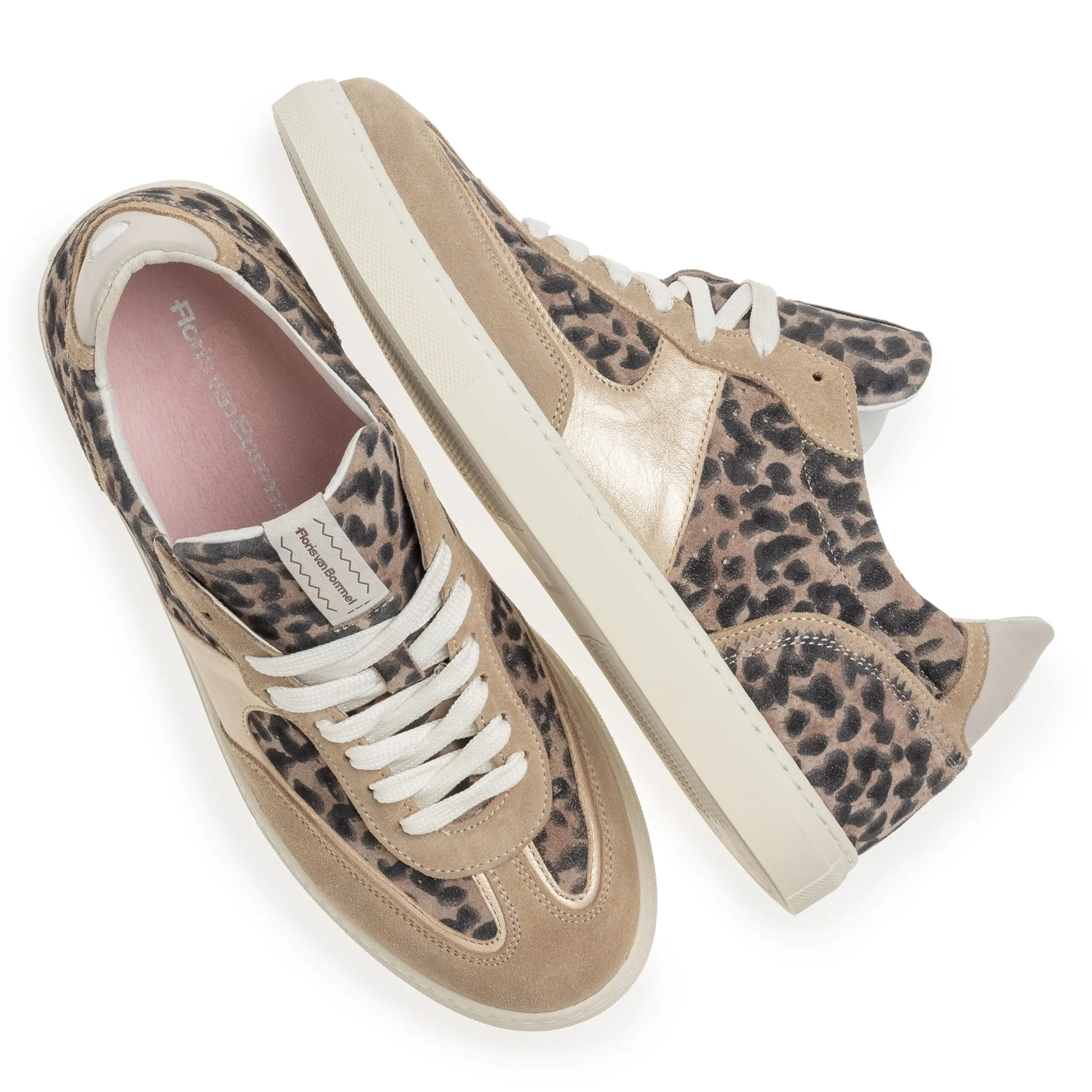 Dit is een sneaker op een comfortabele retro-tenniszool. Een bijzonder detail is het wat grovere fantasiestiksel dat onder de veters op de veterklep doorloopt. Deze schoen is uitgevoerd in een combinatie van fantasiematerialen. Het Floris van Bommel-logo is in glanzende letters op de zijkant gestempeld. Achter op de hiel is een rubberen inzetje in het leer gestikt, met daarop een logo in de vorm van de letter F. De schoen is gevoerd met hoogwaardig voeringleer en voorzien van een uitneembaar voetbed dat eventueel kan worden vervangen door een eigen voetbed of steunzool.