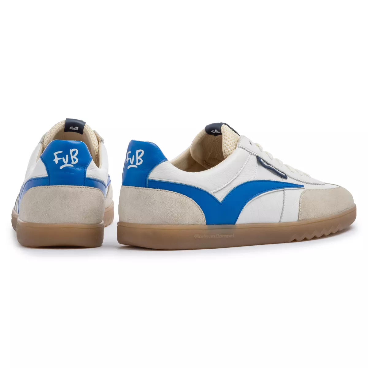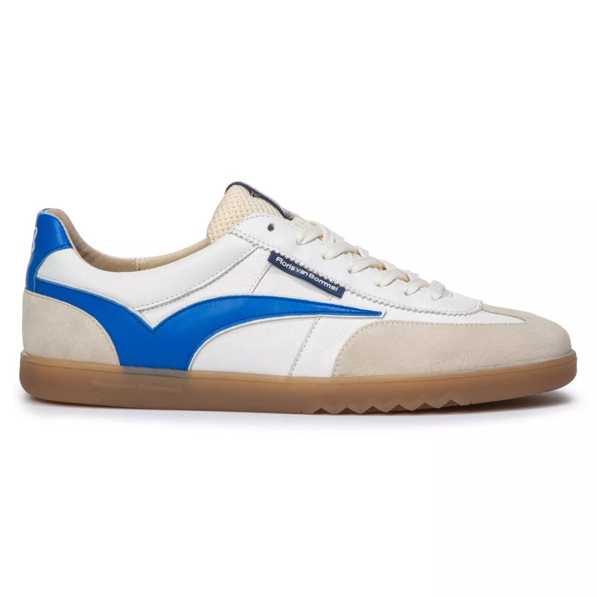 Deze De Zaler-sneaker is geïnspireerd op vintage indoorsportschoenen. De zijkant is gedecoreerd met een retro Floris van Bommel-sportbelijning. Vanwege de inspiratie uit het verleden is de kuipzool ook passend basic gehouden. Om de zool toch naar het heden te brengen, is onder de voorvoet een kenmerkende Floris van Bommel-zigzaglijn aangebracht. Op de tong, zijkant en hiel zijn Floris van Bommel-logos aangebracht. De binnenkant van de schoen is voorzien van een luxe leren voering en een uitneembaar voetbed, dat kan worden vervangen door een persoonlijk voetbed of steunzool. Deze sneaker is uitgevoerd in een rustige mix van wit leer en zandkleurig suède, afgewerkt met een contrasterende sportbelijning op de zijkant.