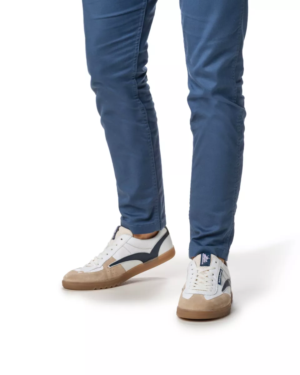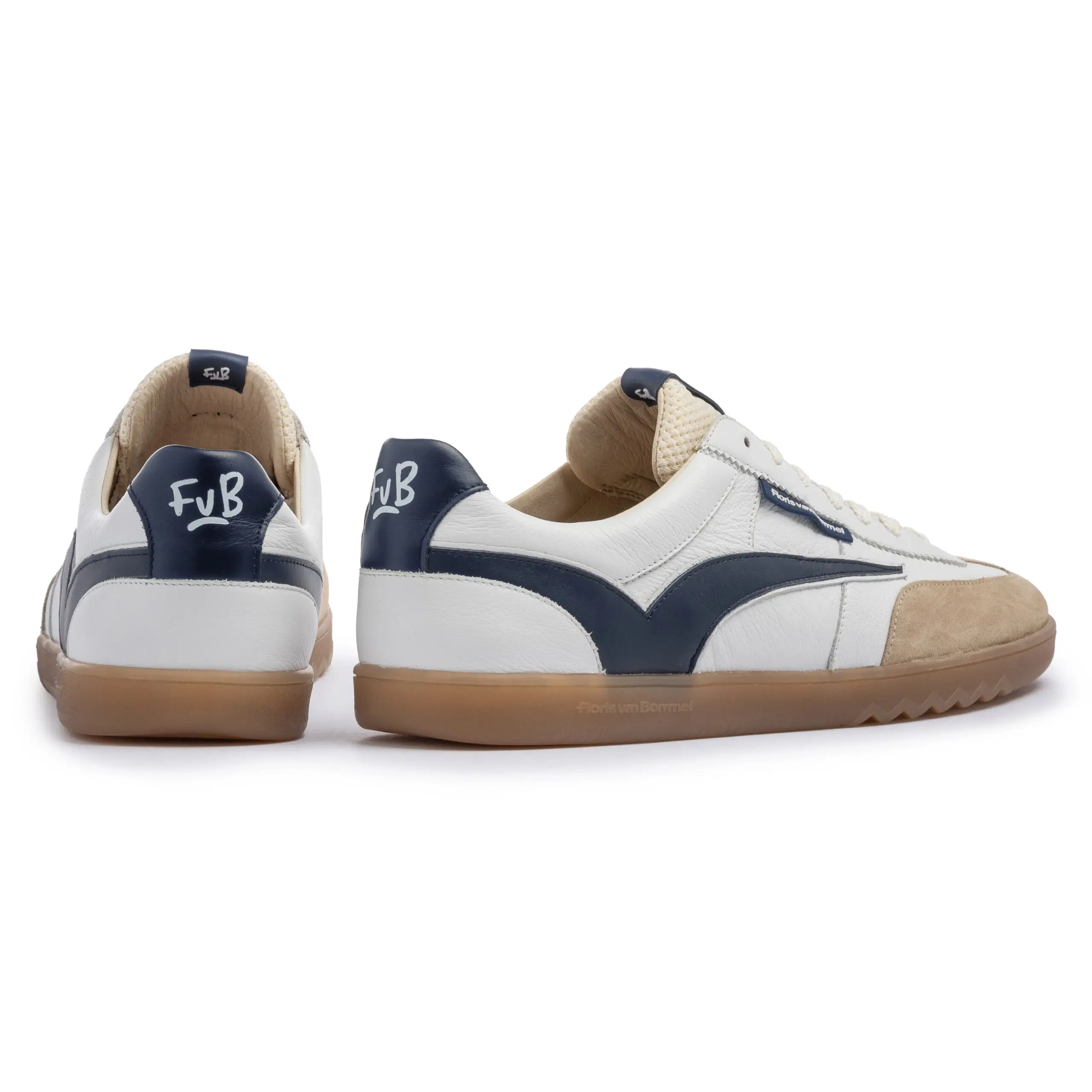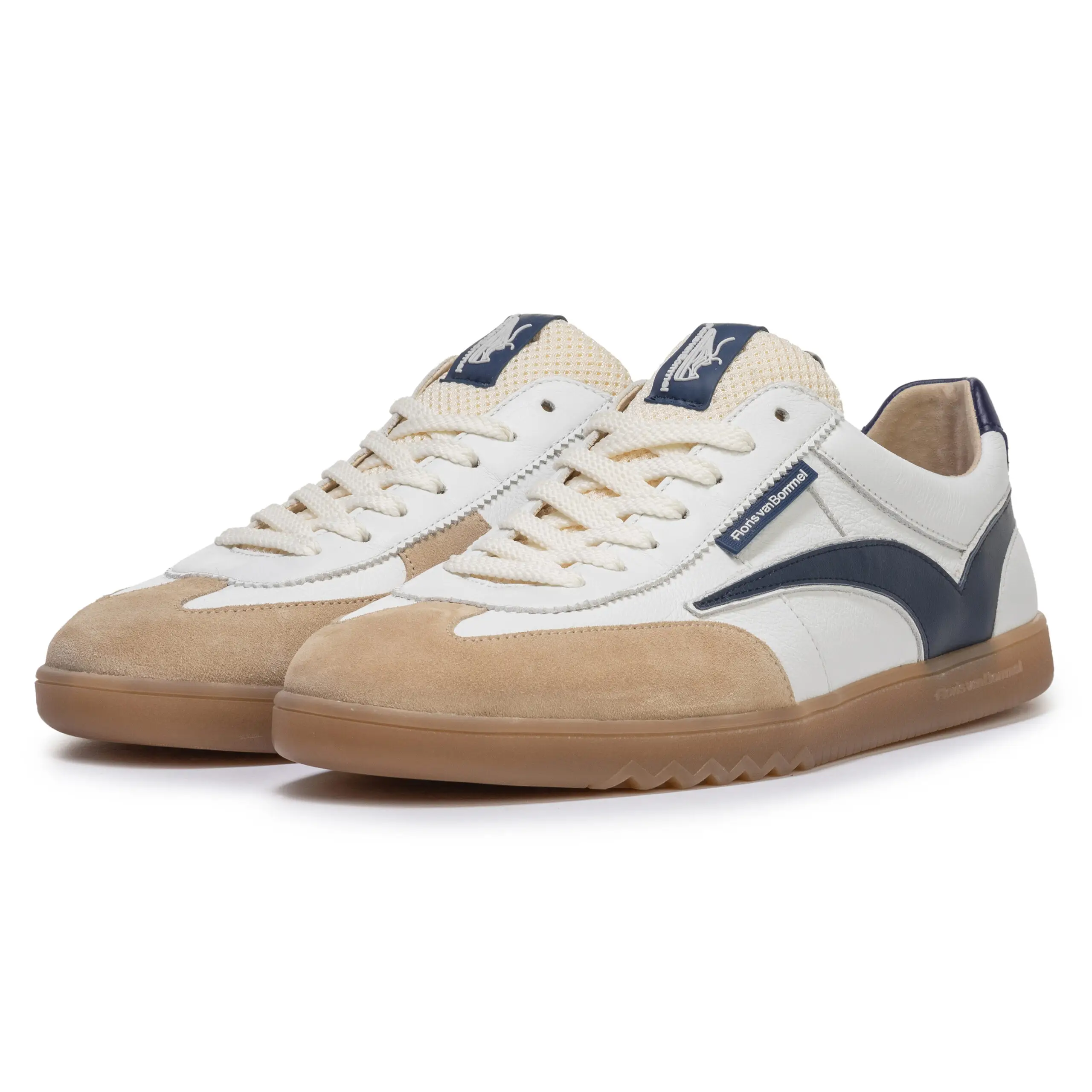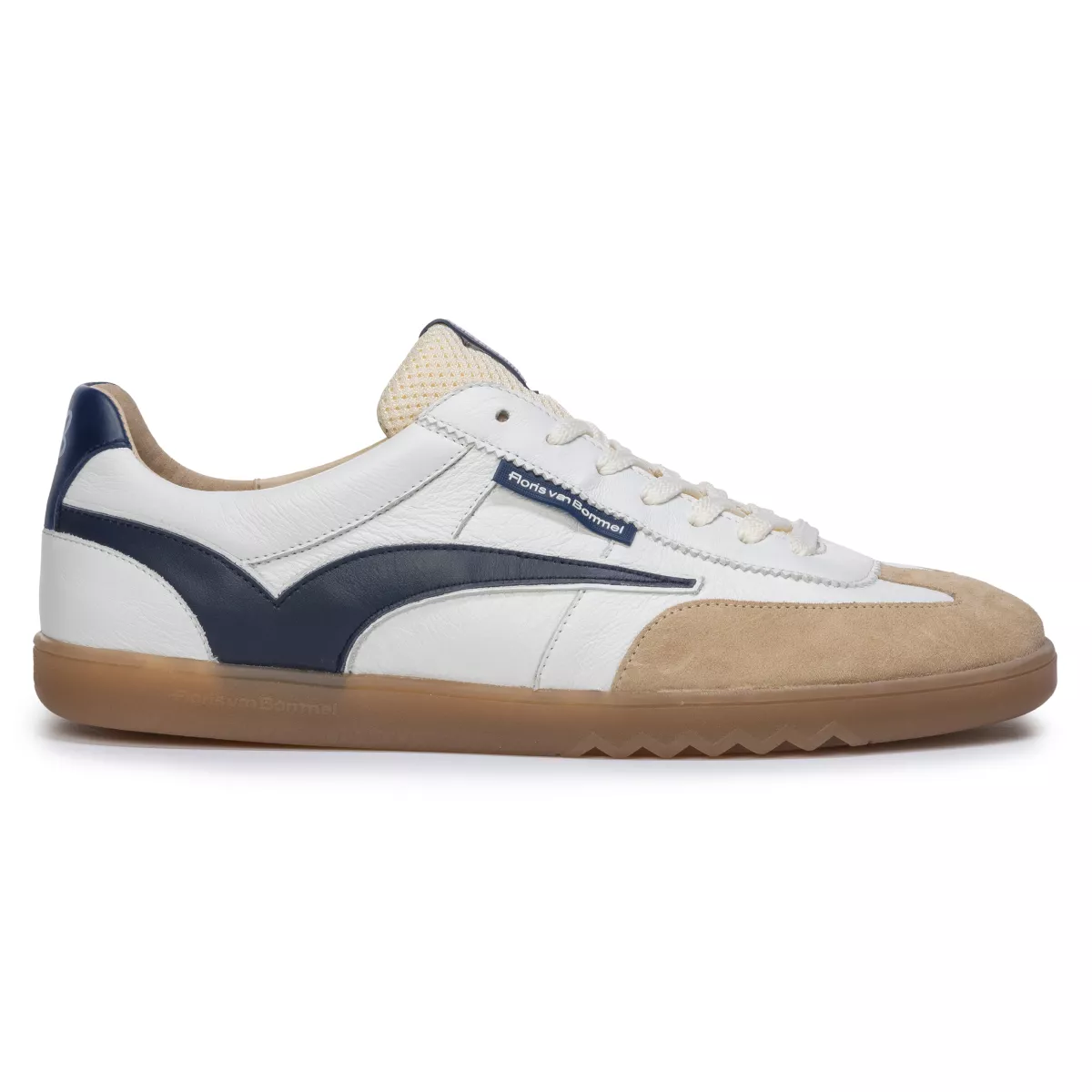 Deze De Zaler-sneaker is geïnspireerd op vintage indoorsportschoenen. De zijkant is gedecoreerd met een retro Floris van Bommel-sportbelijning. Vanwege de inspiratie uit het verleden is de kuipzool ook passend basic gehouden. Om de zool toch naar het heden te brengen, is onder de voorvoet een kenmerkende Floris van Bommel-zigzaglijn aangebracht. Op de tong, zijkant en hiel zijn Floris van Bommel-logos aangebracht. De binnenkant van de schoen is voorzien van een luxe leren voering en een uitneembaar voetbed, dat kan worden vervangen door een persoonlijk voetbed of steunzool. Deze sneaker is uitgevoerd in een rustige mix van wit leer en zandkleurig suède, afgewerkt met een contrasterende sportbelijning op de zijkant.