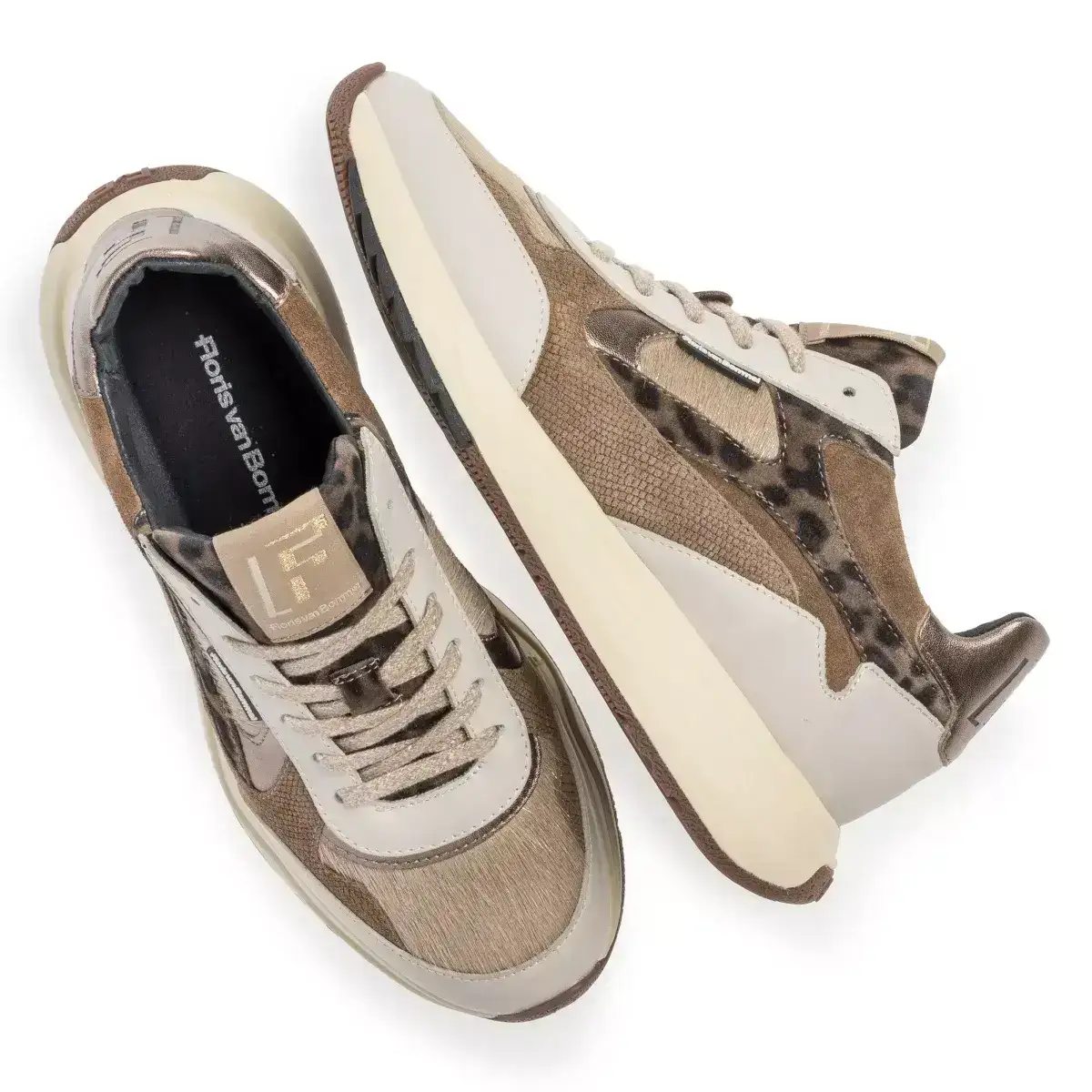 Deze Suvi sneaker is voorzien van een soepele en comfortabele lichtgewicht zool. Het bovenwerk is gemaakt van een materialenmix in taupe- en beigetinten. Het suède op de voorvoet en zijkant heeft een fijne reliëfdruk van vierkantjes waar een klein glansje op aangebracht is. Dit glansje geeft samen met het brons metallic leer aan de zijkant en het goudkleurige tonglabel een luxe uitstraling aan de schoen. Op het tonglabel en de hiel zijn retro ogende FvB logos verwerkt. De schoen is voorzien van een comfortabel, lekker dik voetbed dat, indien gewenst, vervangen kan worden door een eigen voetbed of steunzool. De voering is gemaakt van soepel, maar stevig zwart leer.