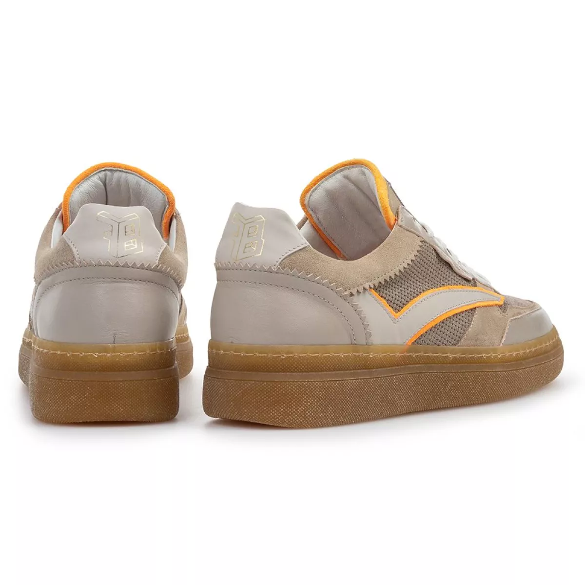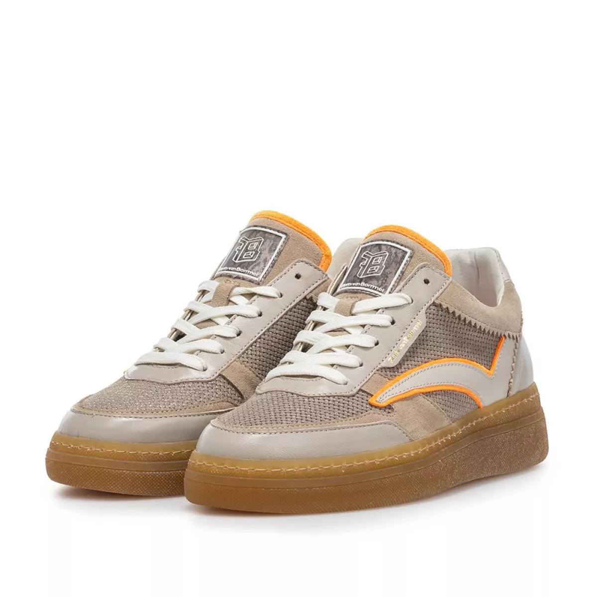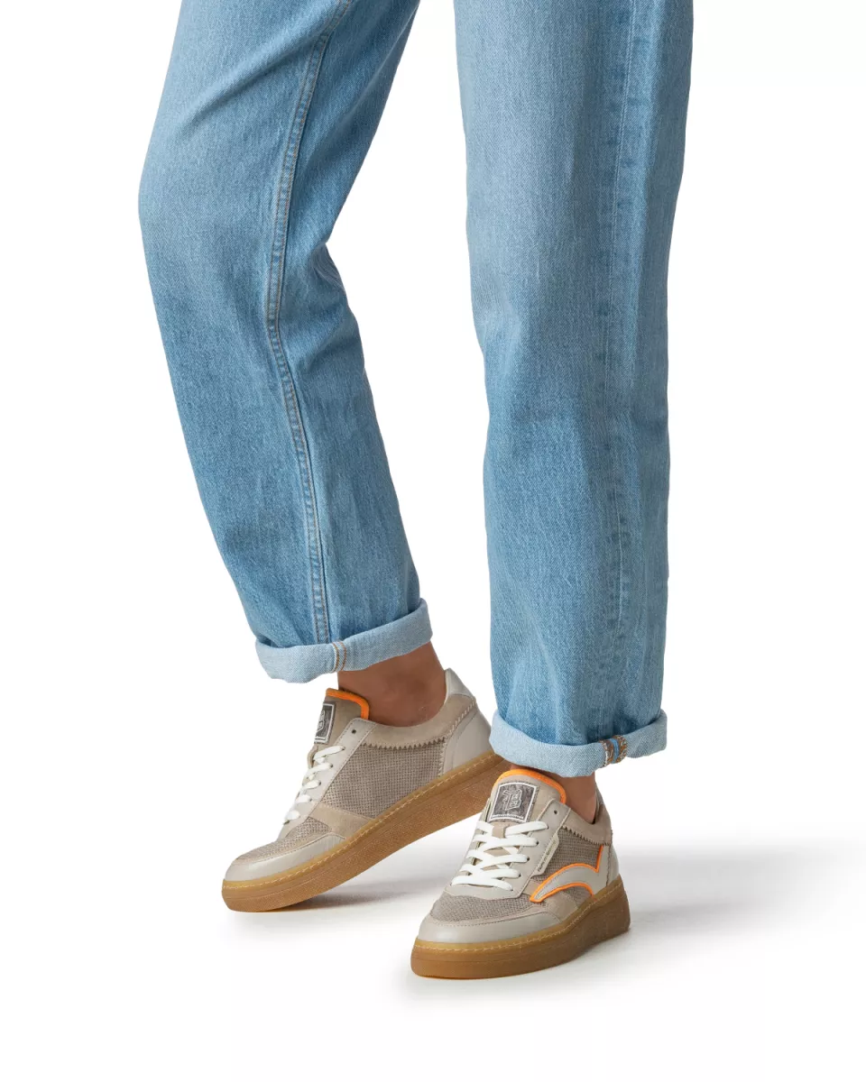 Dit is een sportieve sneaker op een transparante, gumkleurige tenniszool. De schoen is gevoerd met soepel en zacht leer. Het voetbed is uitneembaar en kan eventueel worden vervangen door een eigen voetbed of steunzool. Op de tong is een kunststof label bevestigd met het Floris van Bommel-logo. Het bovenwerk is gemaakt van een combinatie van beige leer en suède, met als accent fluo-oranje suède.
