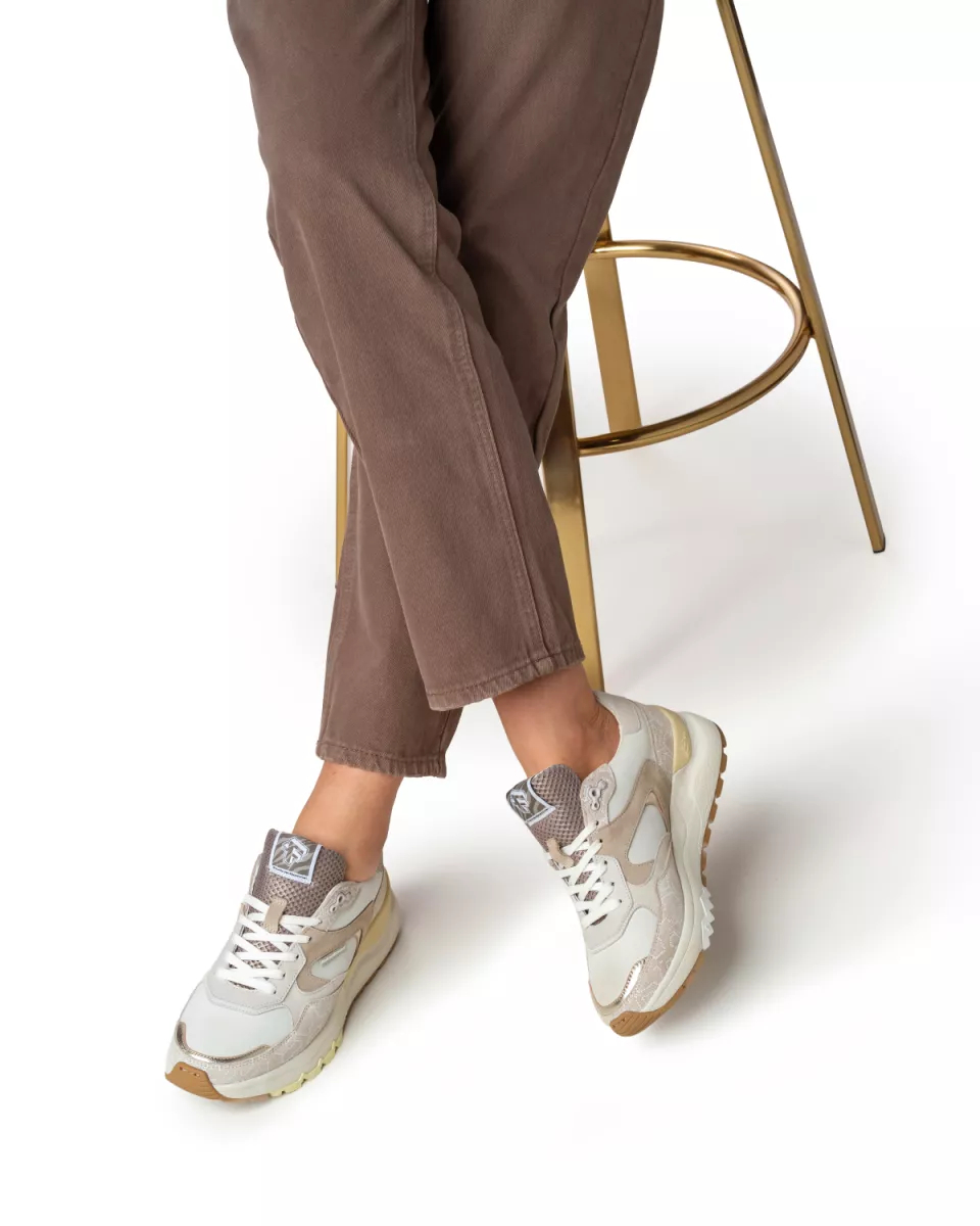 Deze Treni sneaker is ontworpen op een sportieve lichtgewicht runnerzool met een stevige stabilizer die de hiel mooi op zijn plaats houdt. De zool is uitgevoerd in 4 kleuren en heeft aan de binnenzijde bij de voorvoet een kleine zigzaglijn die kenmerkend is voor Floris van Bommel sneakers. Dit model is uitgevoerd in een rijke materiaalmix van verschillende kleuren taupe suède, wit leer en nubuck met een zilverprint. De sneaker is rijk gedecoreerd met Floris van Bommel- branding. Finishing touch: de smetteloos witte veter met een ingeweven