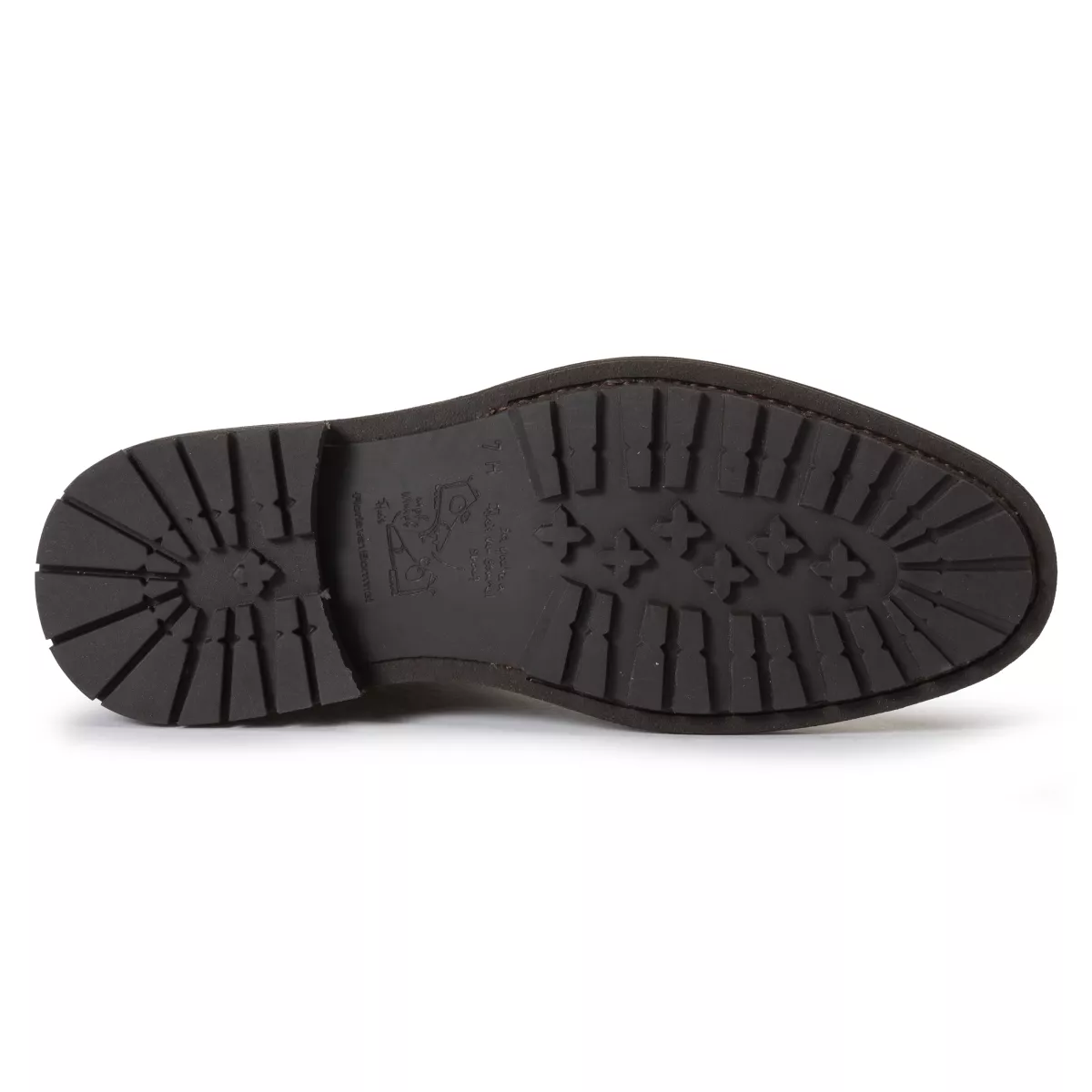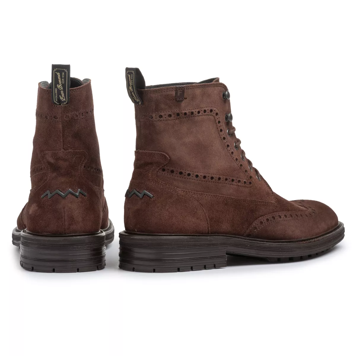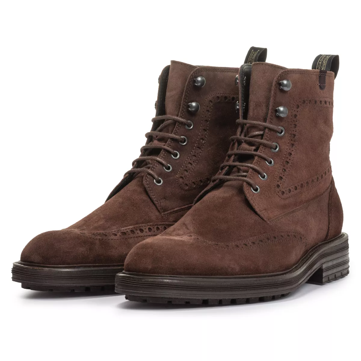 Dit is een winterse brogueboot op een robuuste rubberen profielzool die doorgenaaid is volgens de Blake maakwijze. De boot is ontworpen op een H-wijdte leest. Dit betekent dat de boot een net wat ruimere pasvorm heeft dan de gemiddelde schoen. De boot is gemaakt van donkerbruin suède. Achter op de hiel is een klein rubberen zigzag lijntje in het leer gestikt. De boot is voorzien van een kwalitatief hoogwaardige kalfslederen voering. Het uitneembare voetbed is in de meeste gevallen probleemloos te vervangen voor een eigen steunzool.