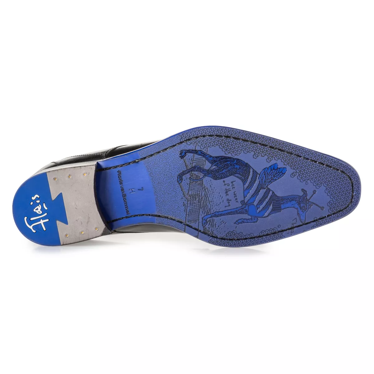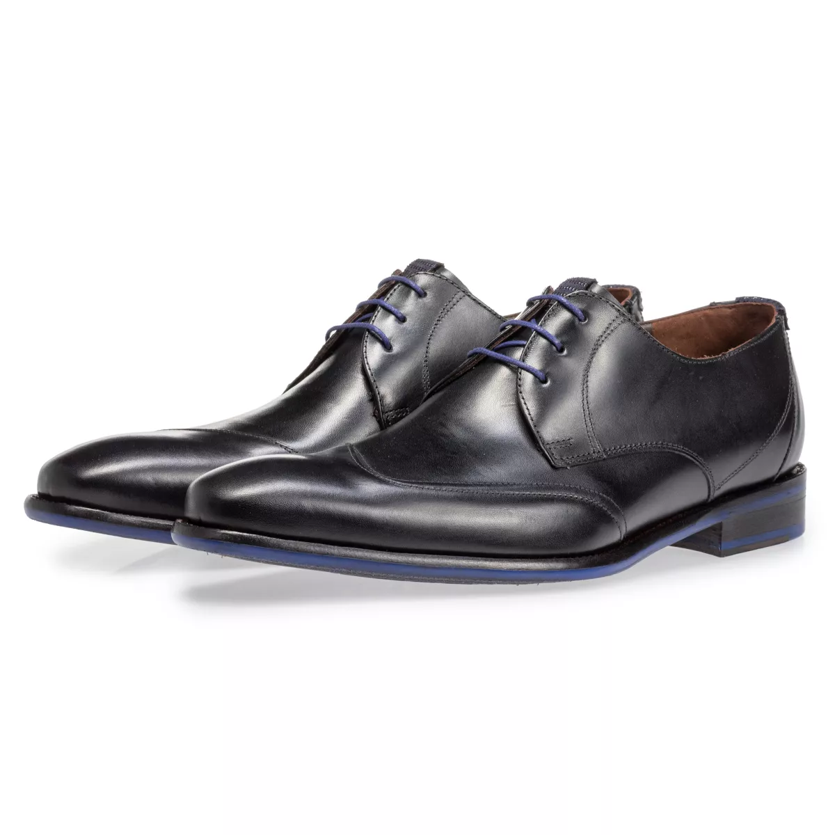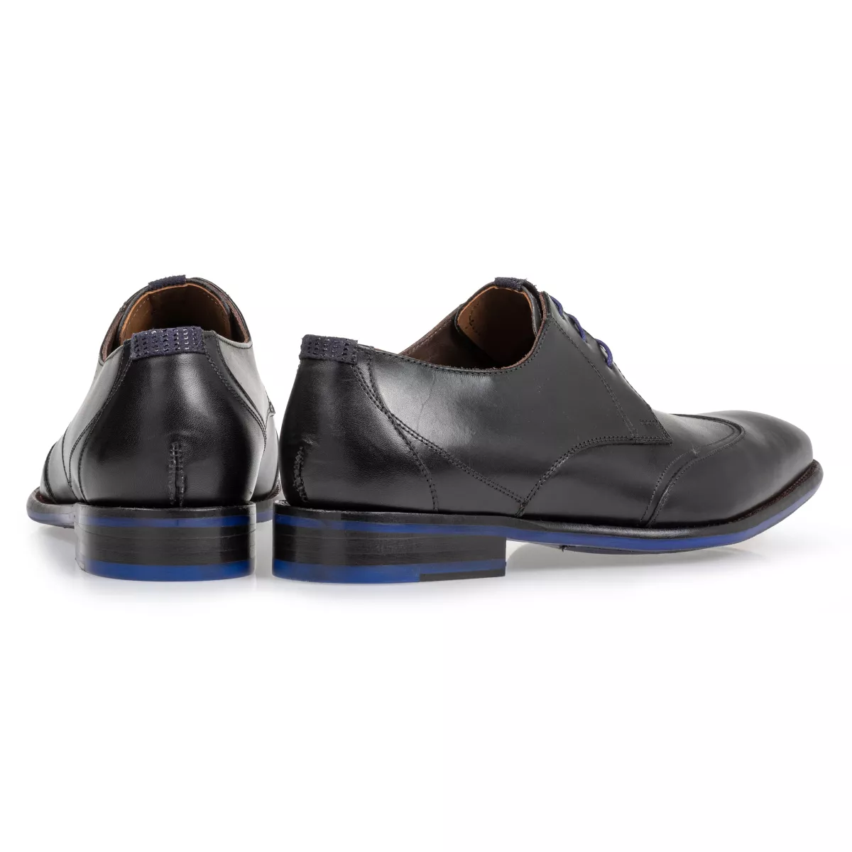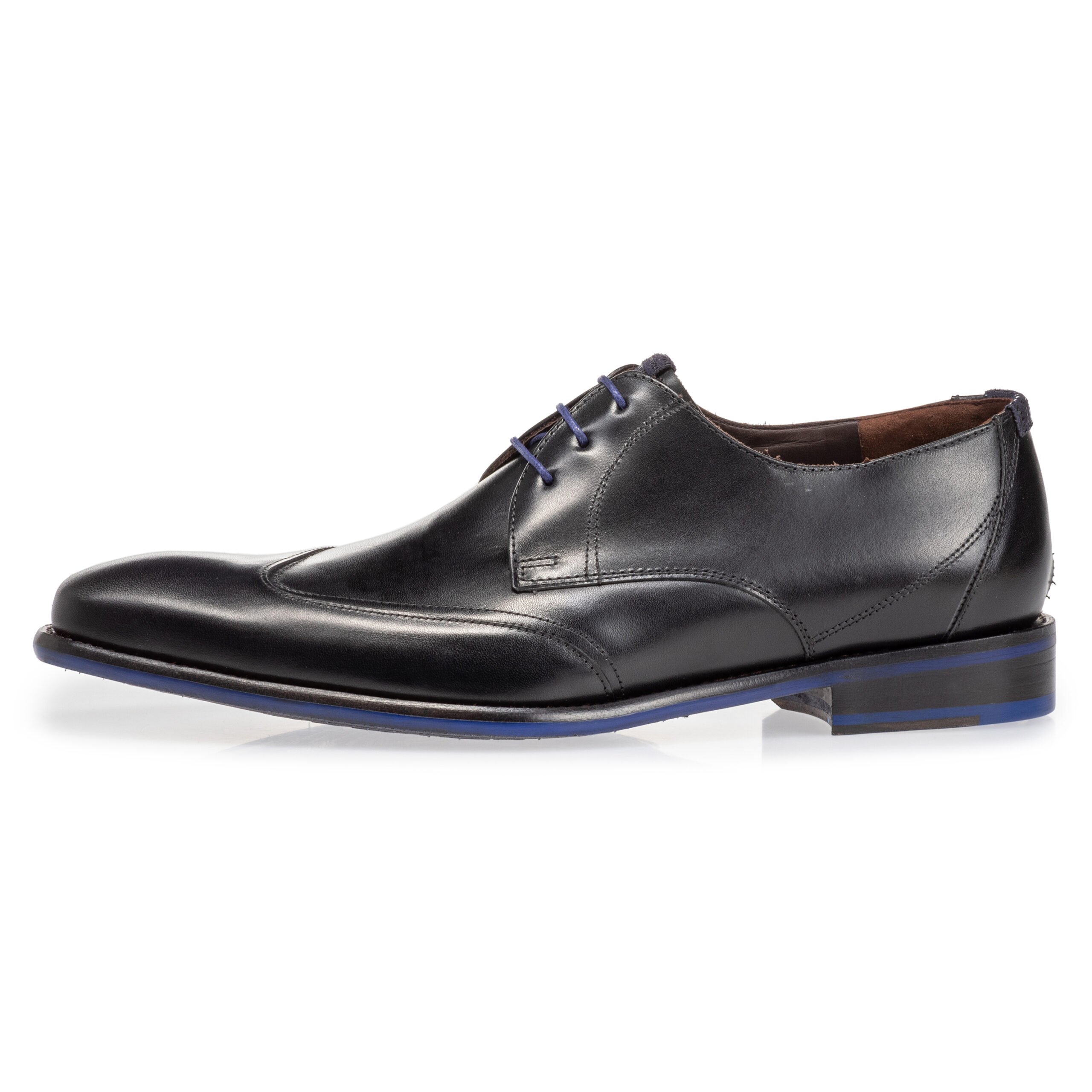 Een veterschoen uitgevoerd in zwart kalfsleer. De sierstikels op de neus en de hiel geven dit model zijn klassieke uitstraling. De kobaltblauwe accenten zorgen voor een kleurrijke toevoeging.