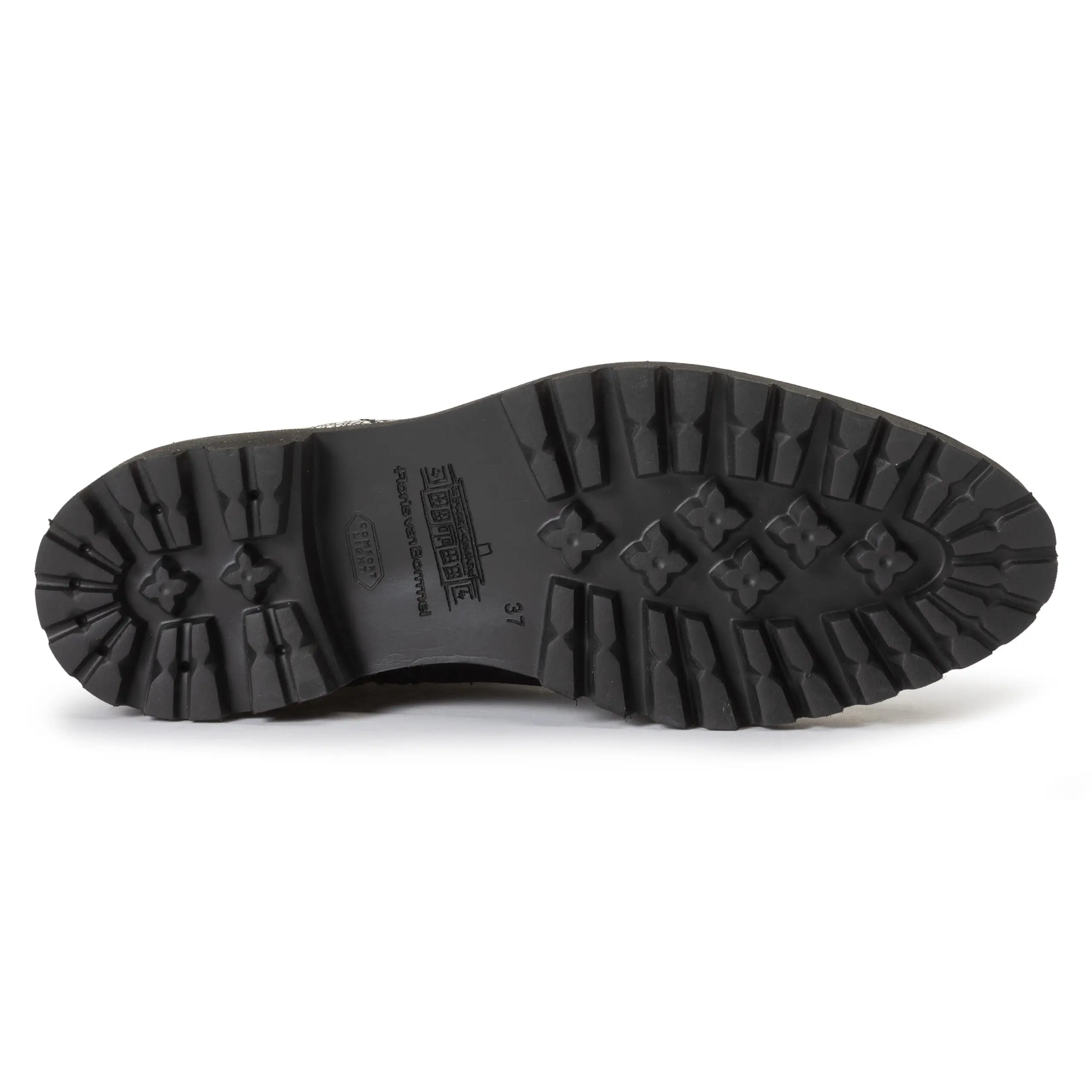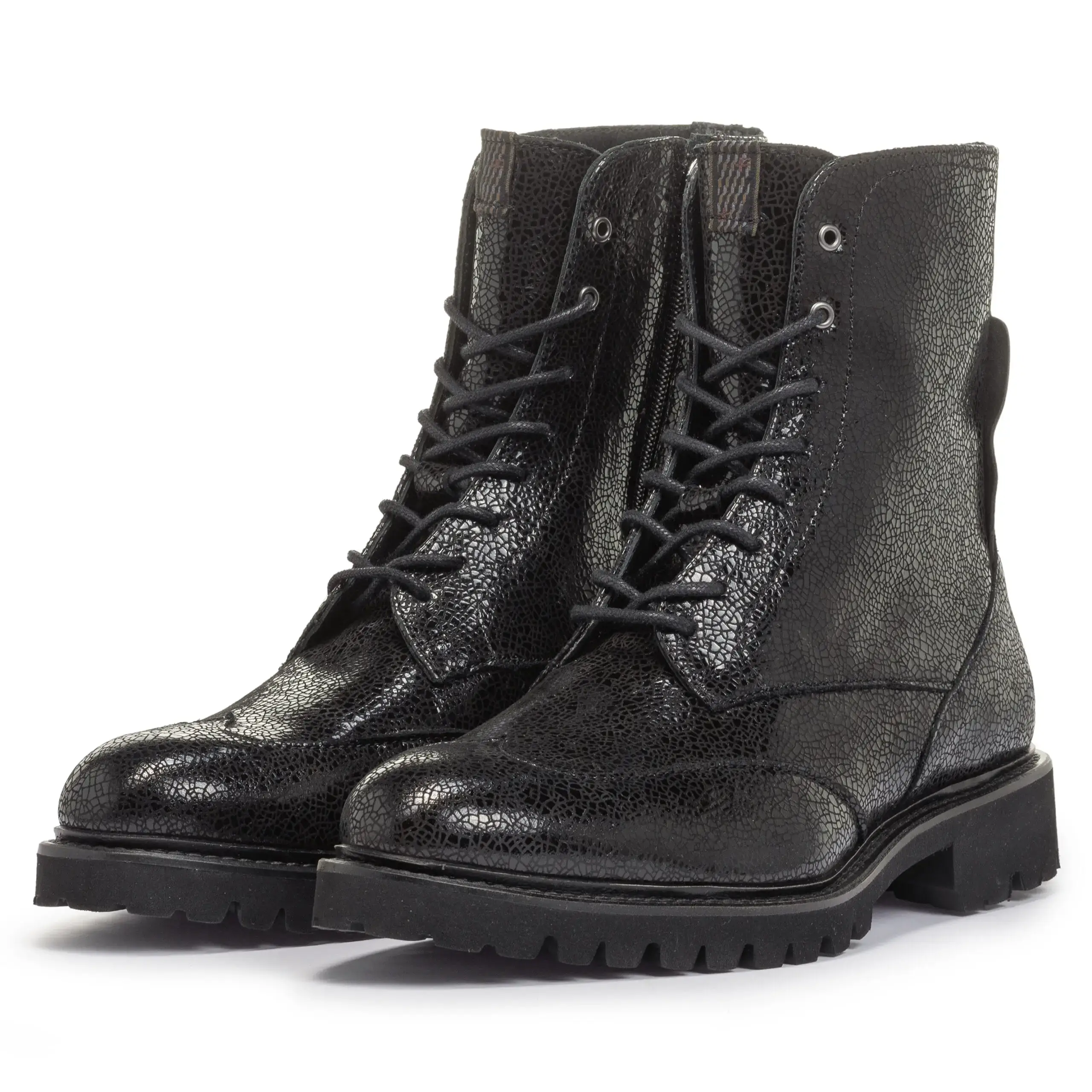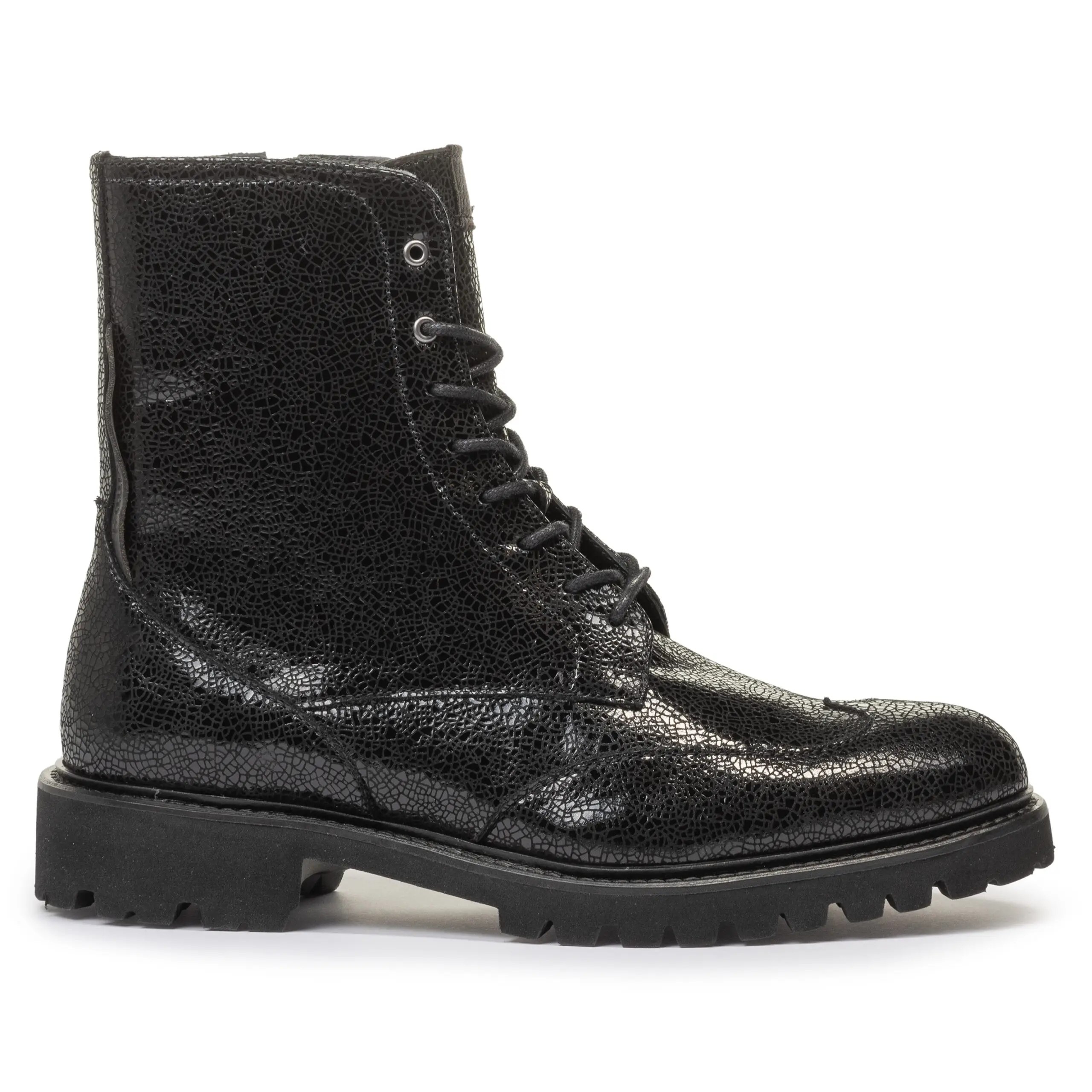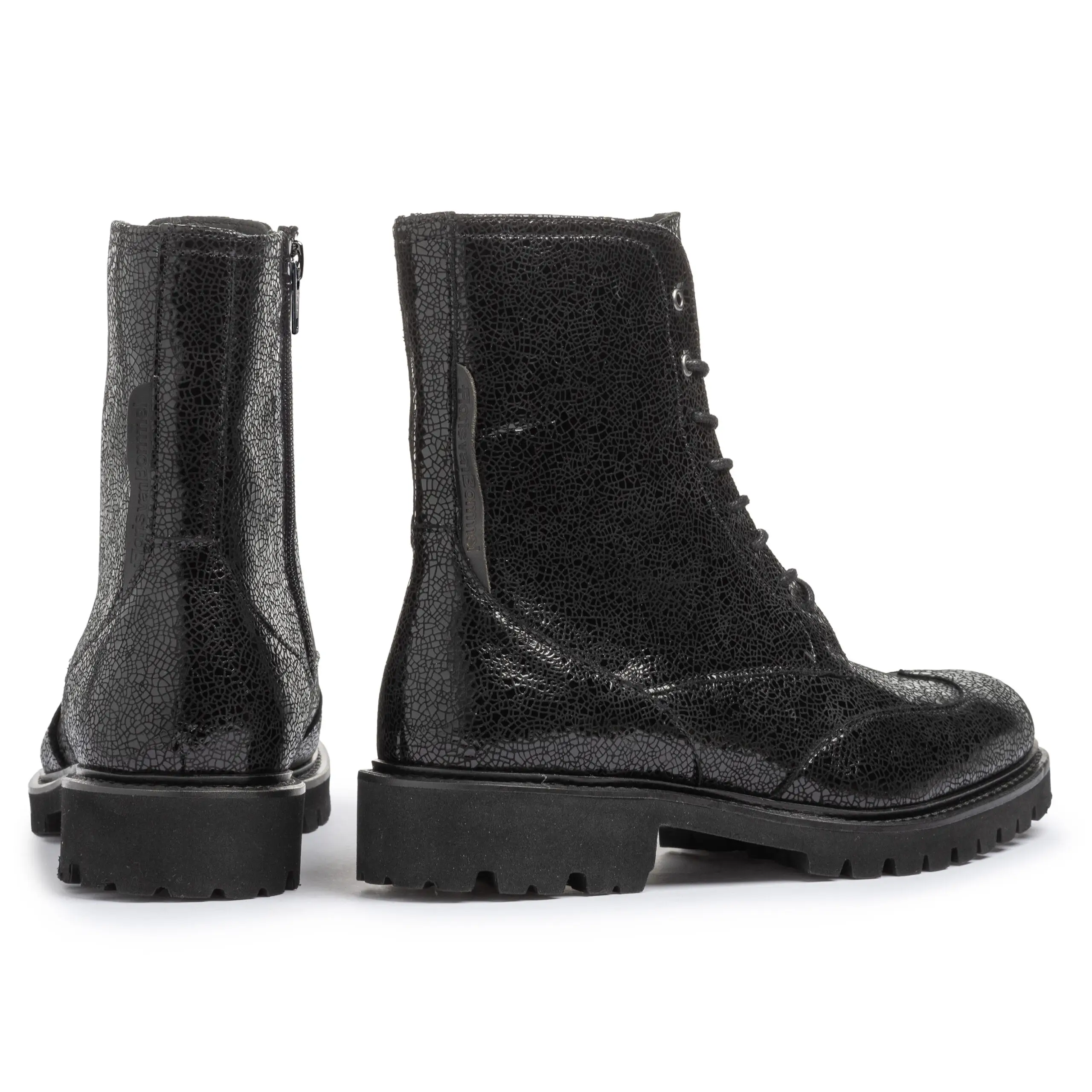 Deze enkelboot is uitgevoerd met een profielzool die gemaakt is van super licht EVA materiaal. In combinatie met het uitneembare voetbed zorgt dit voor een comfortabele en soepele schoen. Het voetbed is eventueel te vervangen voor een eigen voetbed of steunzool. Aan de binnenkant van de schoen is een rits voorzien zodat niet elke keer de veters losgemaakt hoeven te worden bij het in- en uitstappen. Bij de enkel is een lederen inzet geplaatst met het Floris van Bommel logo. De schoen is gevoerd met topkwaliteit voering van dun geitenleer. Het bovenwerk is gemaakt van glanzend zwart leer met een fijn craquelé effect.