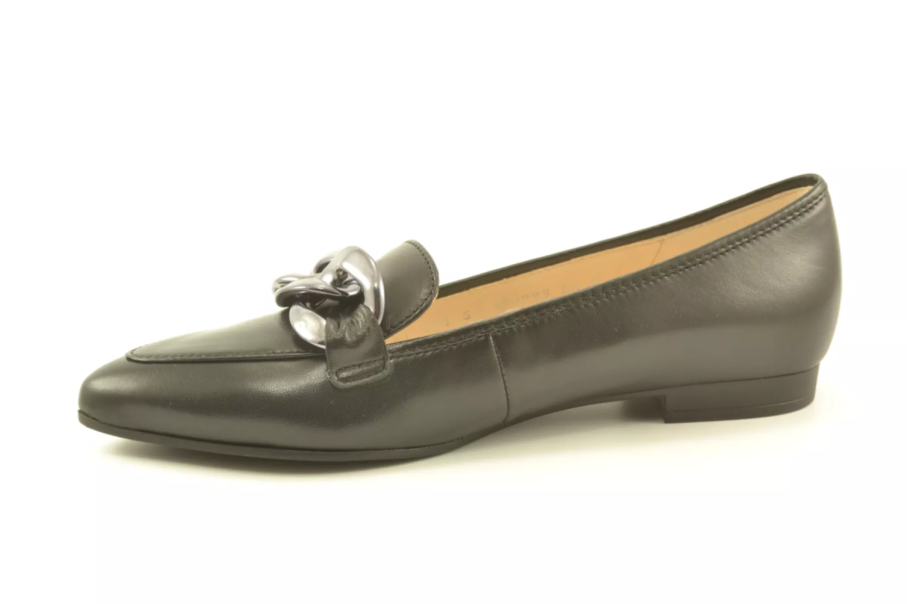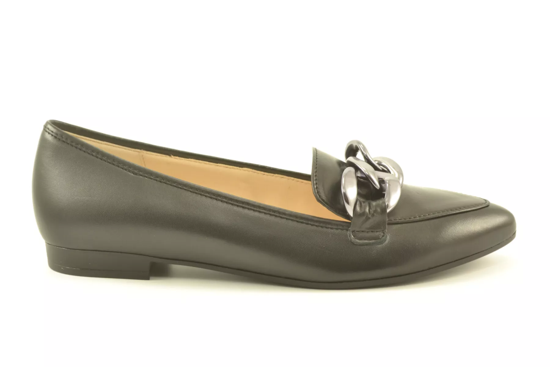 details: een mooie zwart leren instapper met spitse leest en een mooi ketting- detail op de voorvoet