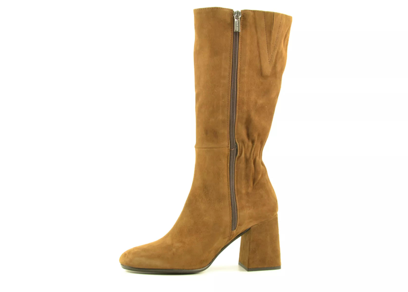 details: een mooie effen bruin suede laars met stevige beklede blokhak. Deze laars is rond de enkel iets ingenomen voor een extra vrouwelijke look. zool. Mooi door zijn eenvoud. De neus met spiegel en subtiele carré maakt dit laarsje helemaal af.