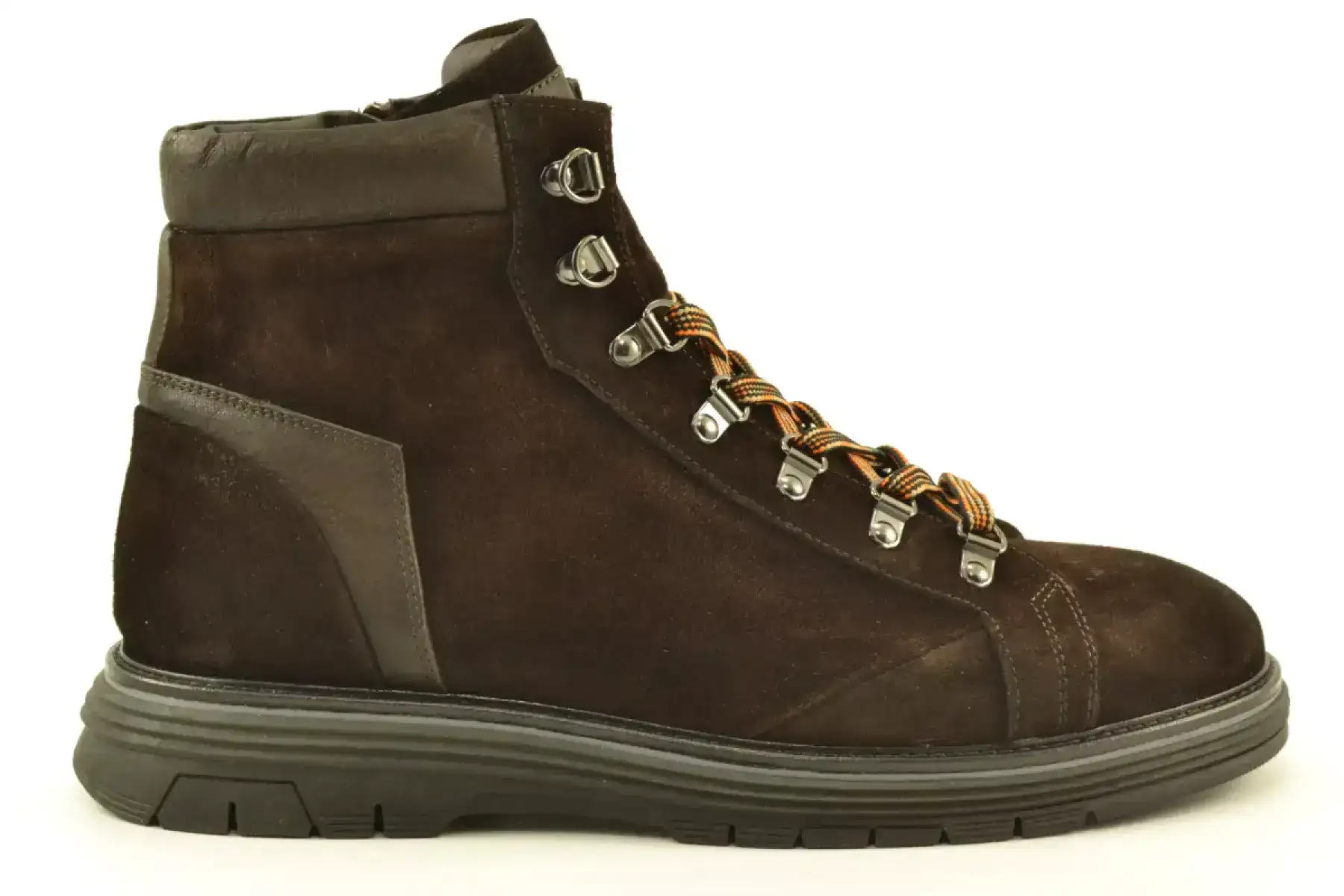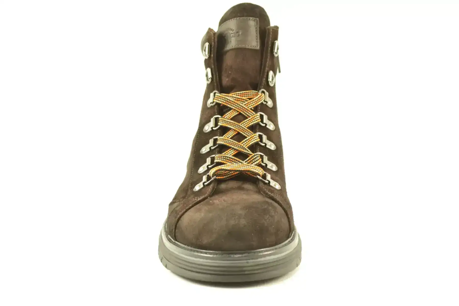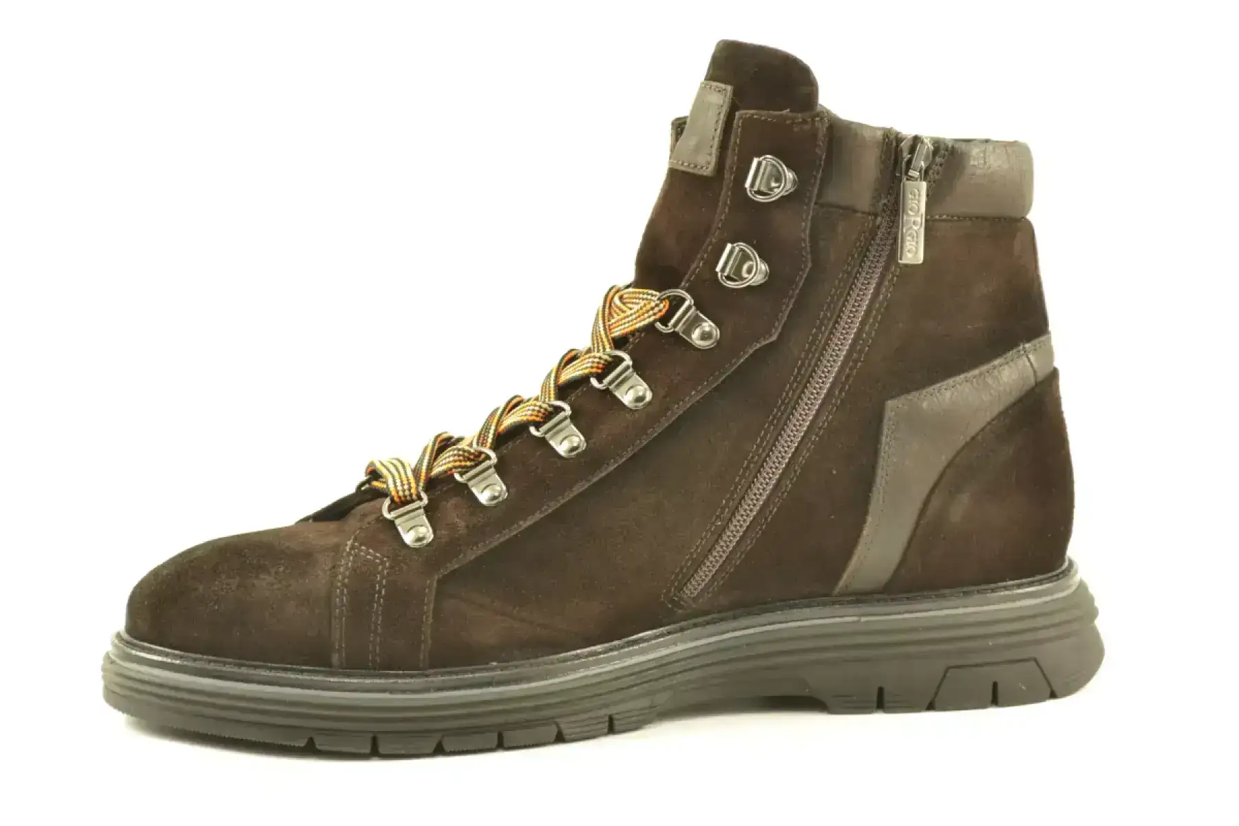 details: Het Italiaanse merk Giorgio geeft altijd een nette twist aan zijn schoenen. Deze mooie stoere donkerbruin suede veterboot heeft een eyelet vetersluiting met gekleurde veter met een knipoog naar de snowboot.