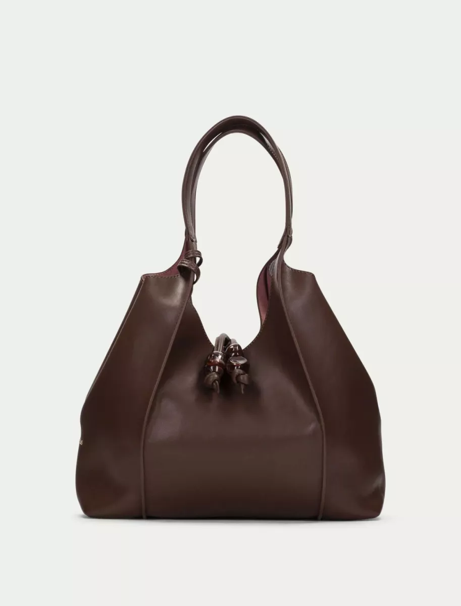 Shopper-style bag made of PU leather. Drawstring closure with rhinestone embellishment. Includes an interior toiletry bag.