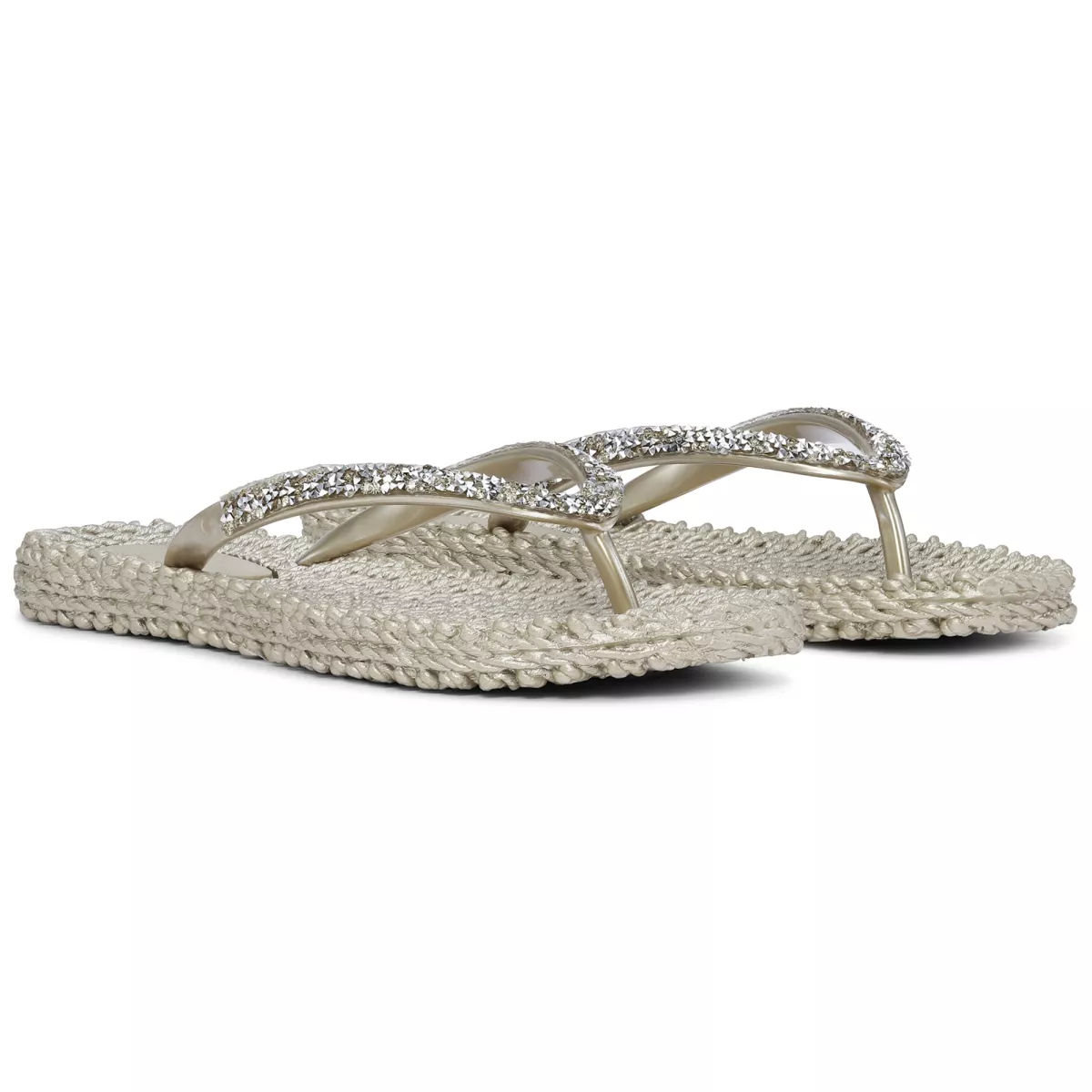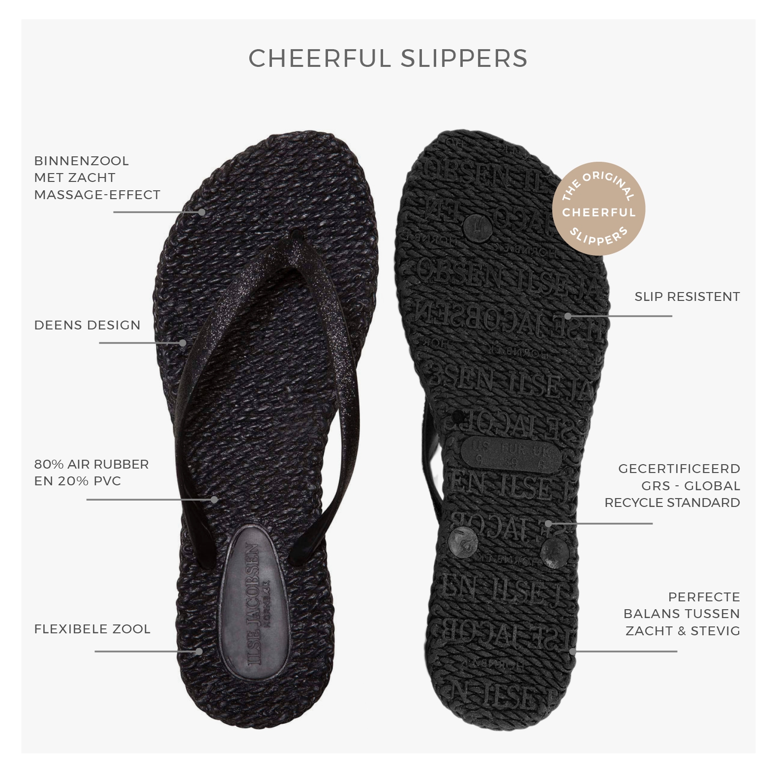 Dit is de perfecte slipper. Onze Cheerful-slippers worden gemaakt van luchtrubber, met geïnduceerde lucht om ze licht en flexibel te maken. Met hun gedessineerde zool zijn ze heel comfortabel en creëren ze een zacht massage- effect. Deze stijl heeft een luxueuze uitstraling en de bandjes zijn versierd met prachtige glittersteentjes. Ze zijn dus zeker geschikt voor een feestje. Onze slippers zijn een absolute must, want door hun comfortabele pasvorm en mooie uiterlijk zijn ze perfect voor een strandwandeling of een andere zomerse gelegenheid.