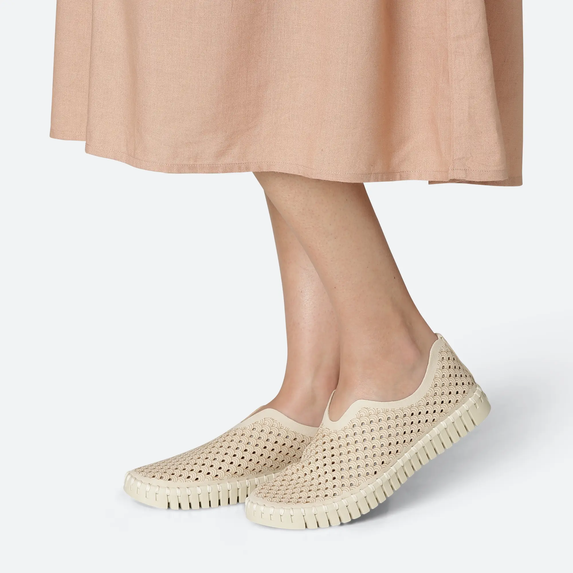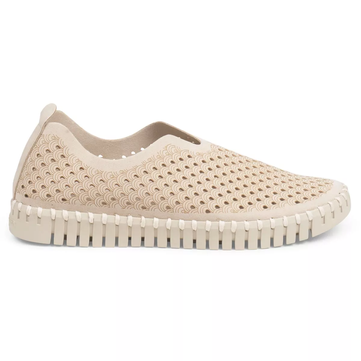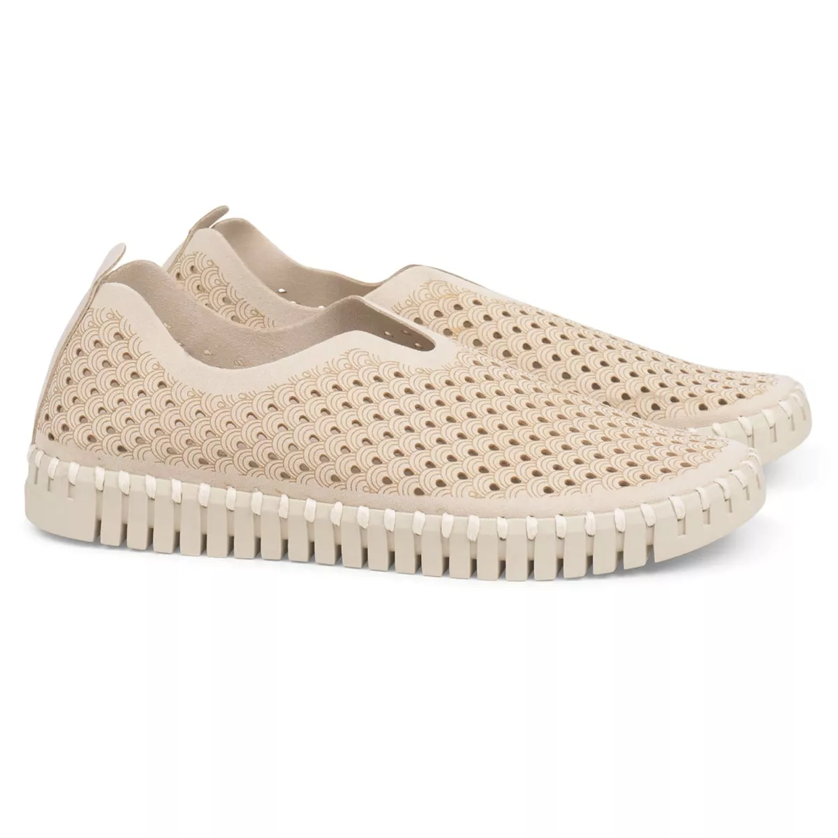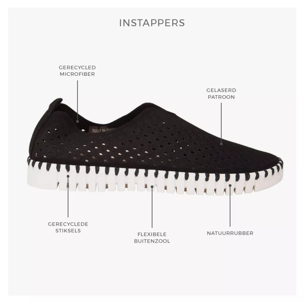 Deze lichtgewicht schoen van Ilse Jacobsen is perfect voor iedere gelegenheid. De schoen is praktisch, zeer comfortabel en heeft een geweldige uitstraling. Met zijn flexibele buitenzool van natuurlijk rubber en ademende bovenkant met gelaserd gaatjespatroon is het de perfecte instapper voor op reis. De schoen is gemaakt van gerecycled microvezel. Bij de productie is geen lijm gebruikt. Deze coole en praktische instapper is een absolute musthave en raakt nooit uit de mode