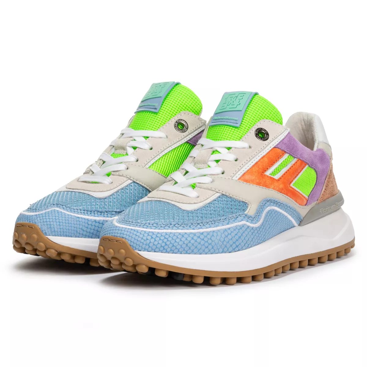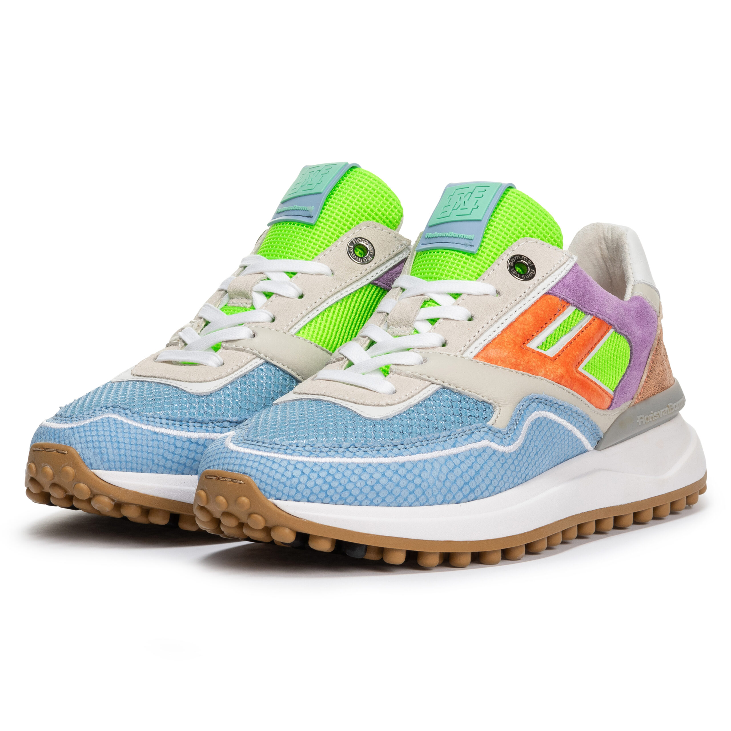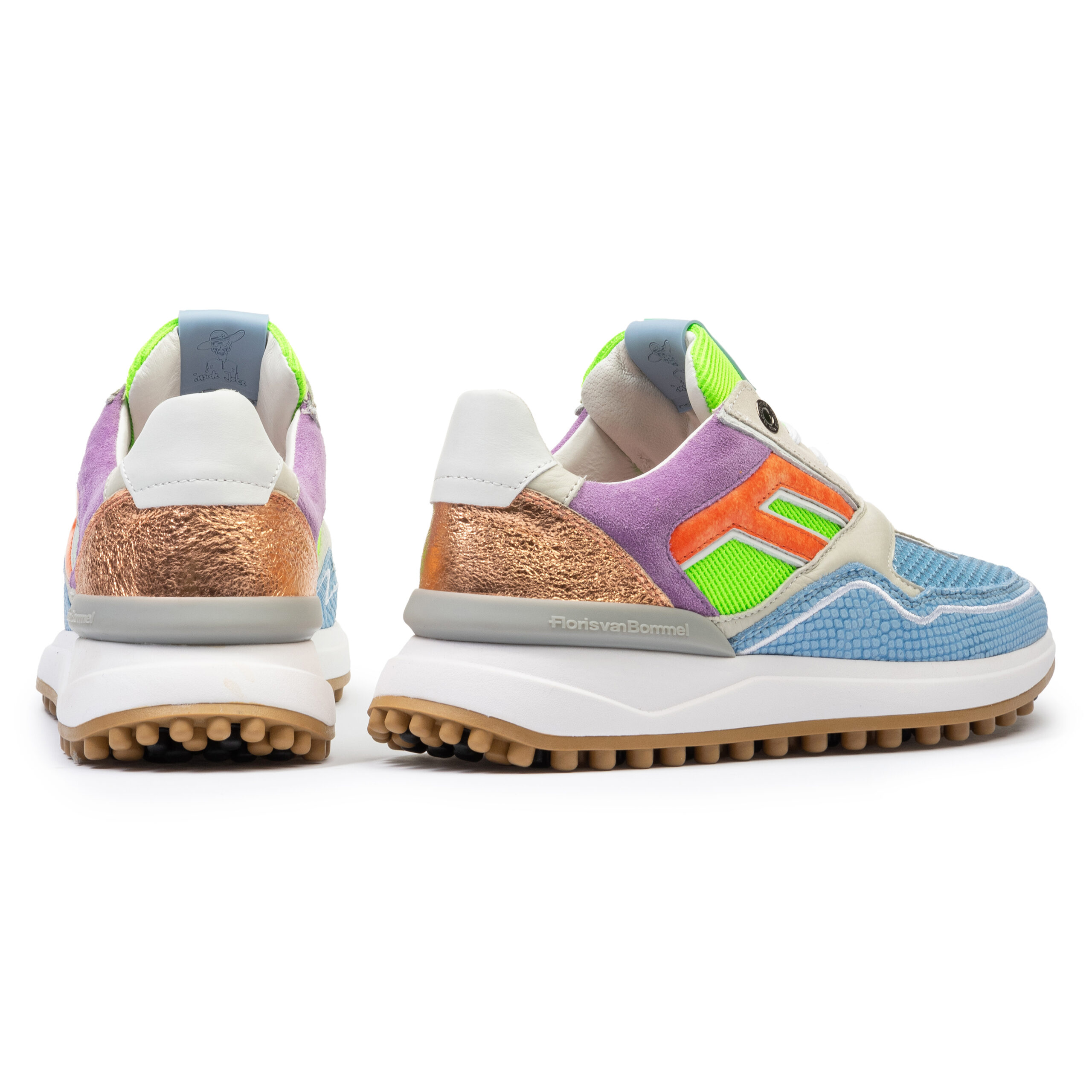 is voorzien van een slijtvast TPU loopvlak met opvallende noppen. In het noppenpatroon is een kleurvlak aangebracht dat de zool nog net wat meer eigen maakt. Draagcomfort is gegarandeerd dankzij een zorgvuldig ontworpen leest, hoogwaardige lederen voering en een uitneembaar voetbed. Deze sneaker is uitgevoerd in een rijke materialenmix. Het FXB logo op het tonglabel is een eerbetoon aan Floris zijn betovergrootmoeder die ruim 100 jaar geleden ook al schoenen maakte.