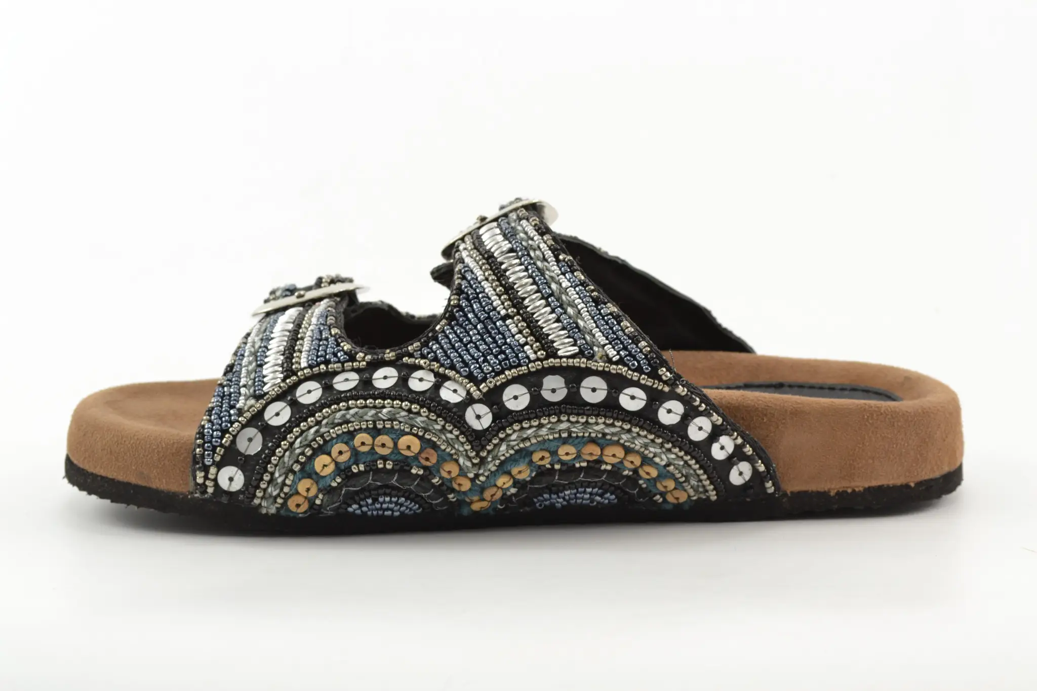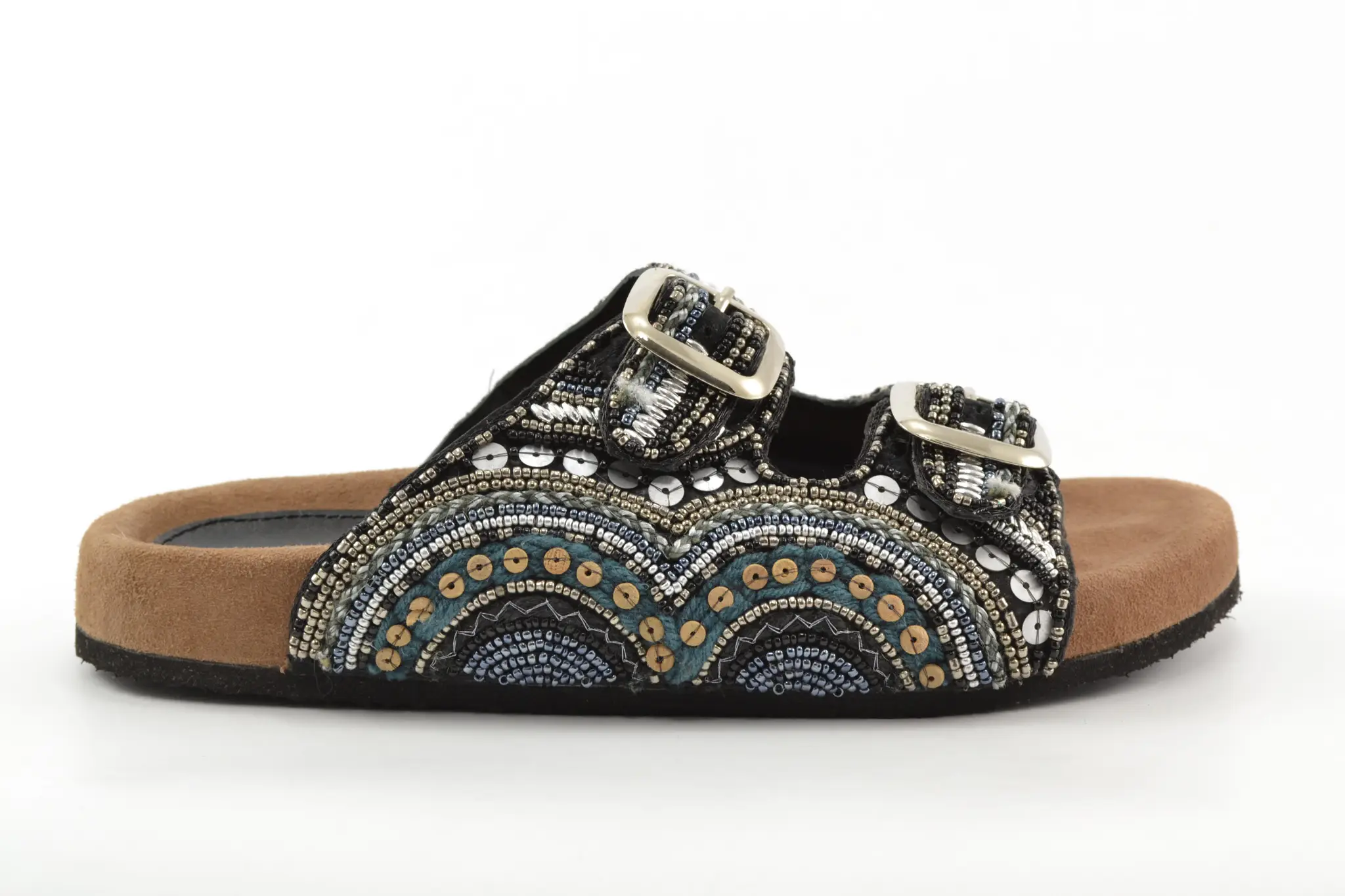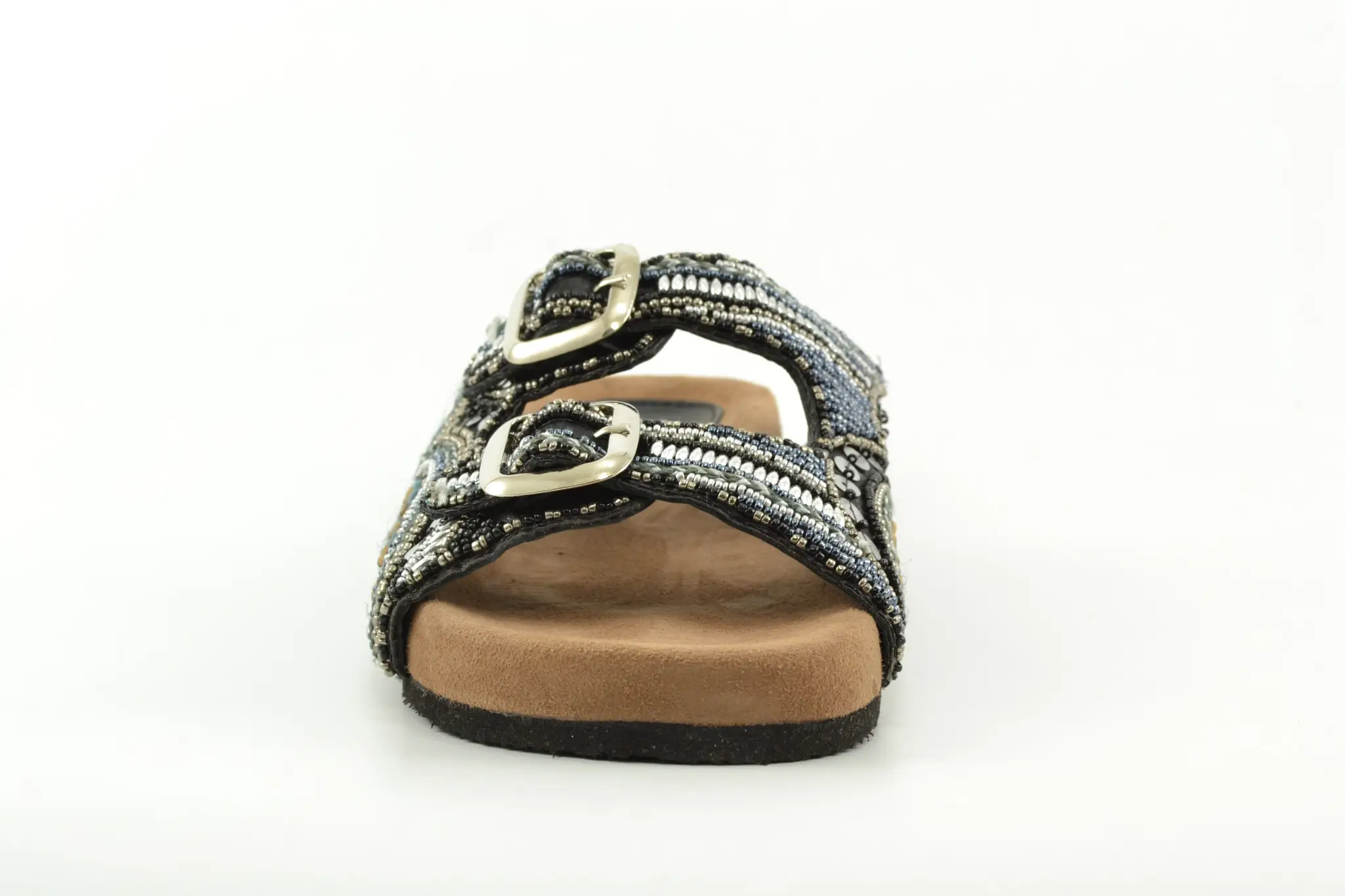 Time to paint your nails! Deze vrolijke dames slippers van het merk Lazamani zijn bezet met zwarte en zilverkleurige kraaltjes. Met deze sandalen breng je kleur aan je voeten. Laat de zomer maar komen!