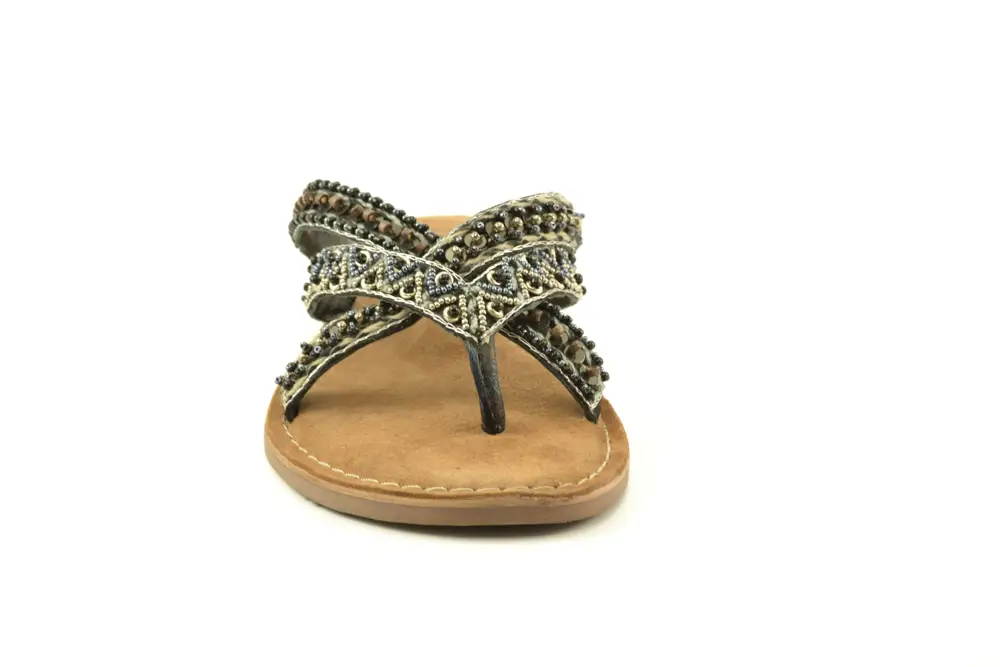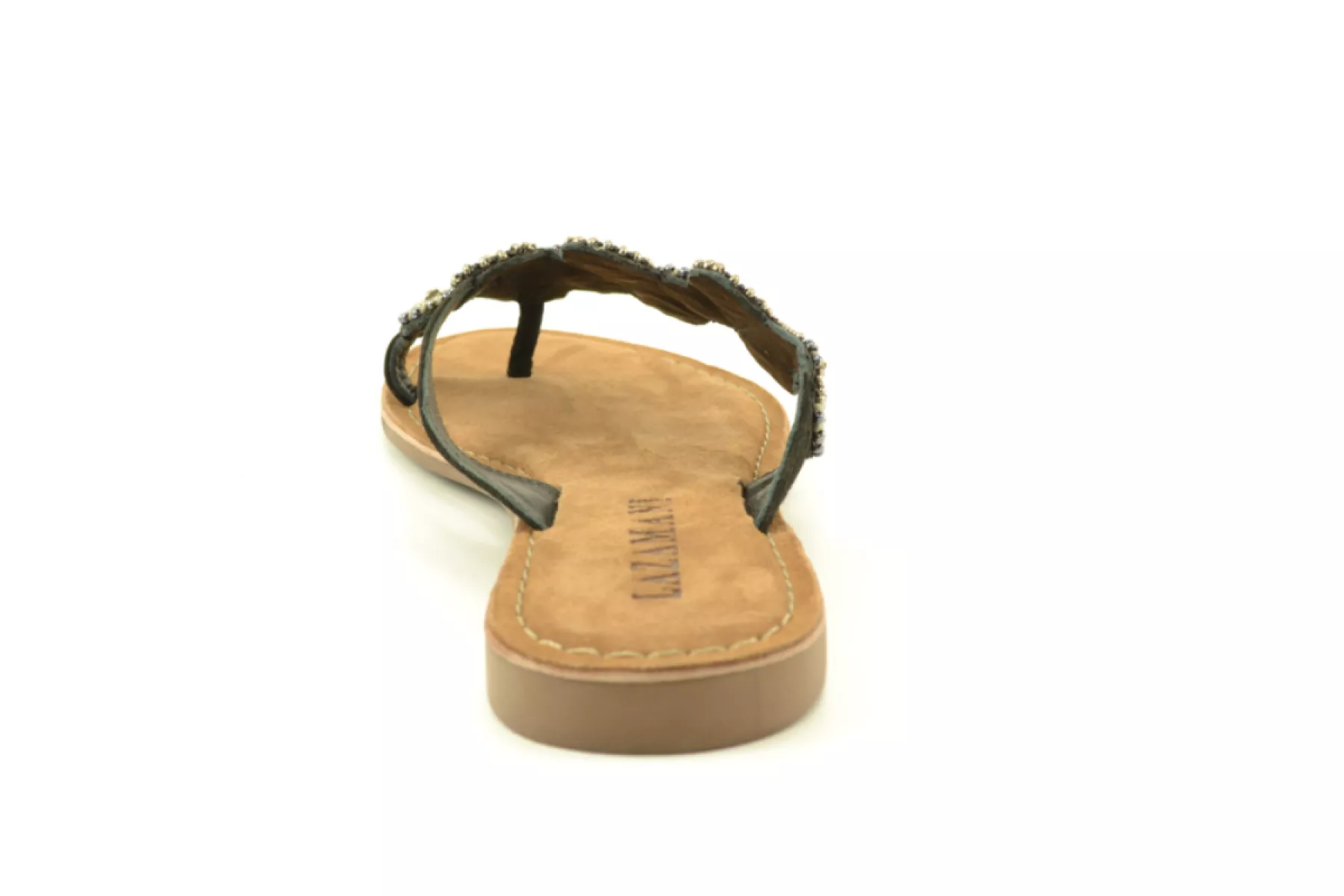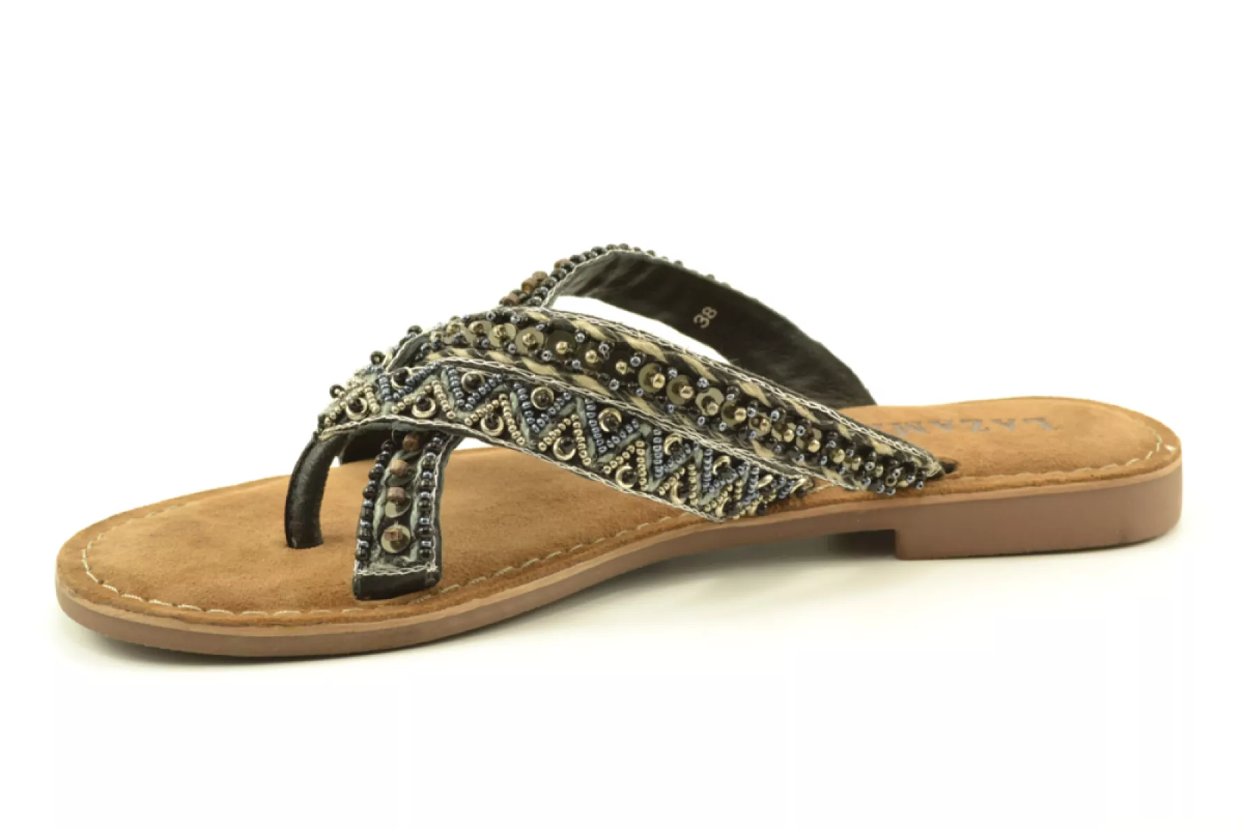 details: mooie leren teenslipper met zwart-zilveren kraaltjes op de bandjes van het merk Lazamani. Deze slipper is een musthave voor dit zomerseizoen