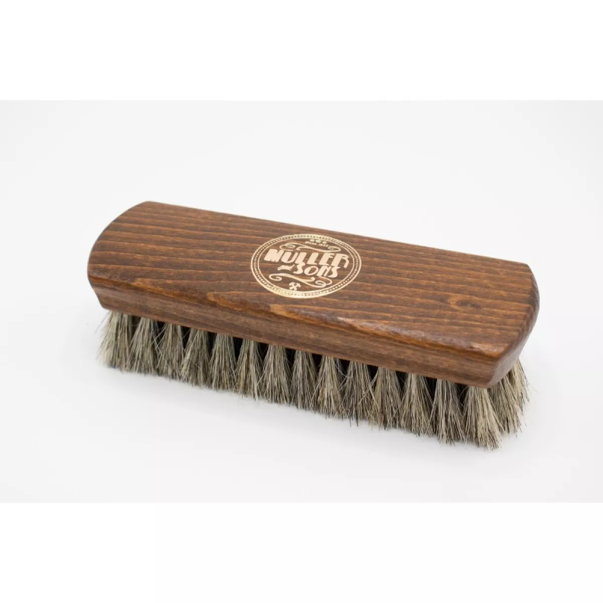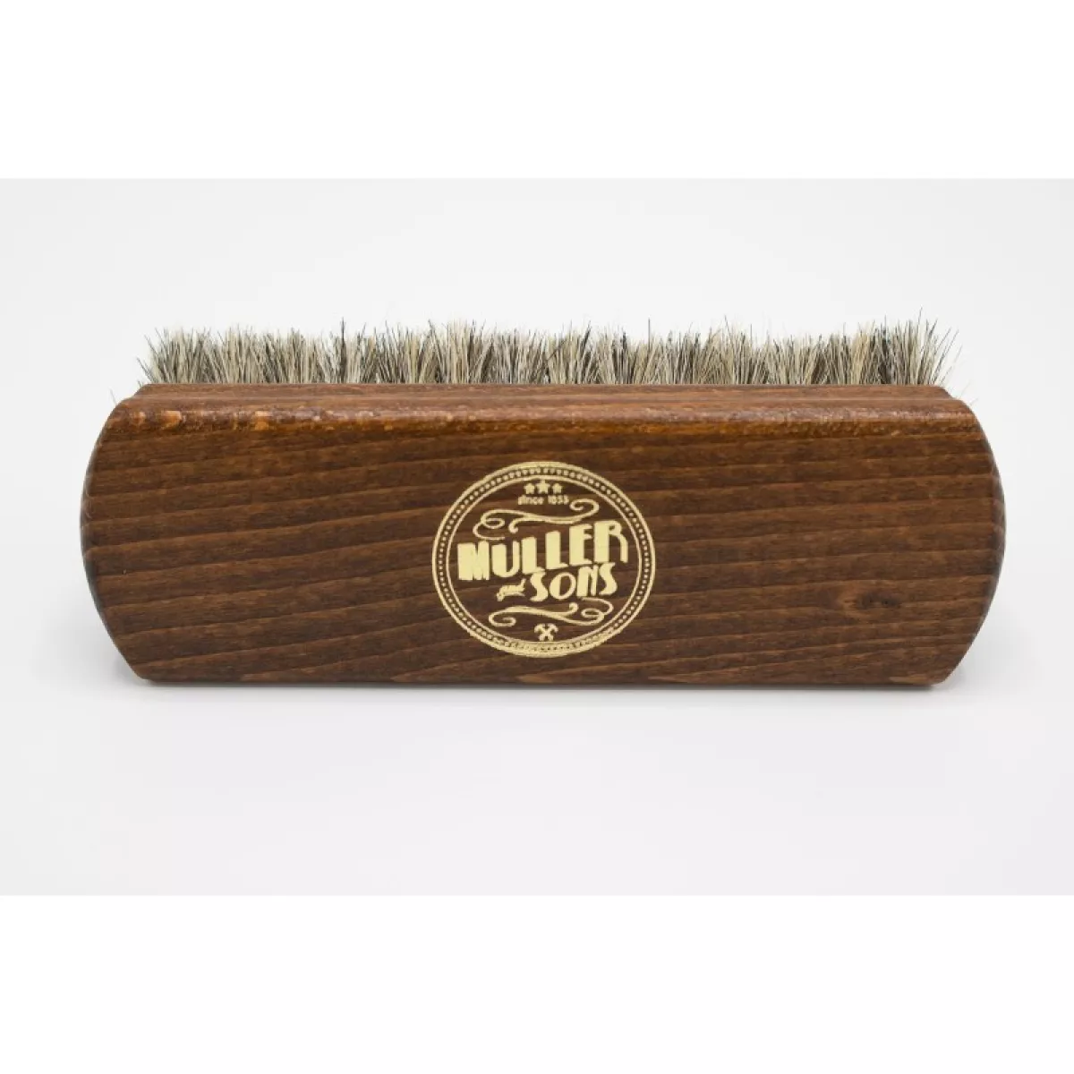 Glad leer uitpoetsen met de Muller & Sons luxe uitwrijfborstel zorgt voor een extra glanzend resultaat. De uitwrijfborstel is gemaakt van 100% paardenhaar, deze borstel is extra zacht en hierdoor geschilt voor het uitwrijven van luxere en gevoelige leersoorten.