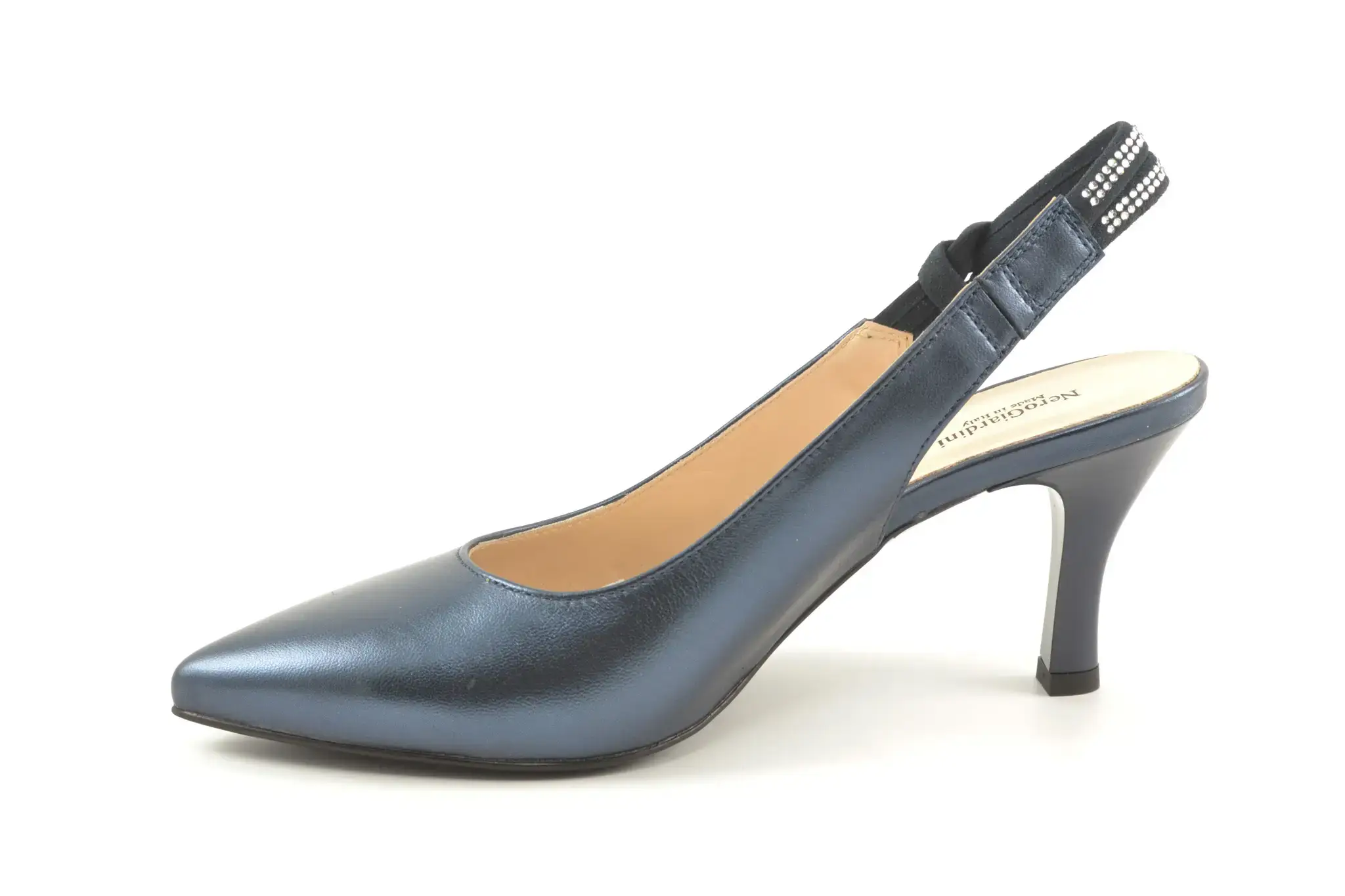 details: “made in Italy”en deze tekst mag een fabrikant alleen gebruiken als alle onderdelen van de schoen ook echt uit Italié komen. En dat zie je aan de luxe uitstraling van deze mooie feestelijke pumps met open hiel en dichte teen, spitse neus en strass op het hielbandje. Perfect te combineren bij je zomerse outfit!