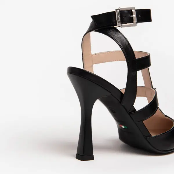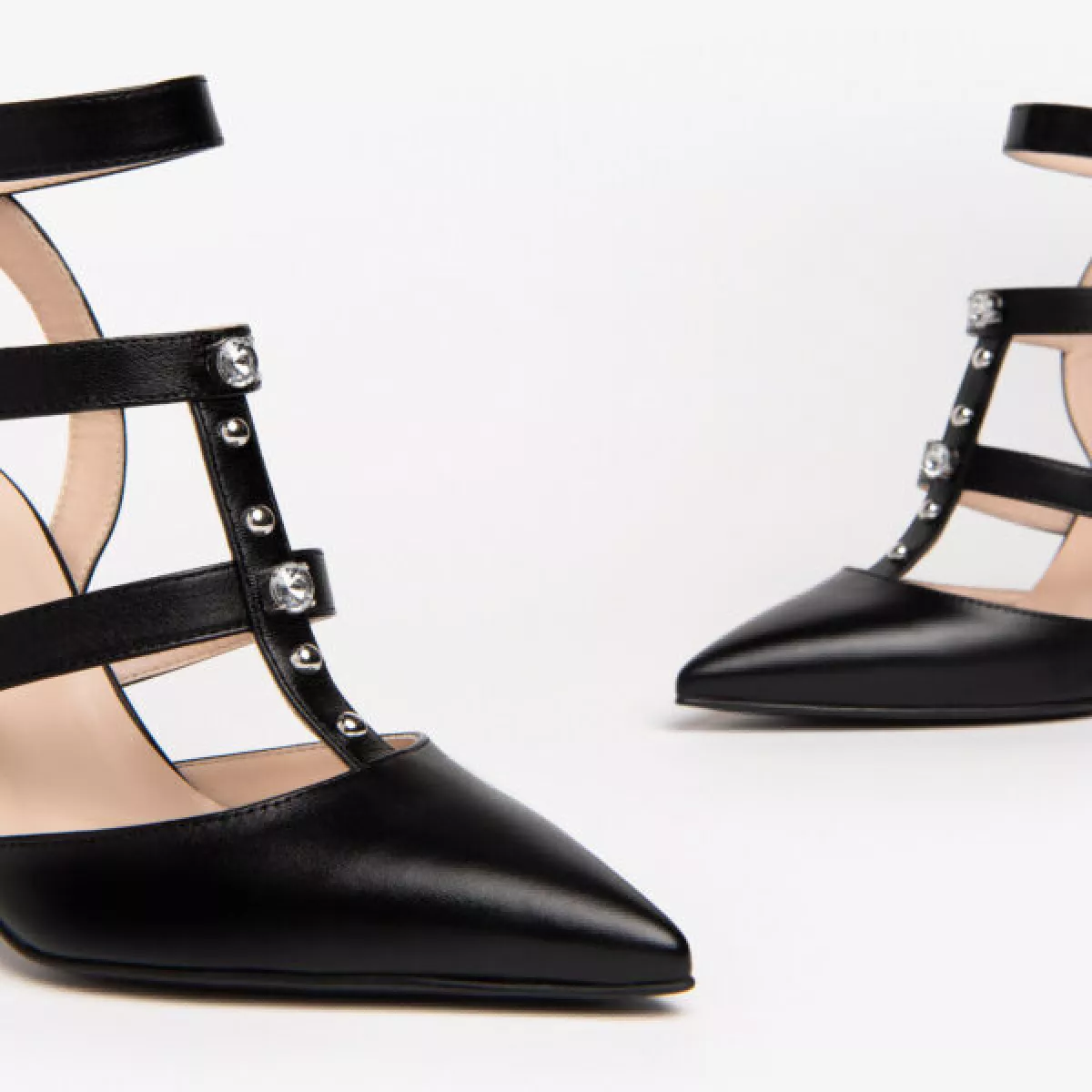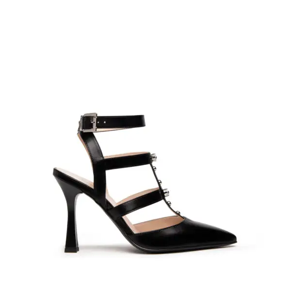 details: “made in Italy”en deze tekst mag een fabrikant alleen gebruiken als alle onderdelen van de schoen ook echt uit Italié komen. En dat zie je aan de luxe uitstraling van deze mooie stoere pumps met open hiel en dichte teen, spitse neus en zilverkleurige studs en strass op de wreef. Perfect te combineren bij je zomerse outfit!