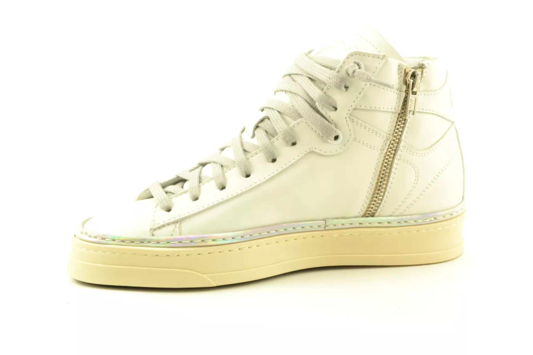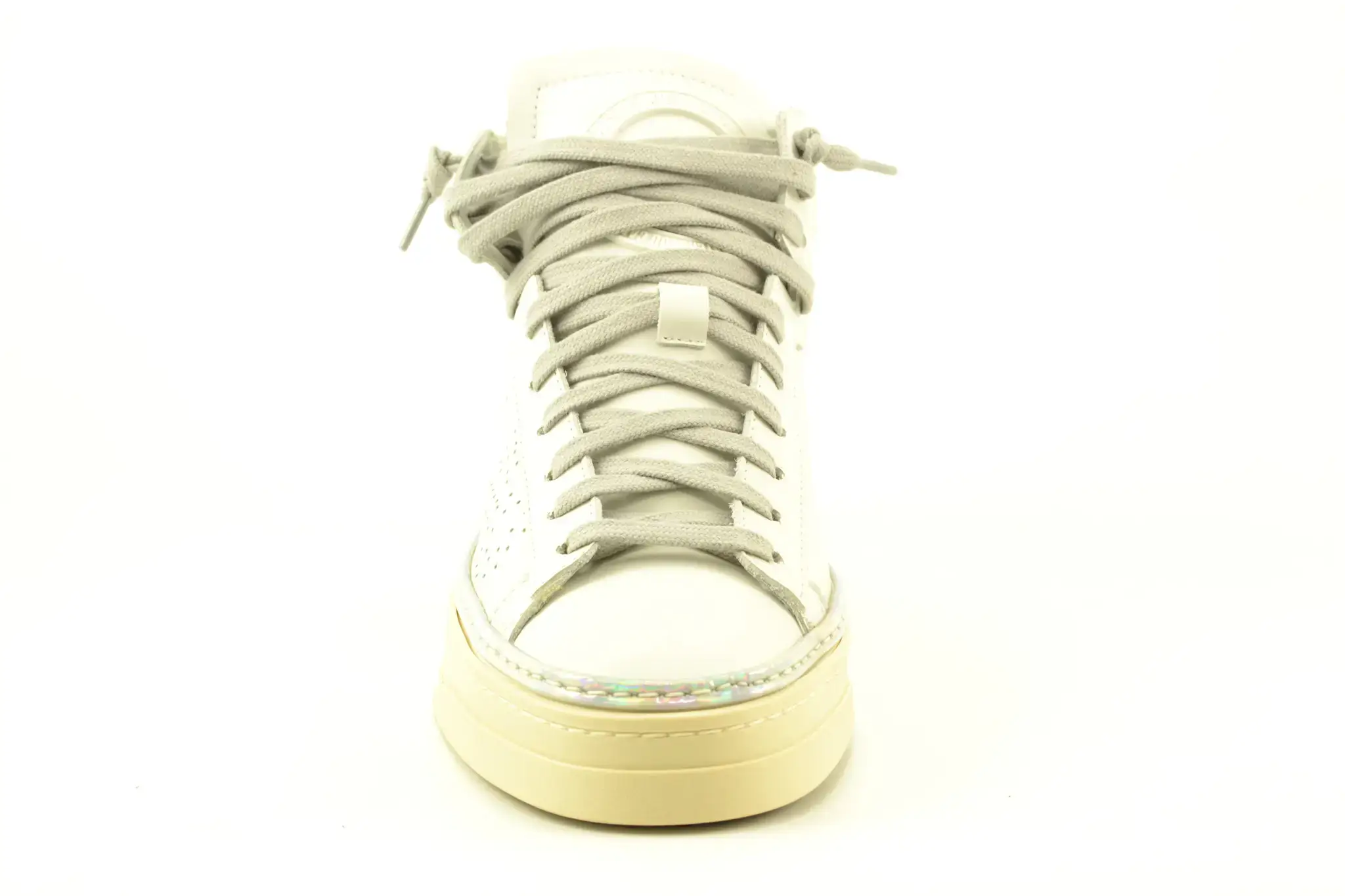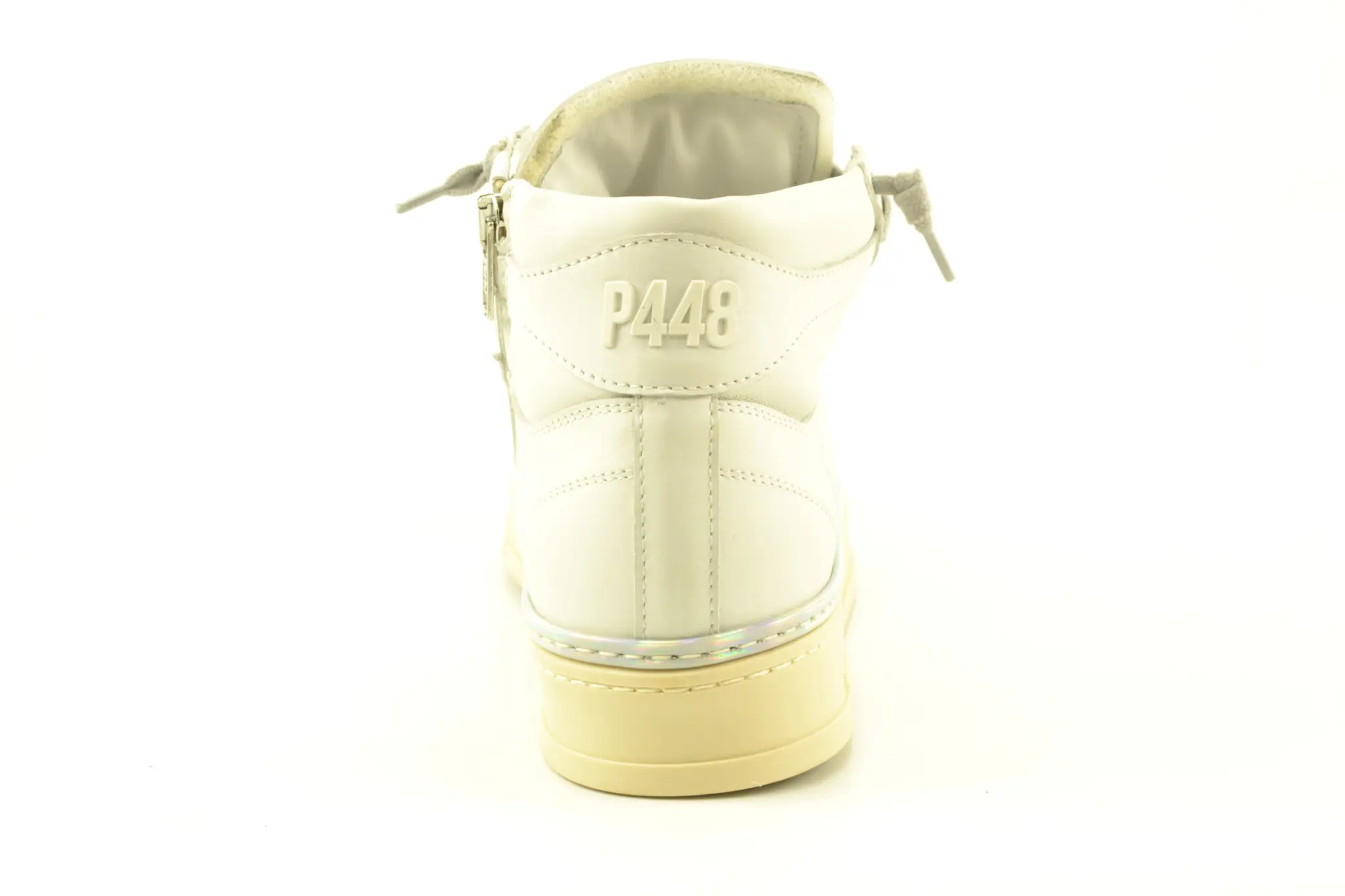 P448 is luxe streetwear van Italiaanse bodem. De schoenen van dit luxe merk zijn vintage en modern tegelijk en zijn gemaakt van rijke materialen met stilistische details. Dit unieke sneaker model Taylor heeft een casual bovenwerk van wit leer met een paneel op de hiel die afgewerkt is met een merkopdruk, die ook terug te vinden is op de tong. Een opvallend detail is de geperforeerdemetallic disco-zilveren rand langs de zool maakt deze mid sneaker helemaal af.