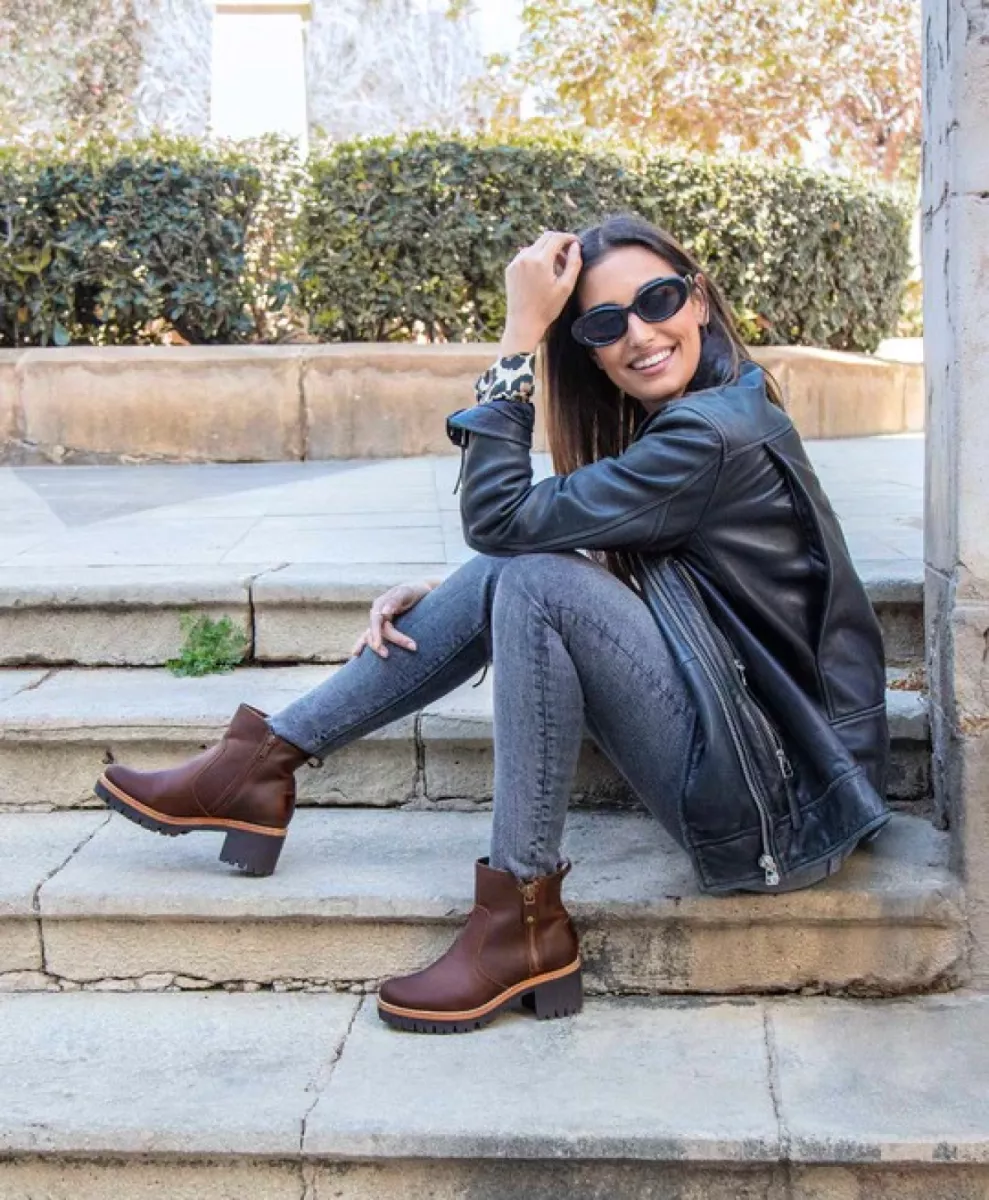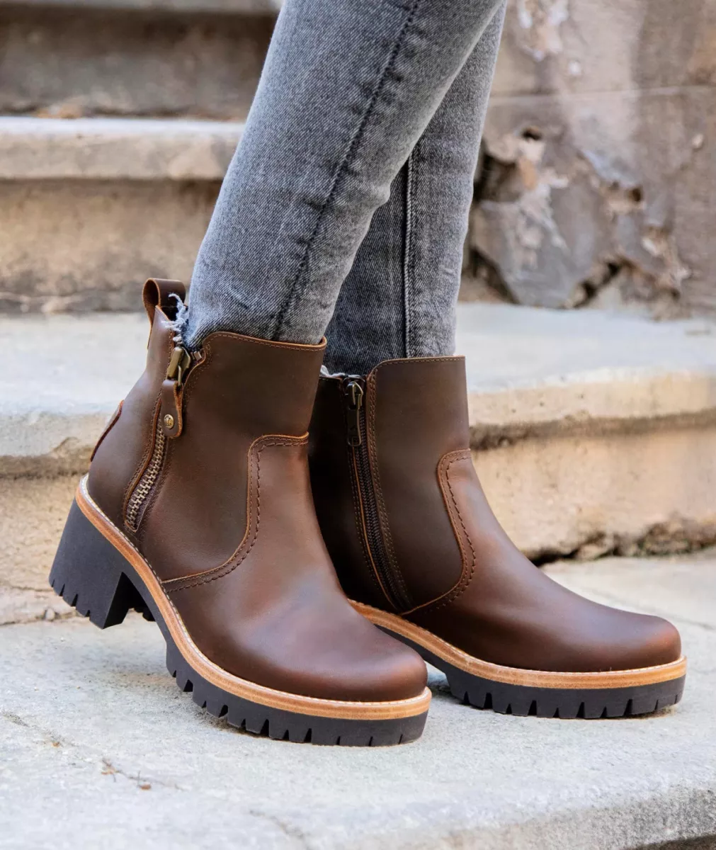 Dames enkellaarsje met hak. Waterdicht. Bruin geolied leer. Ritssluiting. leren voering. Uitneembare anatomische binnenzool’. Flexibele en duurzame TPU-Rubberen zool. schachthoogte: 11.5 cm. hakhoogte: 7.5 cm. Gemaakt in Spanje