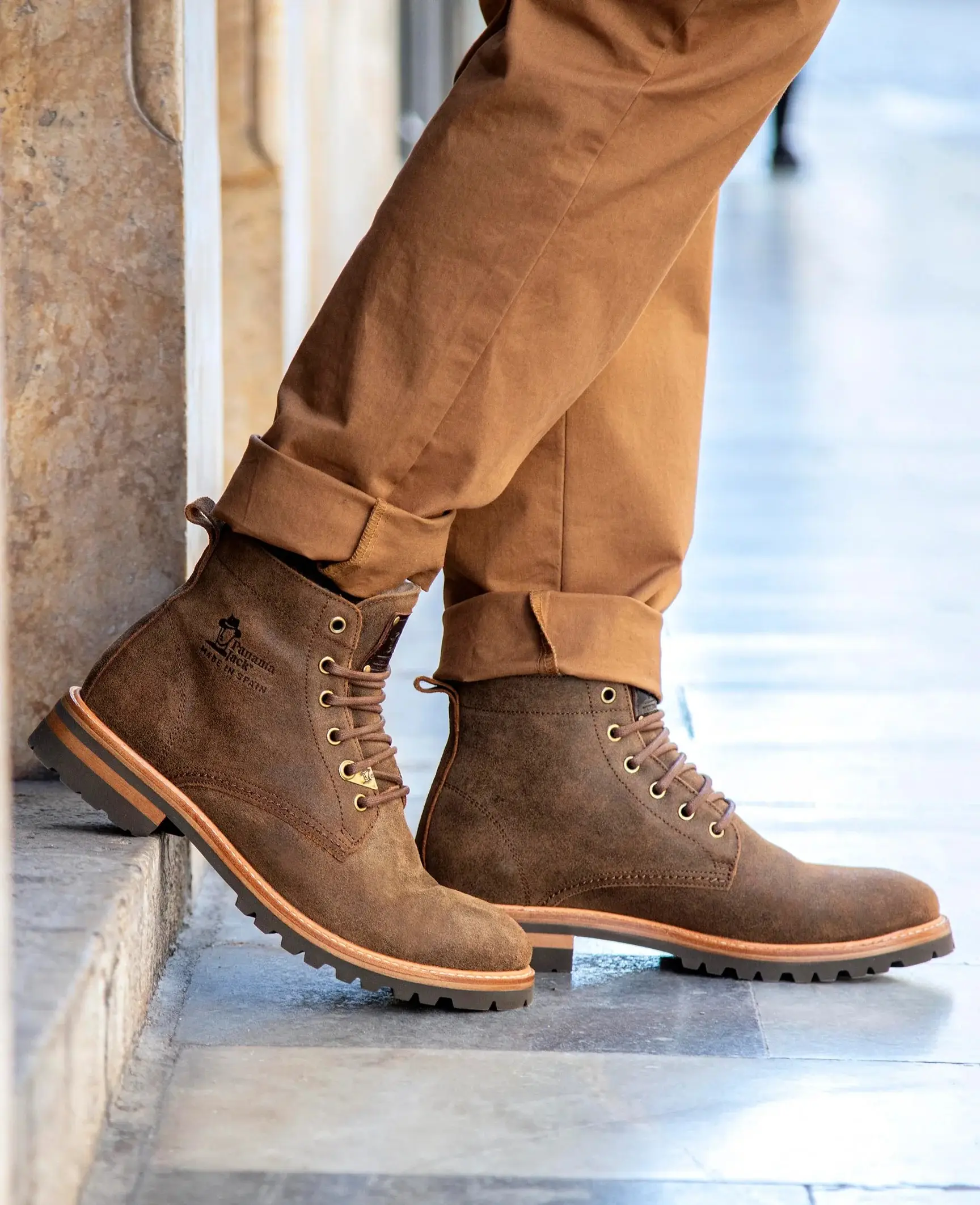 Platte heren enkellaars. Bruin suede. Vetersluiting. Voering van schapenwol. Uitneembare anatomische binnenzool. Natuurlijke, flexibele en duurzame rubberen zool. Schachthoogte: 13 cm. Hakhoogte: 3.8 cm. 100% gemaakt in Spanje.