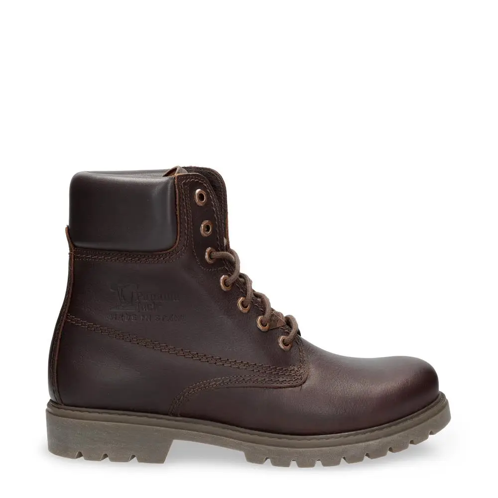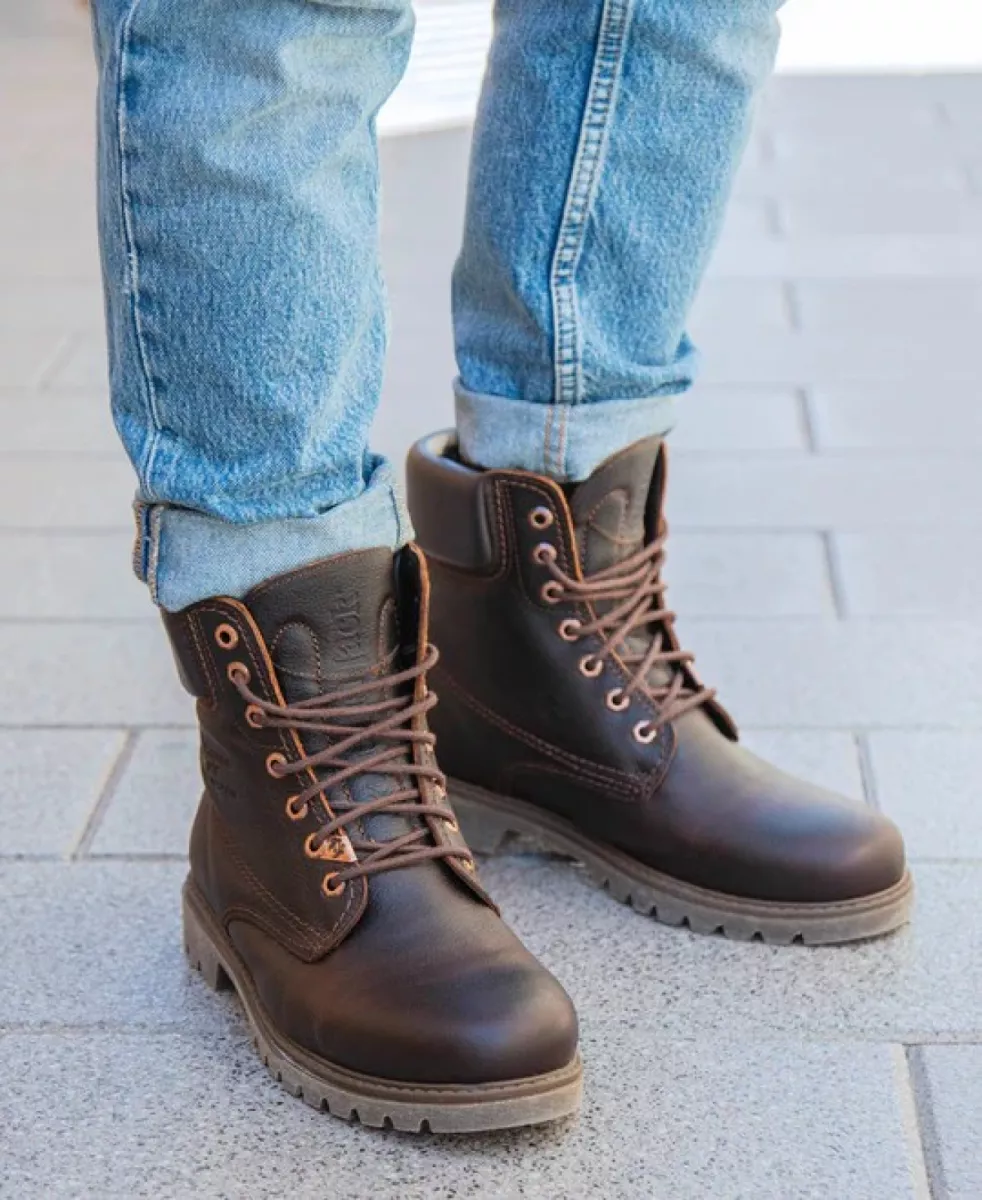 Platte herenlaars. WATERDICHT kastanjebruin nappaleer. Vetersluiting en leren voering. Uitneembare anatomische binnenzool. Natuurlijke, flexibele en duurzame rubberen zool. Schachthoogte: 16 cm. Hakhoogte: 4.5 cm. 100% gemaakt in Spanje.