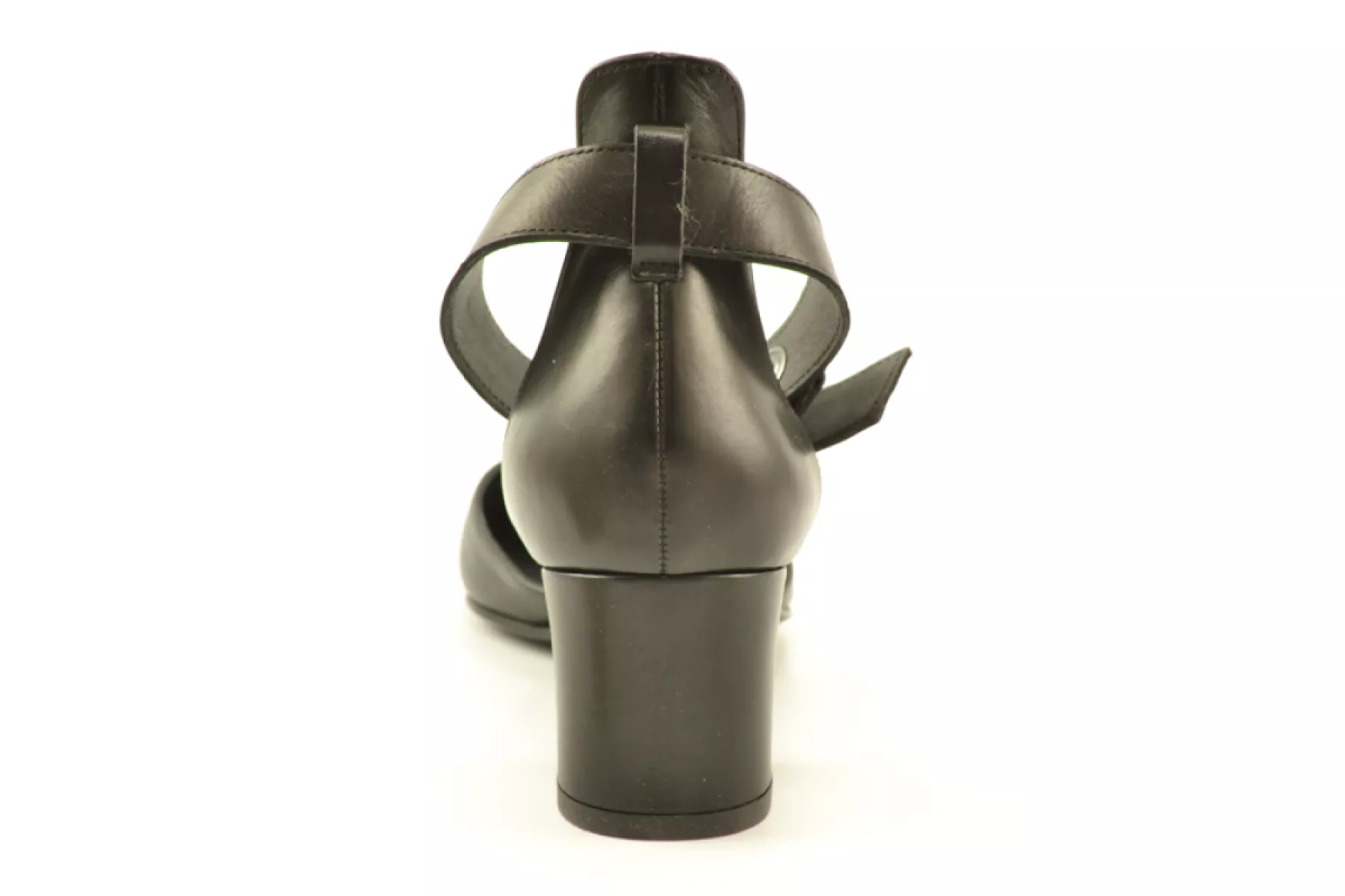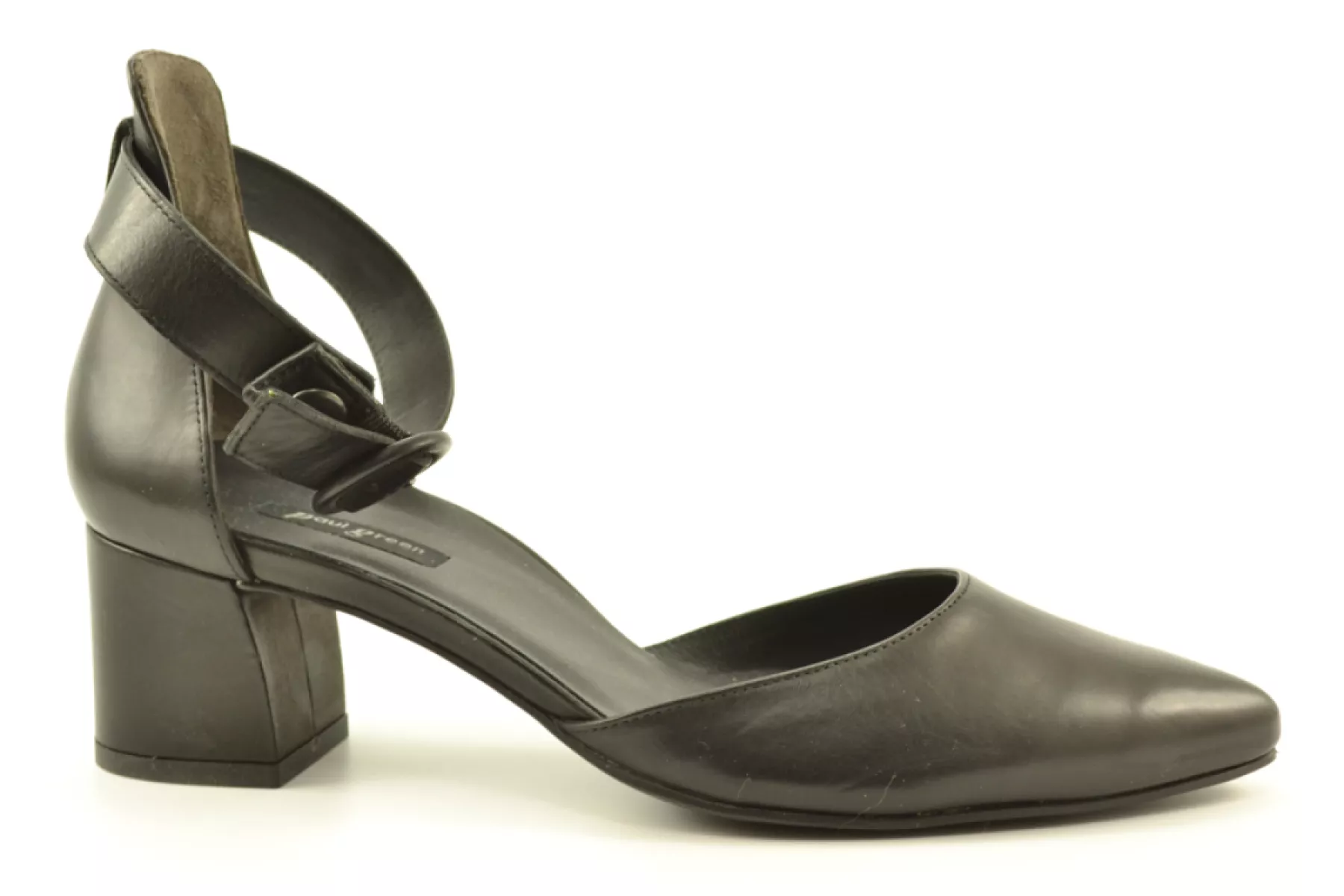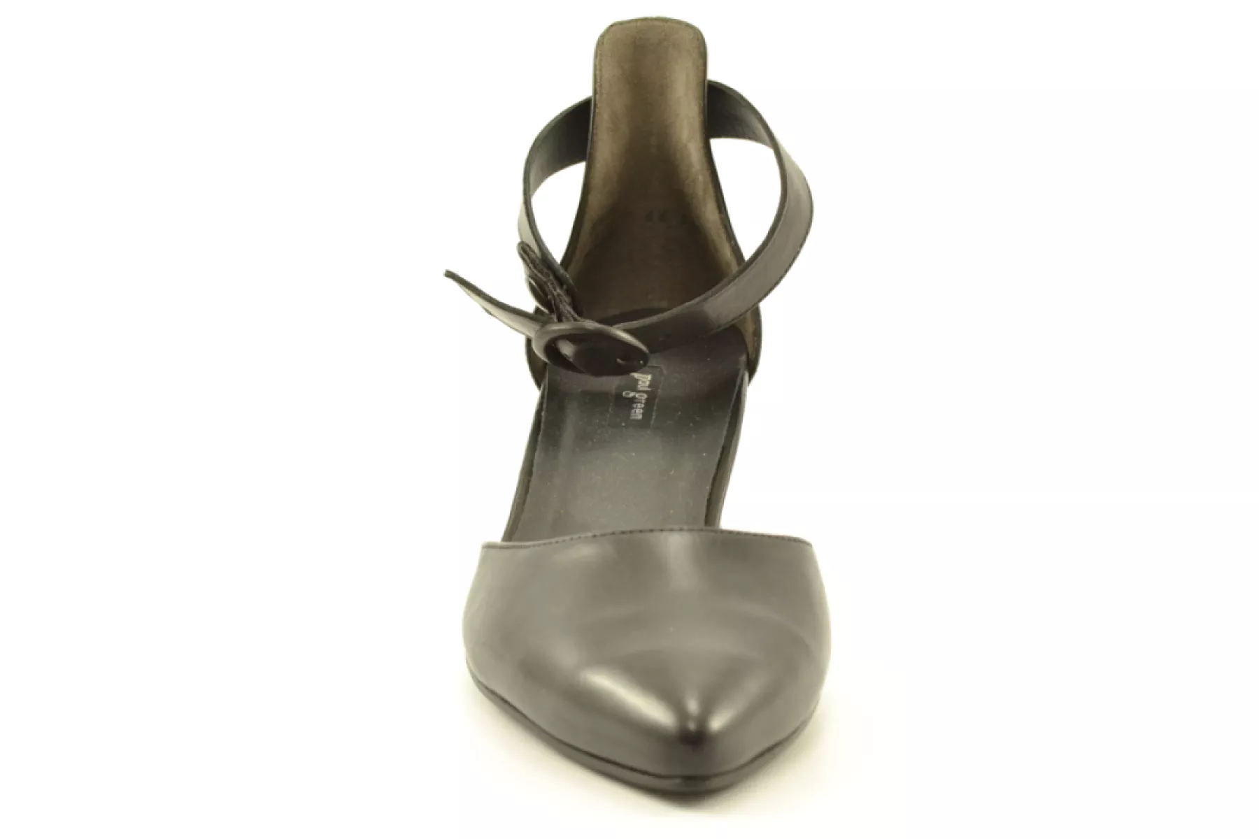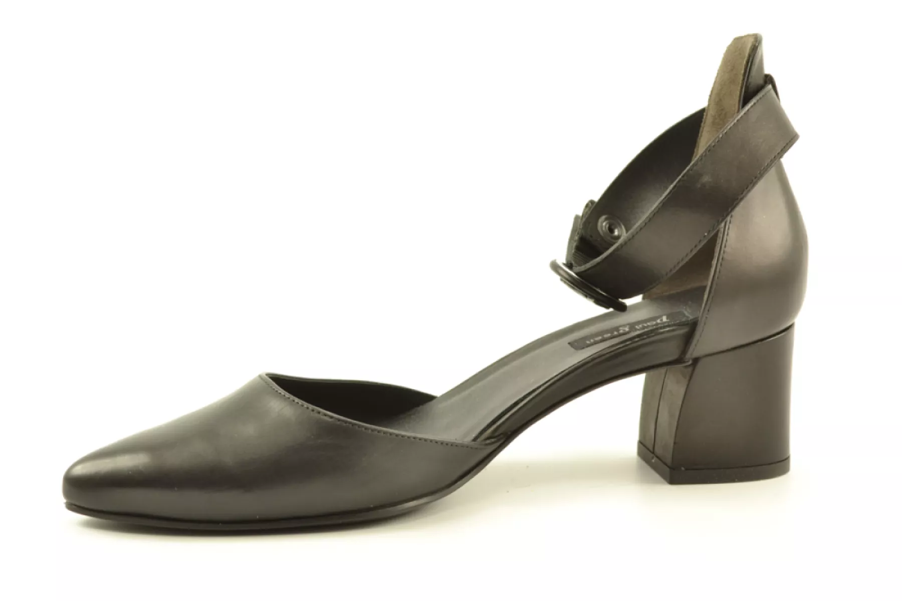 details: mooie zwart leren pump met spits leestje/beklede stevige tussenhak/vrouwelijk/enkelband met beklede gesp en drukker.