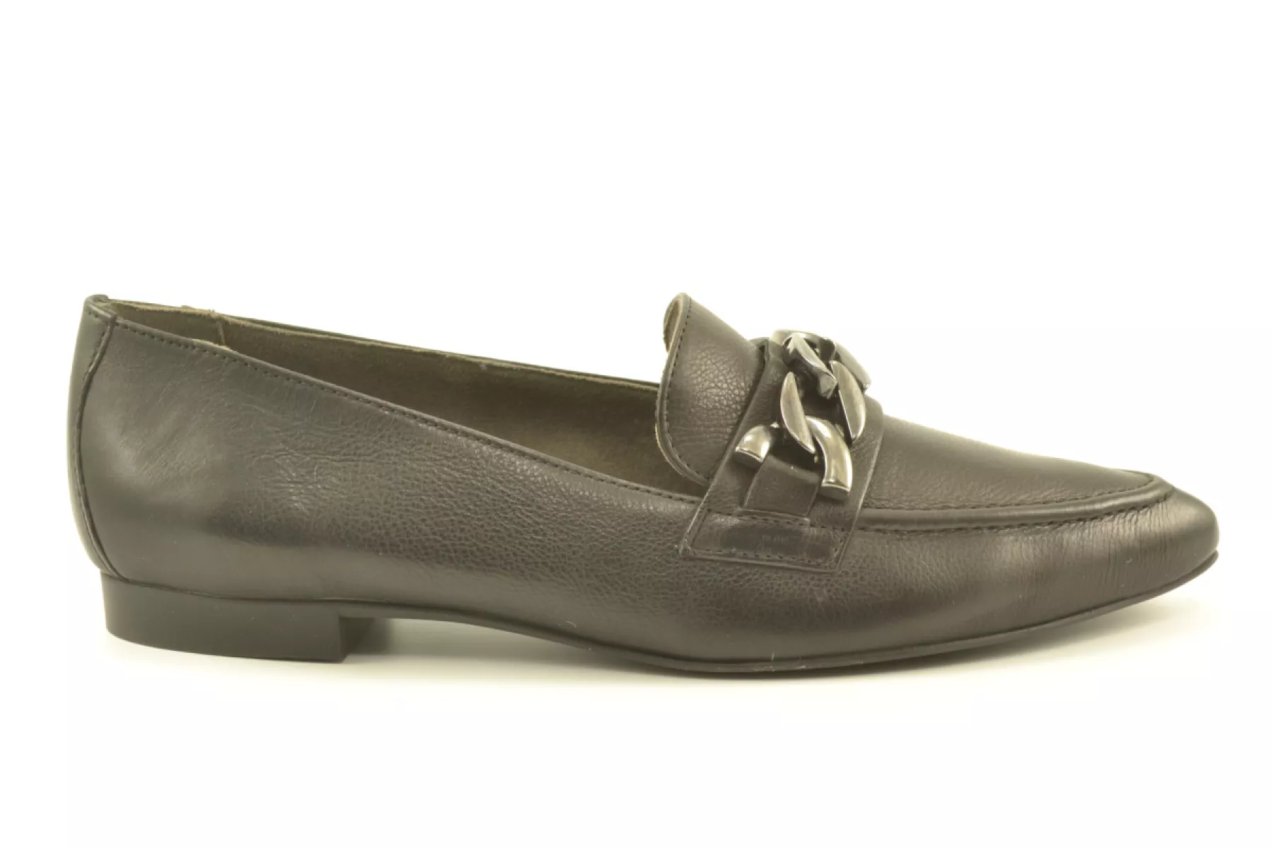 details: een mooie zwart leren instapper met spitse leest en een mooi ketting- detail op de voorvoet