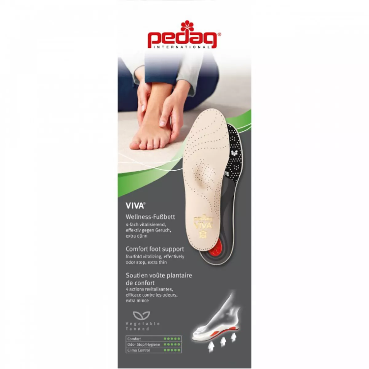 Pedag Viva inlegzool voelbaar door de drie gevoelige zones van de voet met optimale higiëne voor elk seizoen en in iedere schoen. Het eerste klas rundleer zorgt voor een optimaal klimaat in de schoen en het speciale actieve koolstoffilter voorkomt voetgeuren.