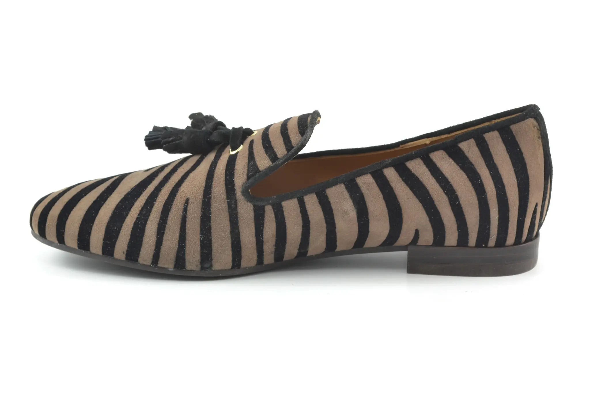details: deze mooie instapper van Pedro Miralles heeft een flosje op de voorvoet en een bruin-zwarte zebra-print