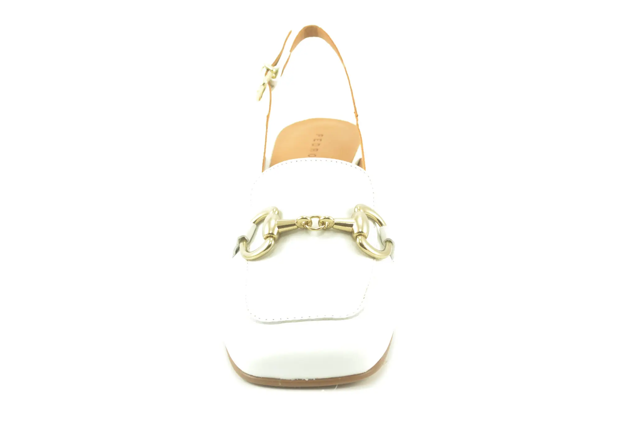 details: deze mooie vrouwelijke wit leren pump heeft een slingback, carré neus, blokhak en zilverkleurig bitje op de voorvoet