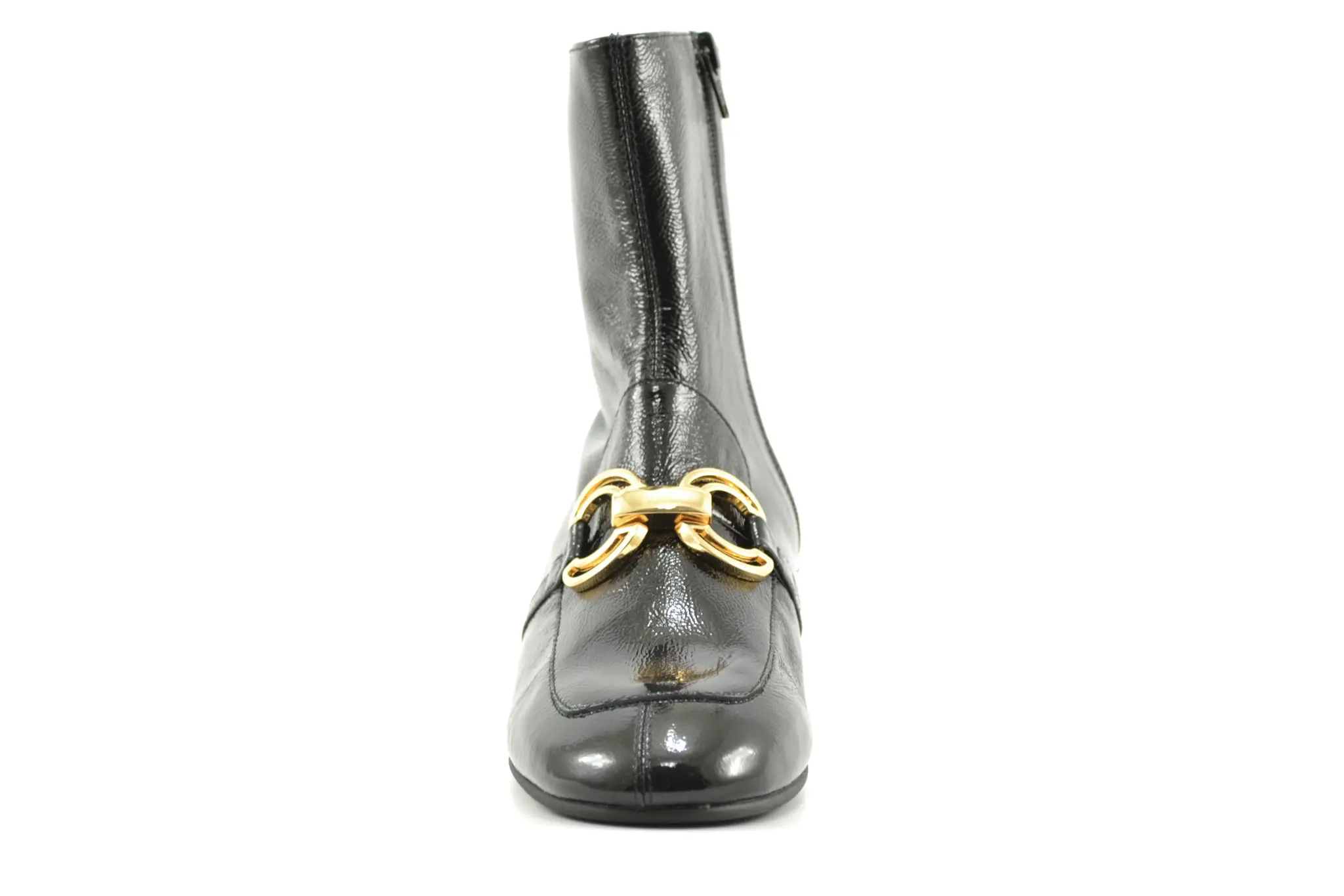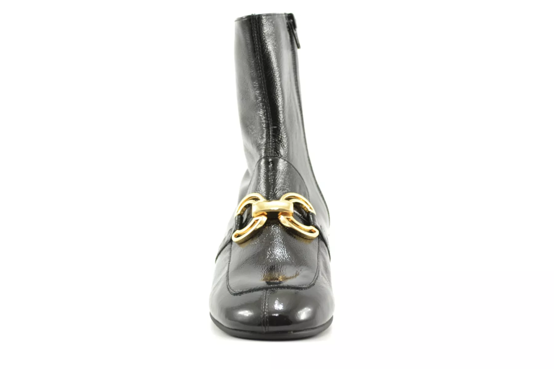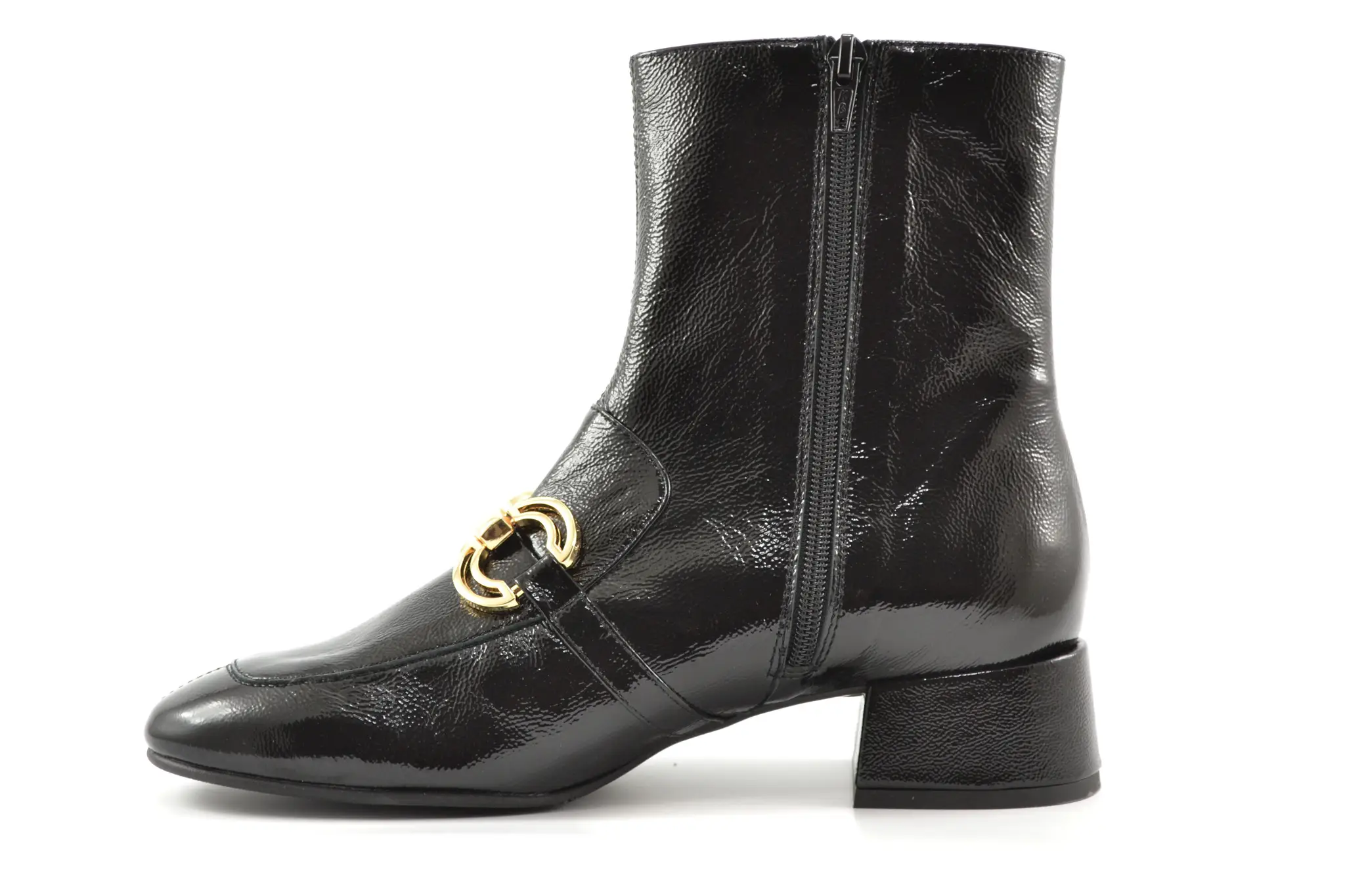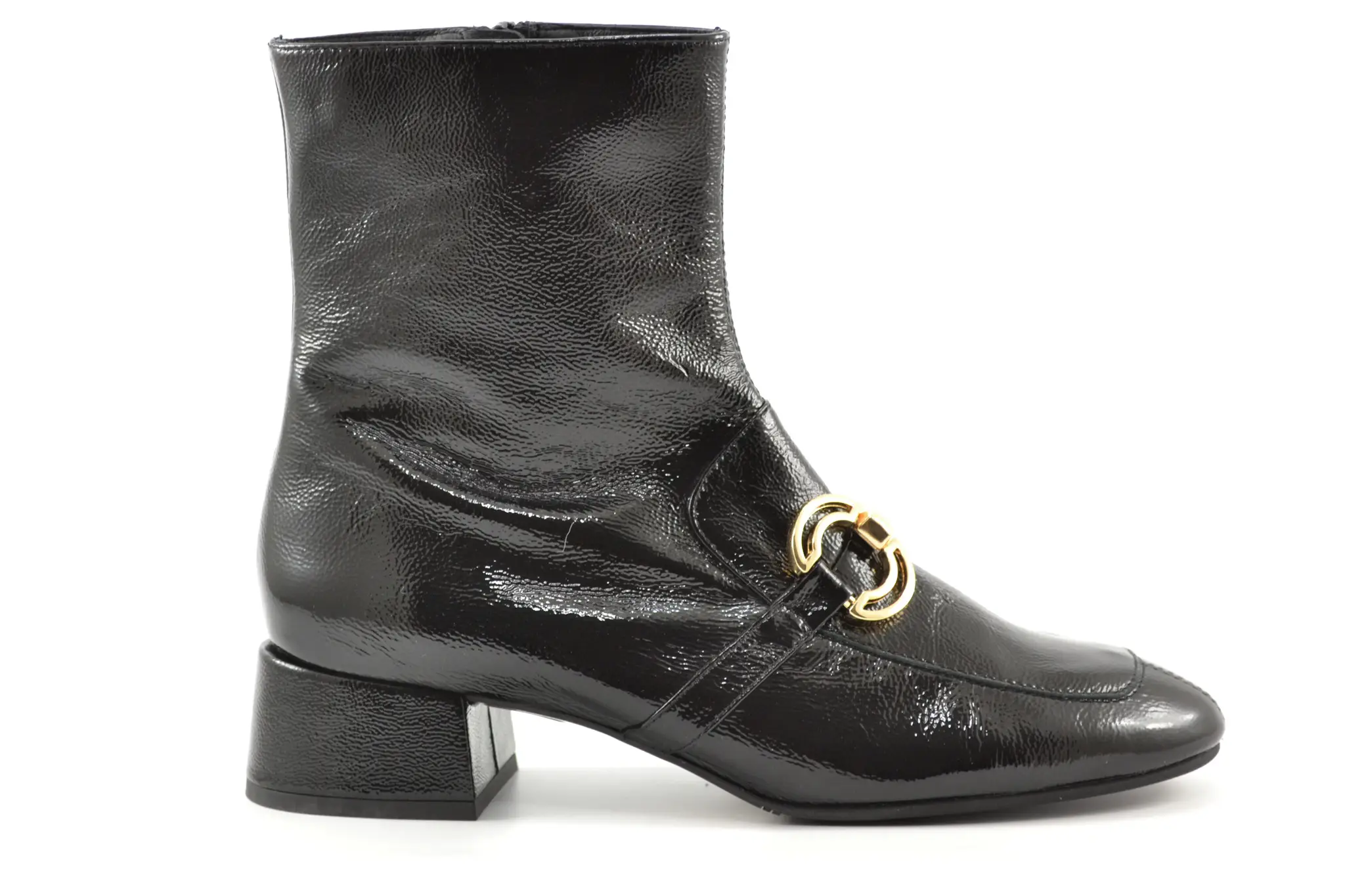 details: deze mooie zwarte lak enkellaas met hakje van Pedro Miralles heeft een mooi goudkleurig detail op de voorvoet.
