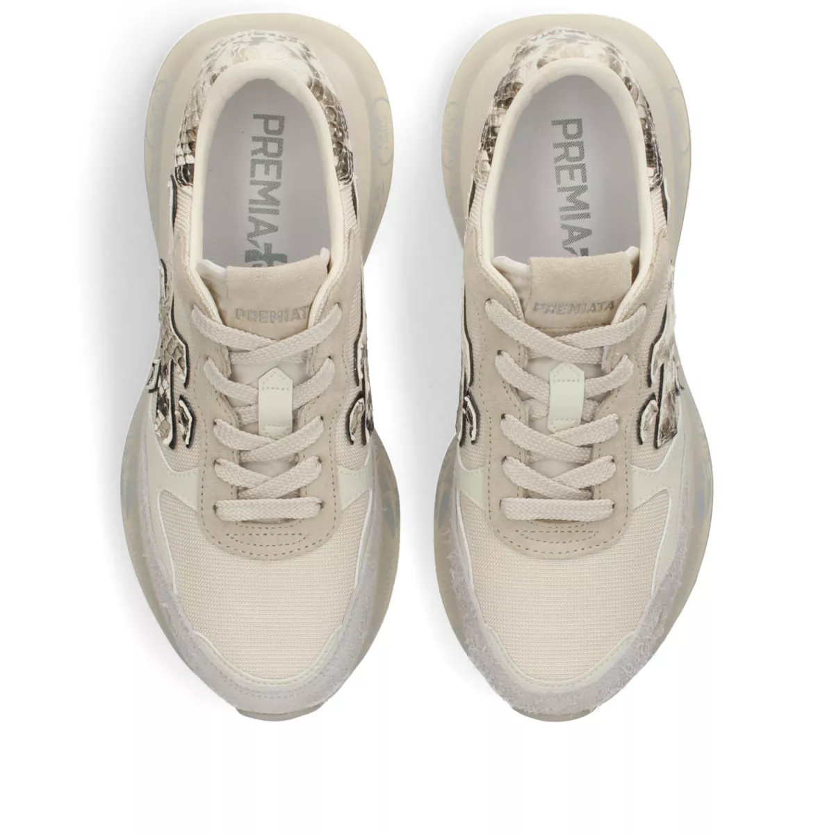 De Lauryn sneakers van het Italiaanse merk Premiata zijn gemaakt van een mix van hoogwaardige materialen en leer. De sneakers zijn uitgevoerd in de kleur creme en grijs voor een casual stijl. Het iconische silhouet is verrijkt met het bekende Premiata-logo.