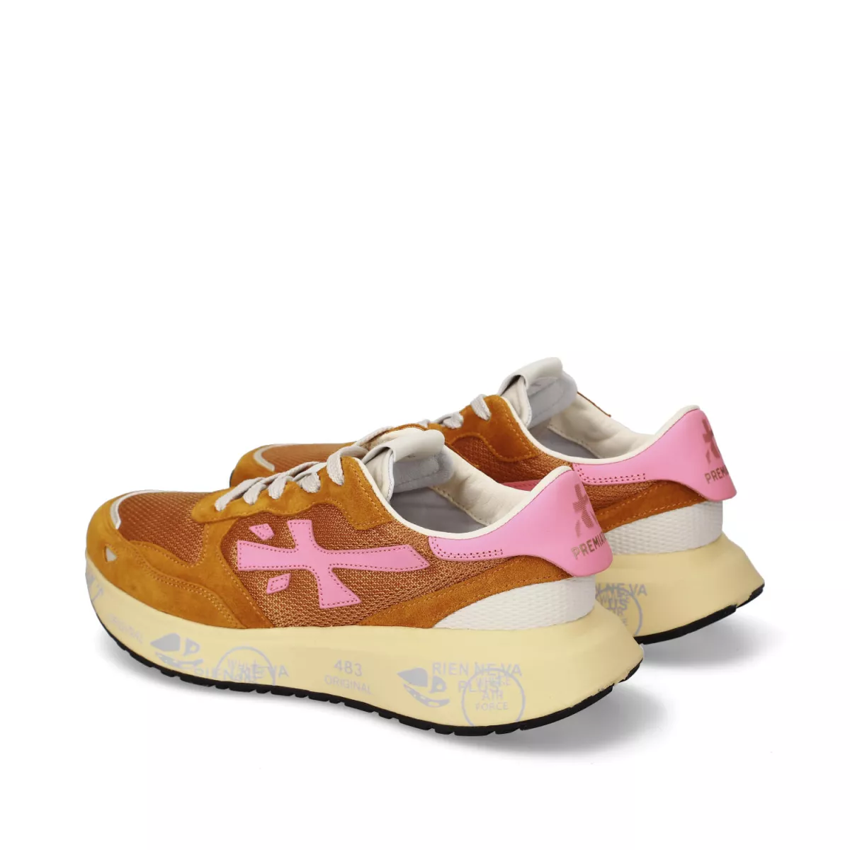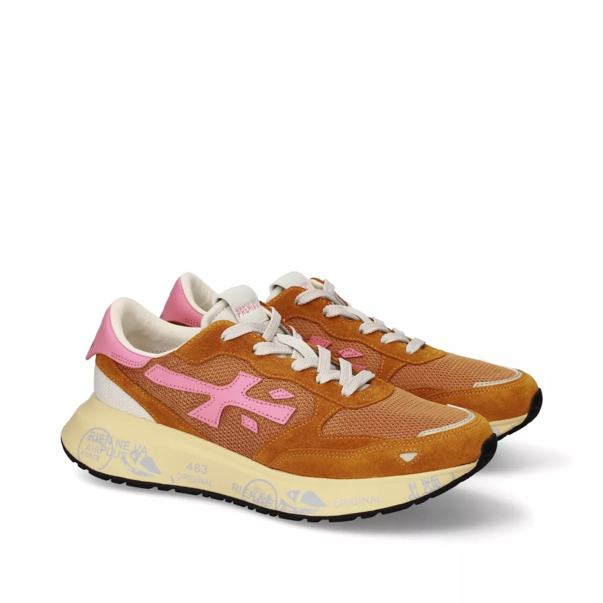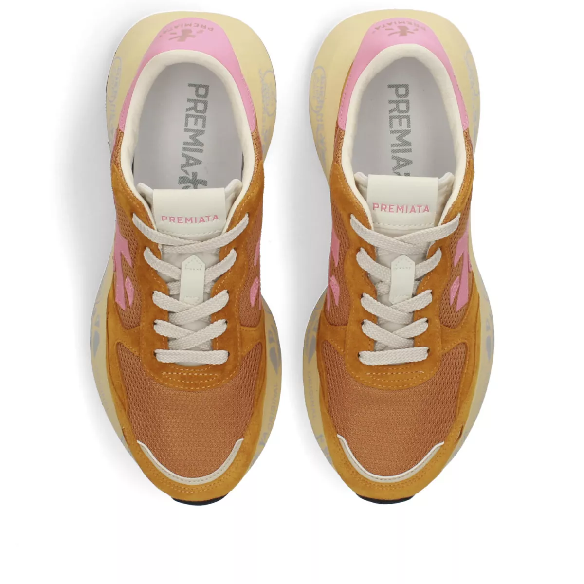 De Lauryn sneakers van het Italiaanse merk Premiata zijn gemaakt van een mix van hoogwaardige materialen en leer. De sneakers zijn uitgevoerd in de kleur okergeel en roze voor een casual stijl. Het iconische silhouet is verrijkt met hetbekende Premiata-logo.