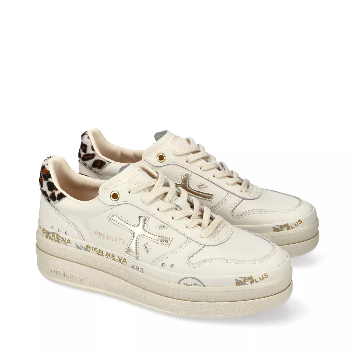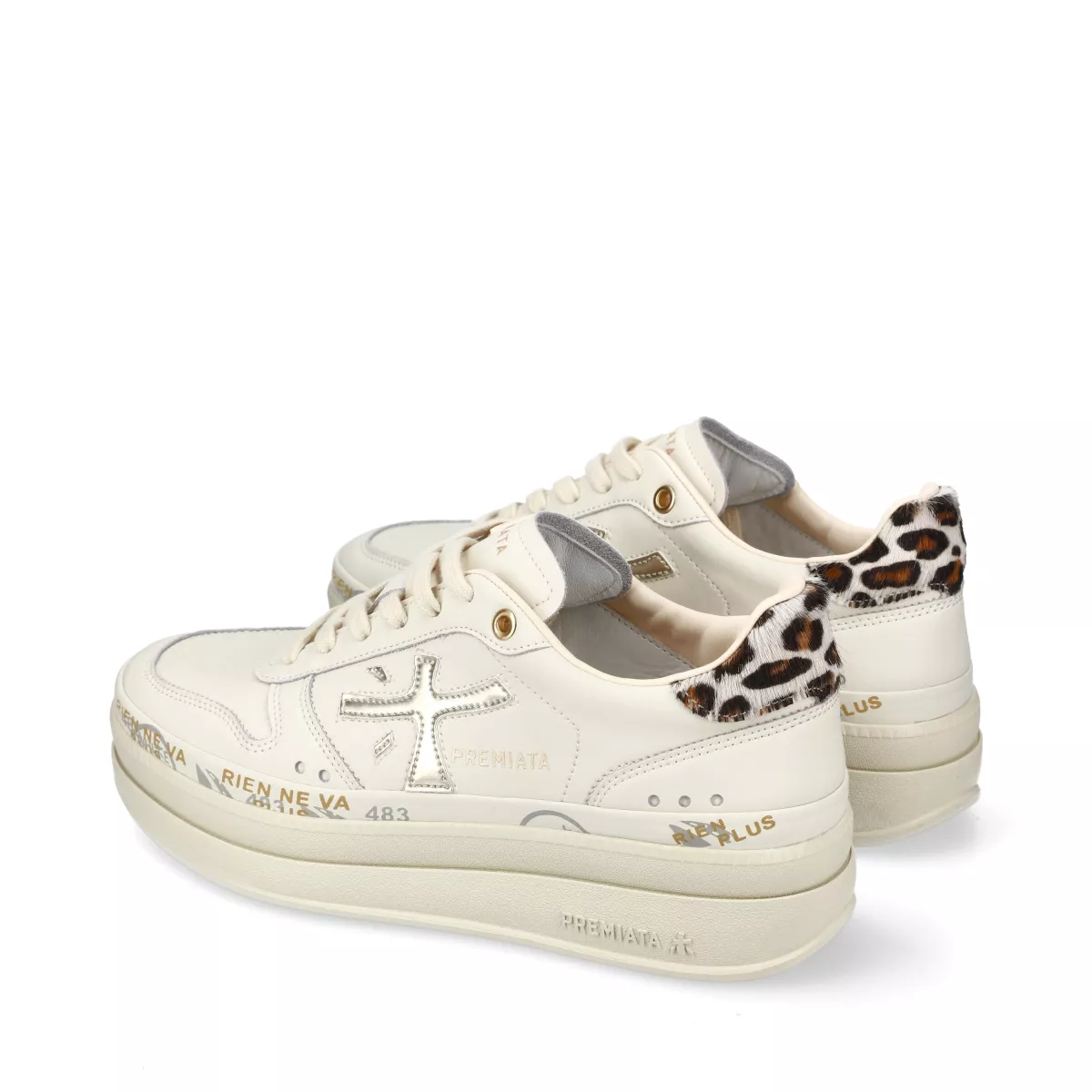 De exclusieve sneakers van het Italiaanse merk Premiata kenmerken zich door hun unieke uitstraling en door anders te zijn dan andere sneaker-merken. De unieke branding aan de zijkant van deze sneakers en de bedrukte zool zijn specifieke kenmerken van het merk Premiata. De Premiata Micol met zilverkleurige- en panteraccenten is afgewerkt met hoogwaardig leer.