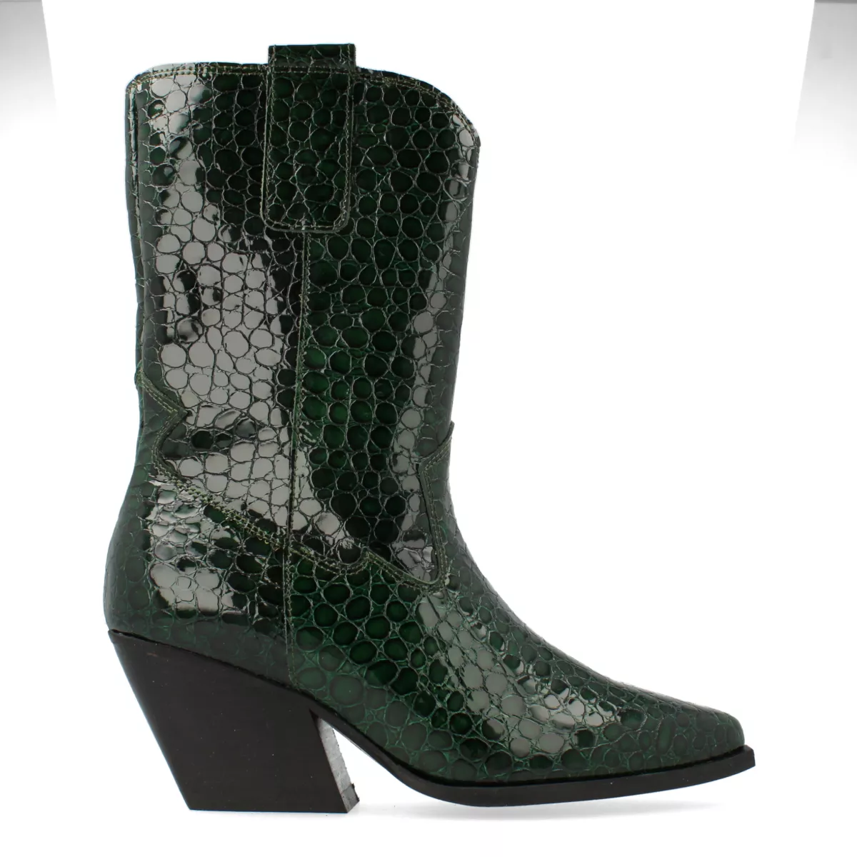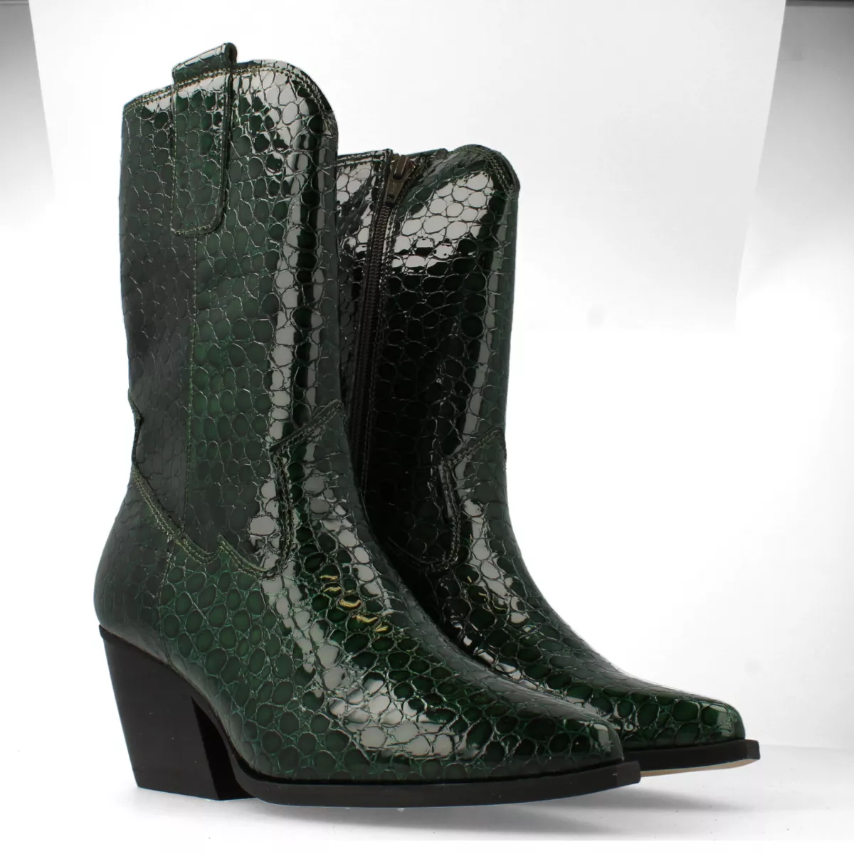 Classy en helemaal on trend! Deze stoere metallic boots kunnen echt niet missen in jouw collectie dit voorjaar. Ze zijn gemaakt van groen lak leer met een snakeprint en hebben een leren binnenvoering. De laarsjes hebben een hakhoogte van 7 cm. De schachthoogte is 21 cm en de schachtomtrek meet 28 cm.