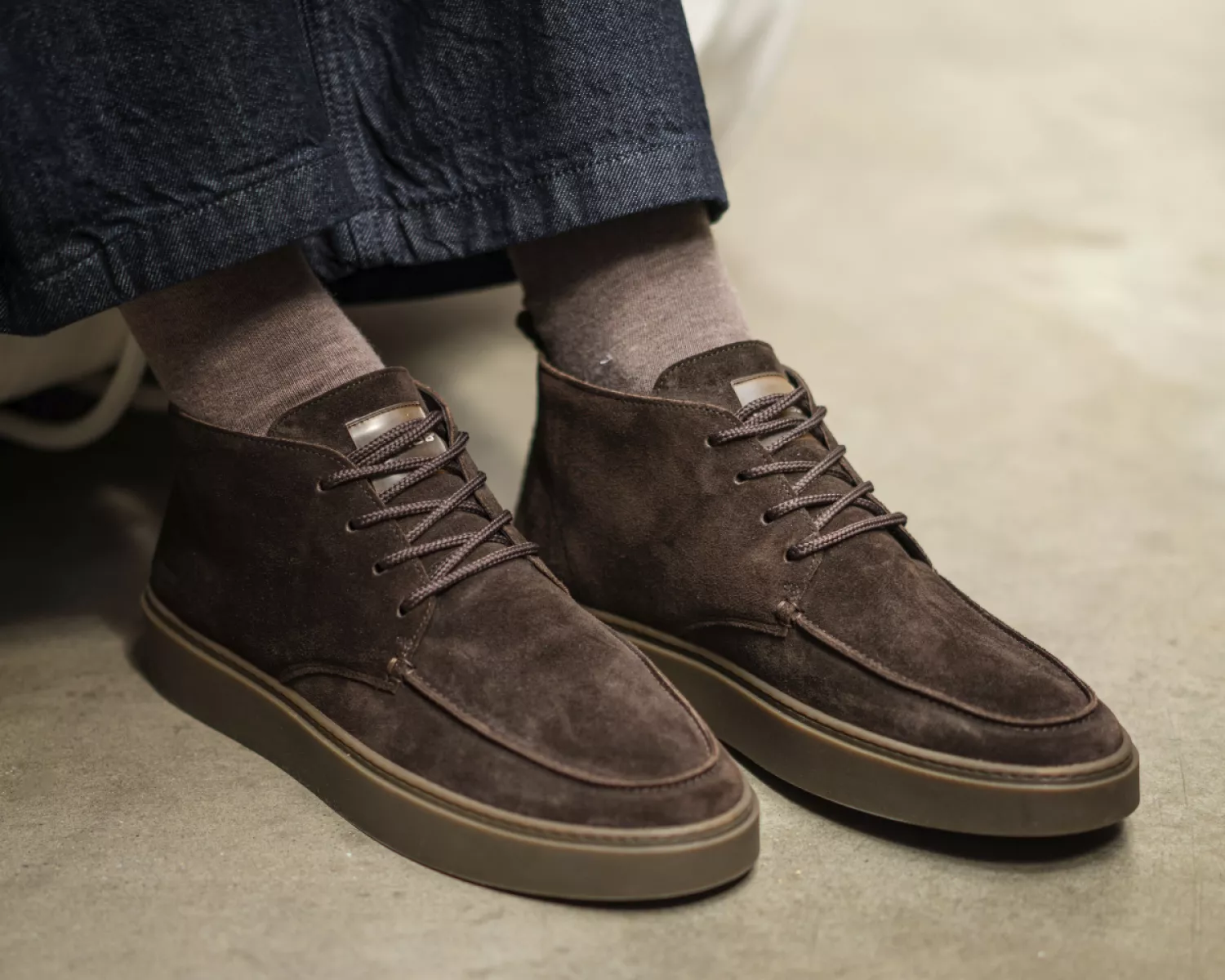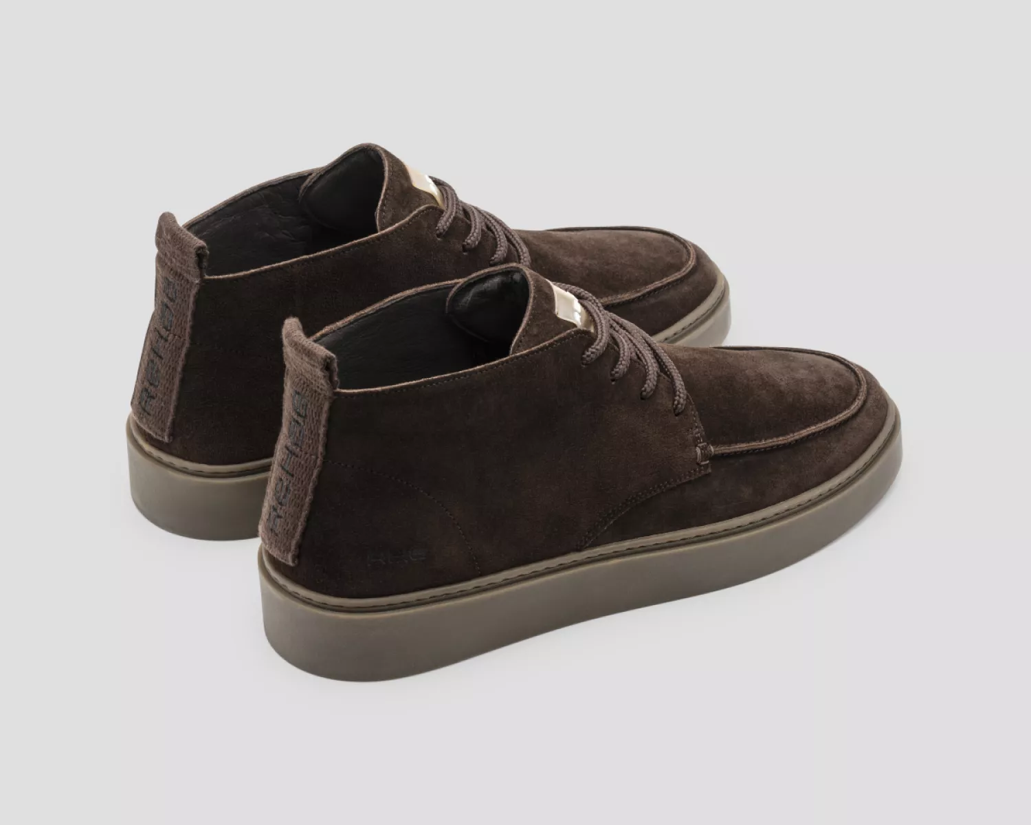 Donkerbruine halfhoge sneaker van Italiaans suède met spiegelneus en beige zool. Tijdloos ontwerp met casual klasse.