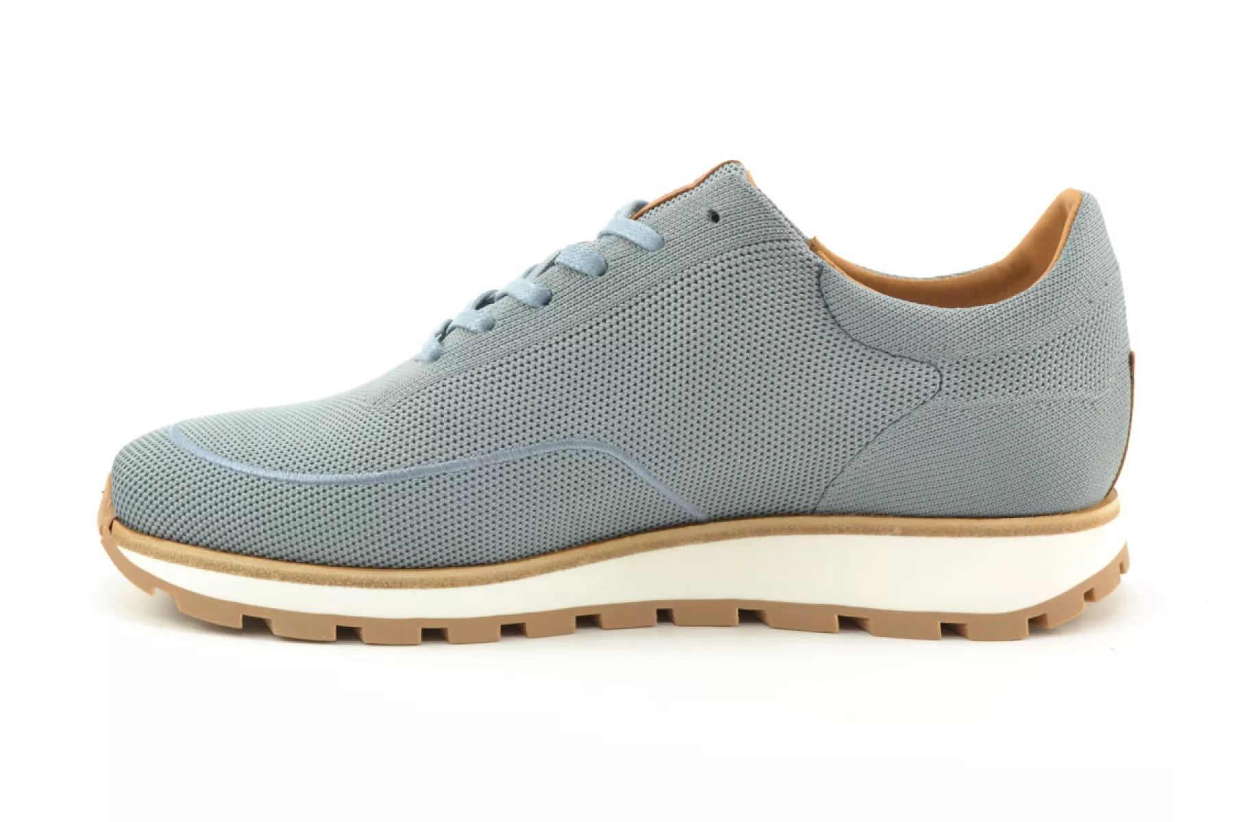 Stijlvolle lage herensneaker uitgevoerd met een premium lichtblauw knitwear upper, een lichtgewicht runner zool en lichtbruine leren details. Combineer de Mason eenvoudig onder een mooie chino of jeans.