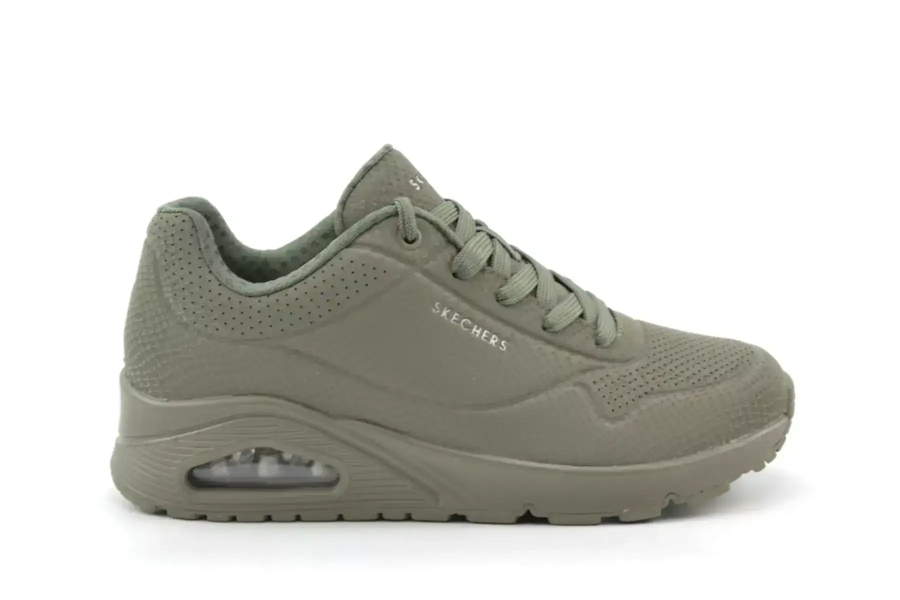 Geef iedereen het nakijken in een opvallende stijl met de Skechers Street Uno – Shiny Scale. Dit trendy vetermodel heeft een bovenwerk van durabuck met een reflecterende slangenprint op een gewatteerde Skechers Air-Cooled Memory Foam- binnenzool en een Skech-Air-tussenzool met zichtbare airunit.