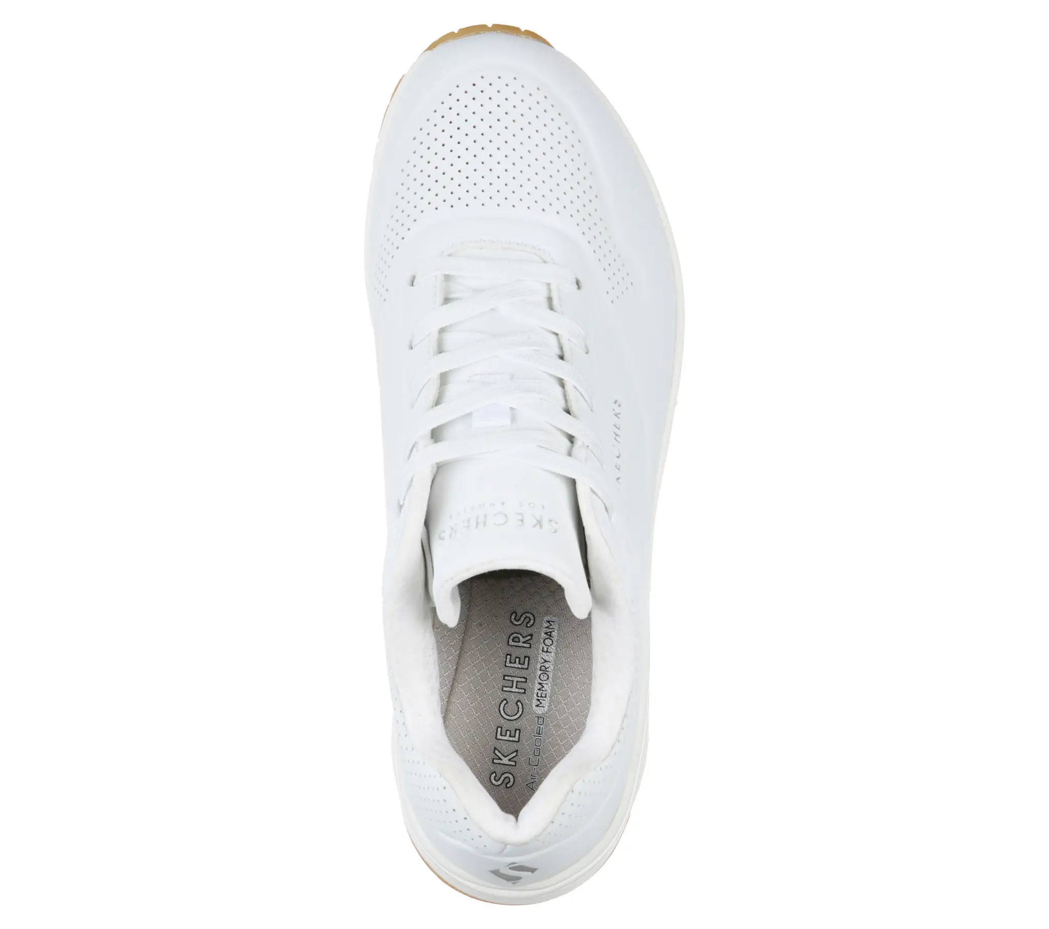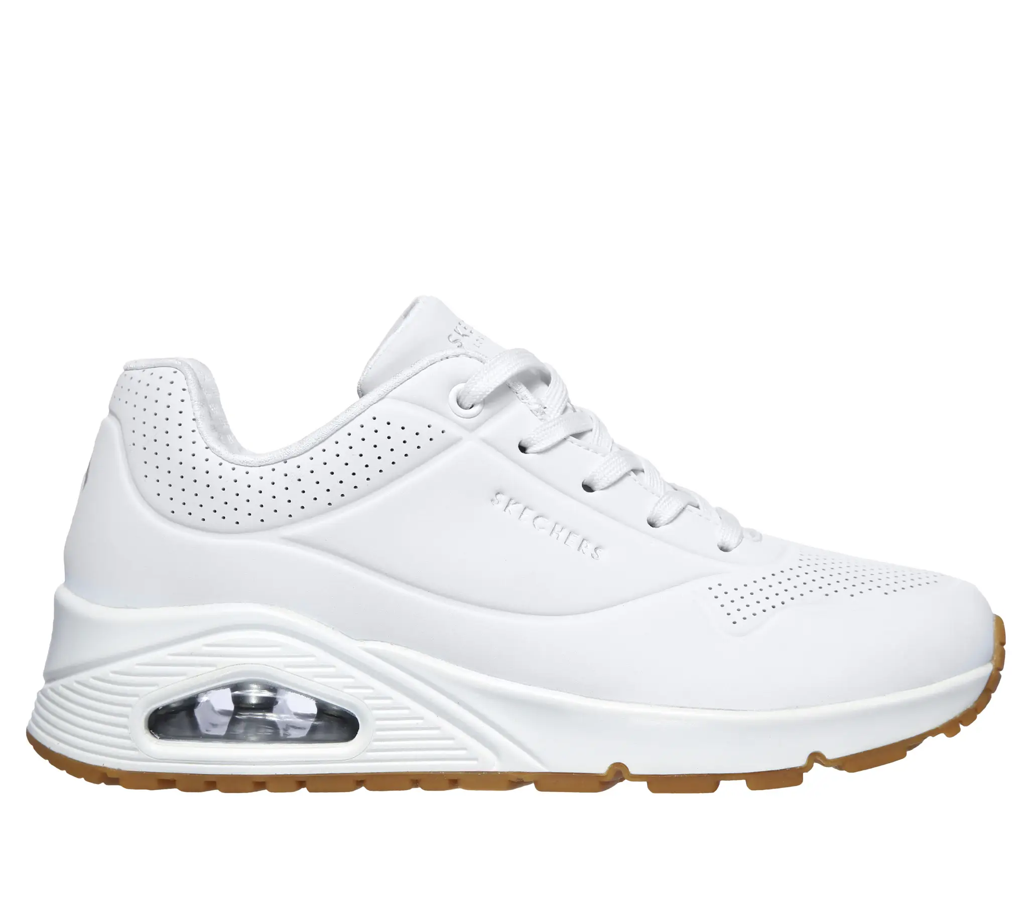 Klassiek luchtgedempt comfort krijgt een frisse update in de Skechers Street™ Uno – Stand on Air. Deze trendy veterschoen heeft een soepele bovenkant van geperforeerd synthetisch materiaal met een binnenzool van Air Cooled Memory Foam en een zichtbare luchtgedempte Skech-Air-tussenzool.
