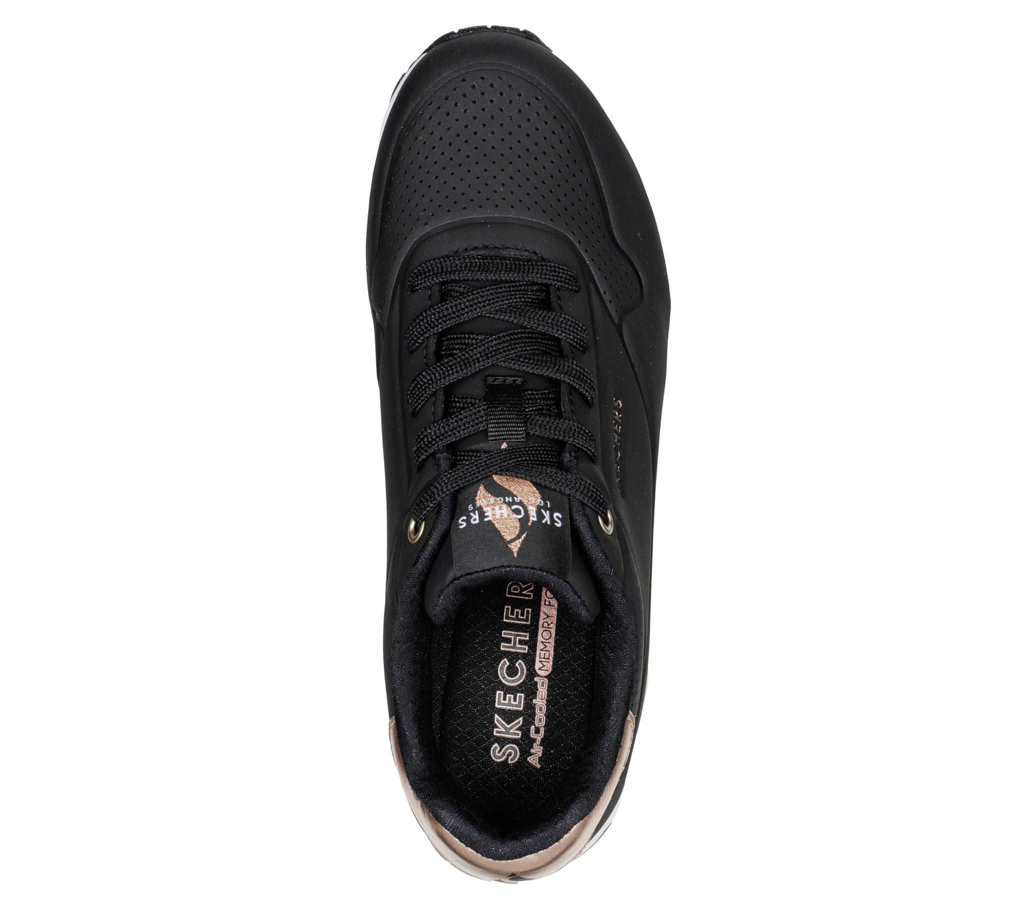 Ga voor goud en geef je stijl een boost met Skechers Street Uno Golden air. Deze hippe schoen met veters heeft een soepele bovenkant met gouden accenten, een comfortabel gewatteerde Skechers Air Cooled Memory Foam binnenzool en een zichtbare Skech-Air tussenzool met air-unit.