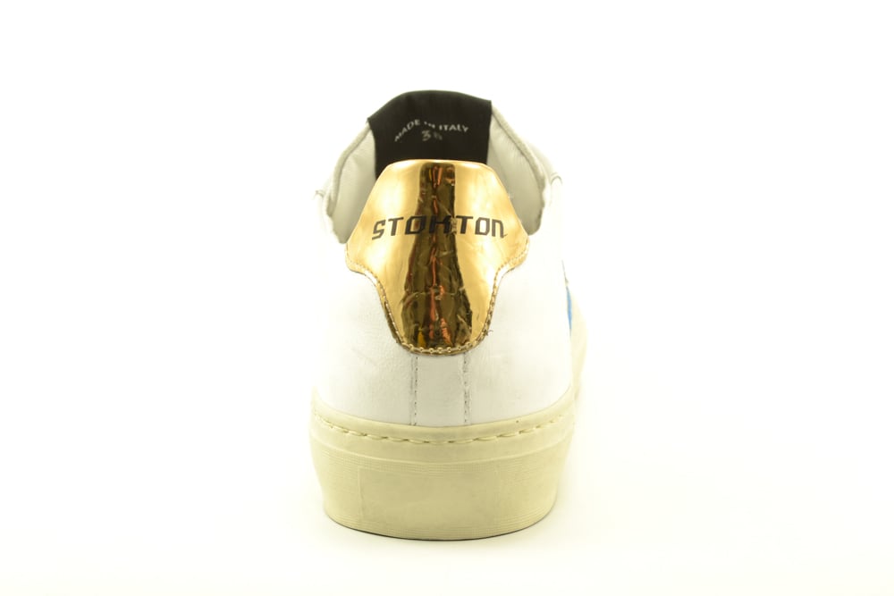 details: wat een mooie sneaker heeft het luxe merk Stokton weer gemaakt! Deze wit leren sneaker is voorzien van een kobalt-glitter bliksemflits op de zijkant. Op de hiel zit een metallic leren goudkleurig detail. Het logo van Stokton vindt je op de tong en hiel.