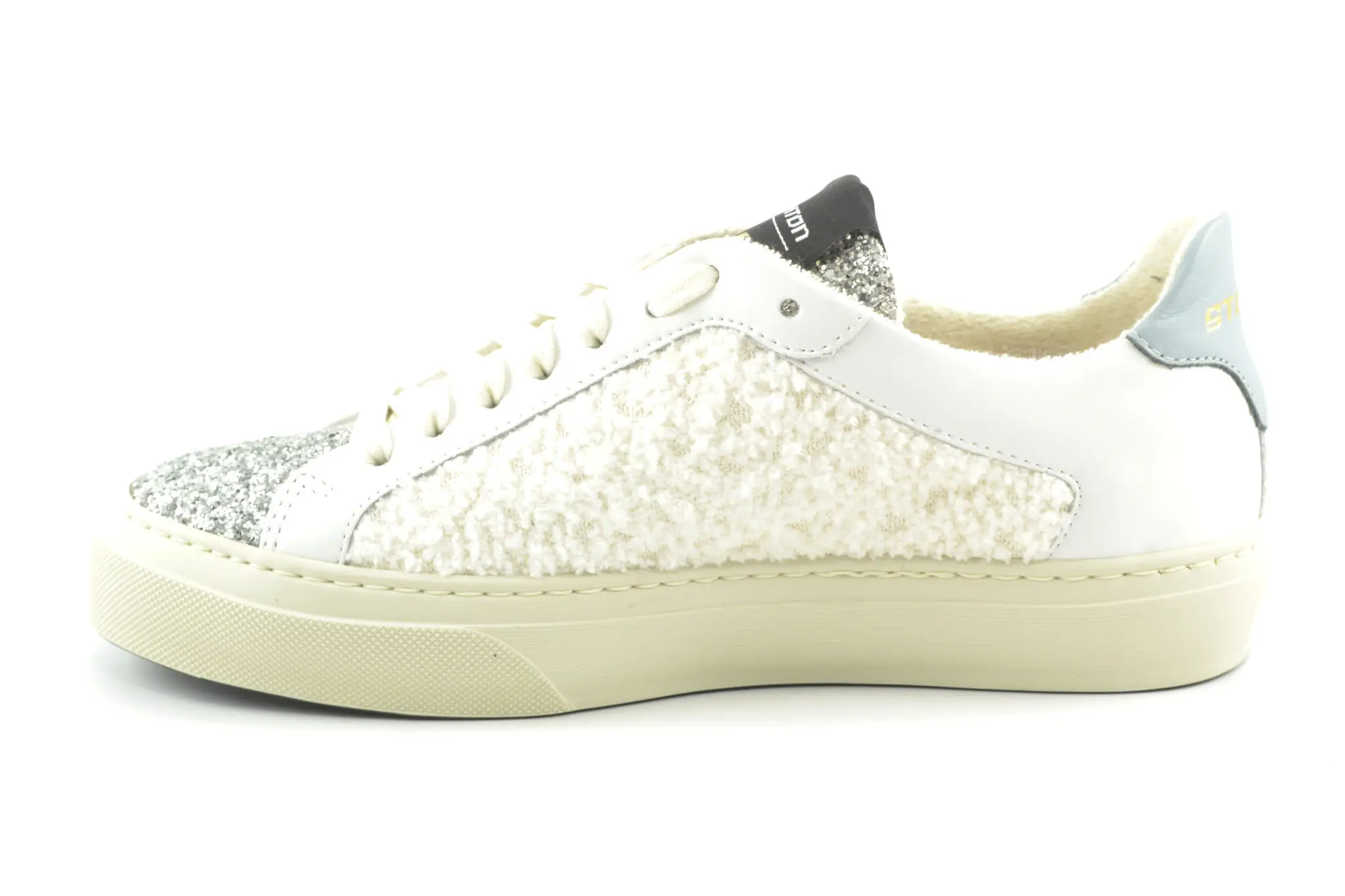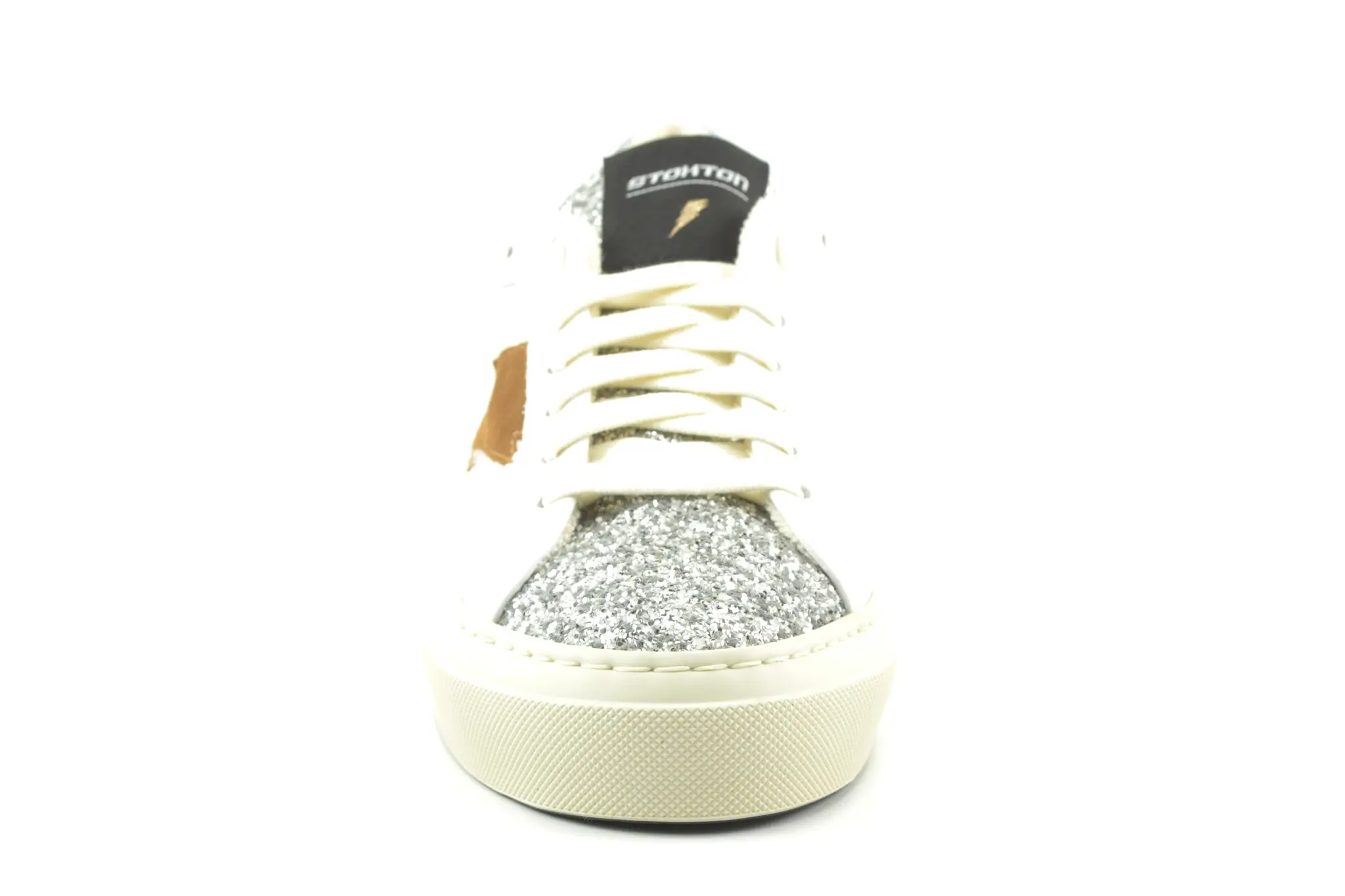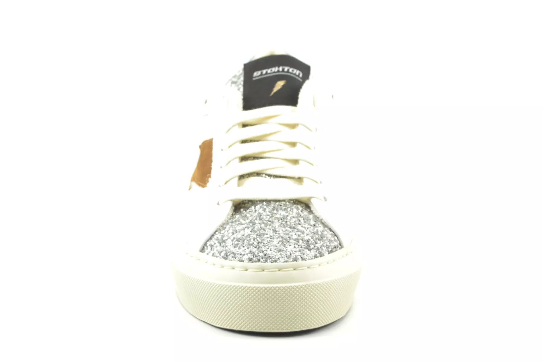 Het Italiaanse merk Stokton maakt gebruik van luxe materialen. Deze mooie luxe damessneaker is daar een voorbeeld van. Deze sneaker met kuipzool van het Italiaanse merk Stokton heeft een bruin suede detail op de zijkant en zilverkleurige glitters op de tong en neus. De sneaker is afgewerkt met een logo op de tong en hiel. Deze sneaker valt groot uit. Twijfel je over de maat? Neem dan een maat kleiner.